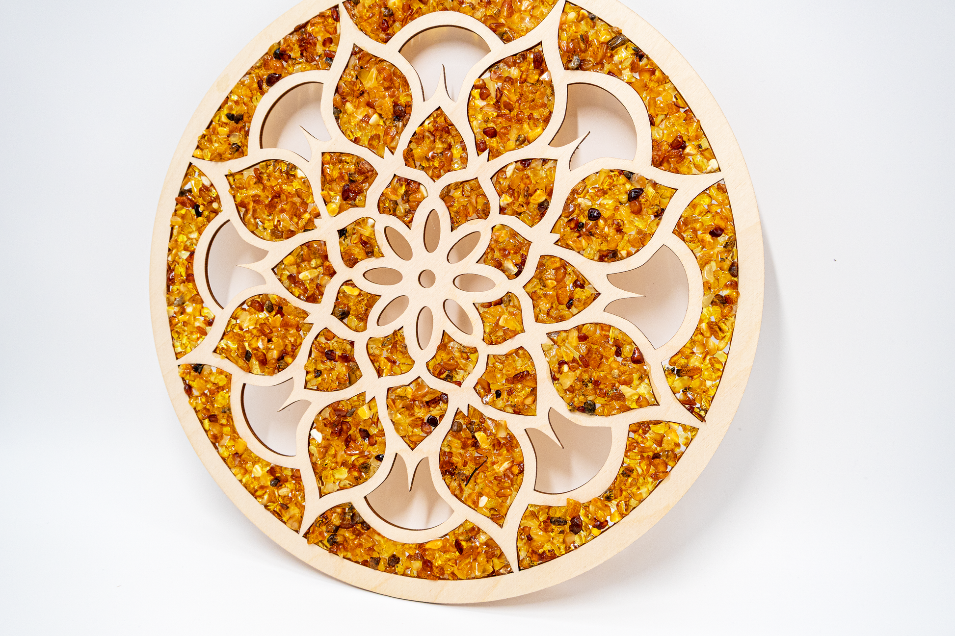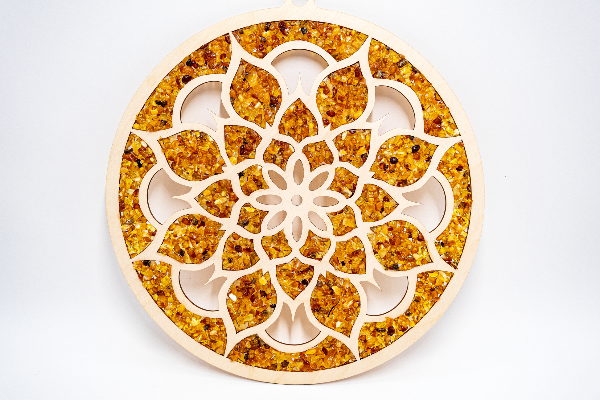 This round wall picture with a lotus flower is a real eye-catcher for any home. The delicate wooden structure is artfully filled with genuine amber chips – a harmonious interplay of nature and design. The warm amber brings a special energy to the room. With a diameter of 30 cm, the picture is perfect as a wall decoration or window hanging. Whether hung from a string or a hook – this handcrafted amber picture is a stylish yet spiritual gift for special people.