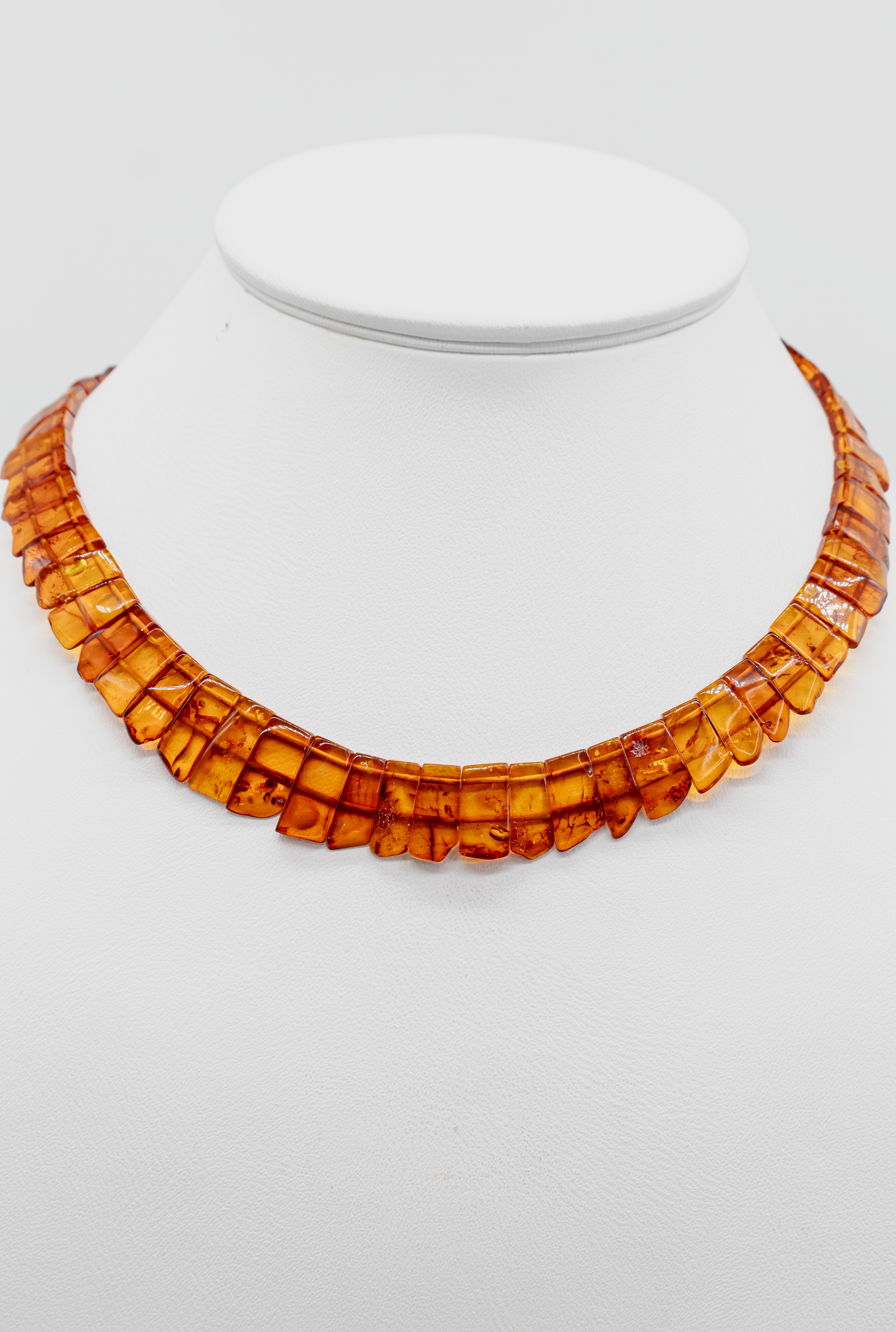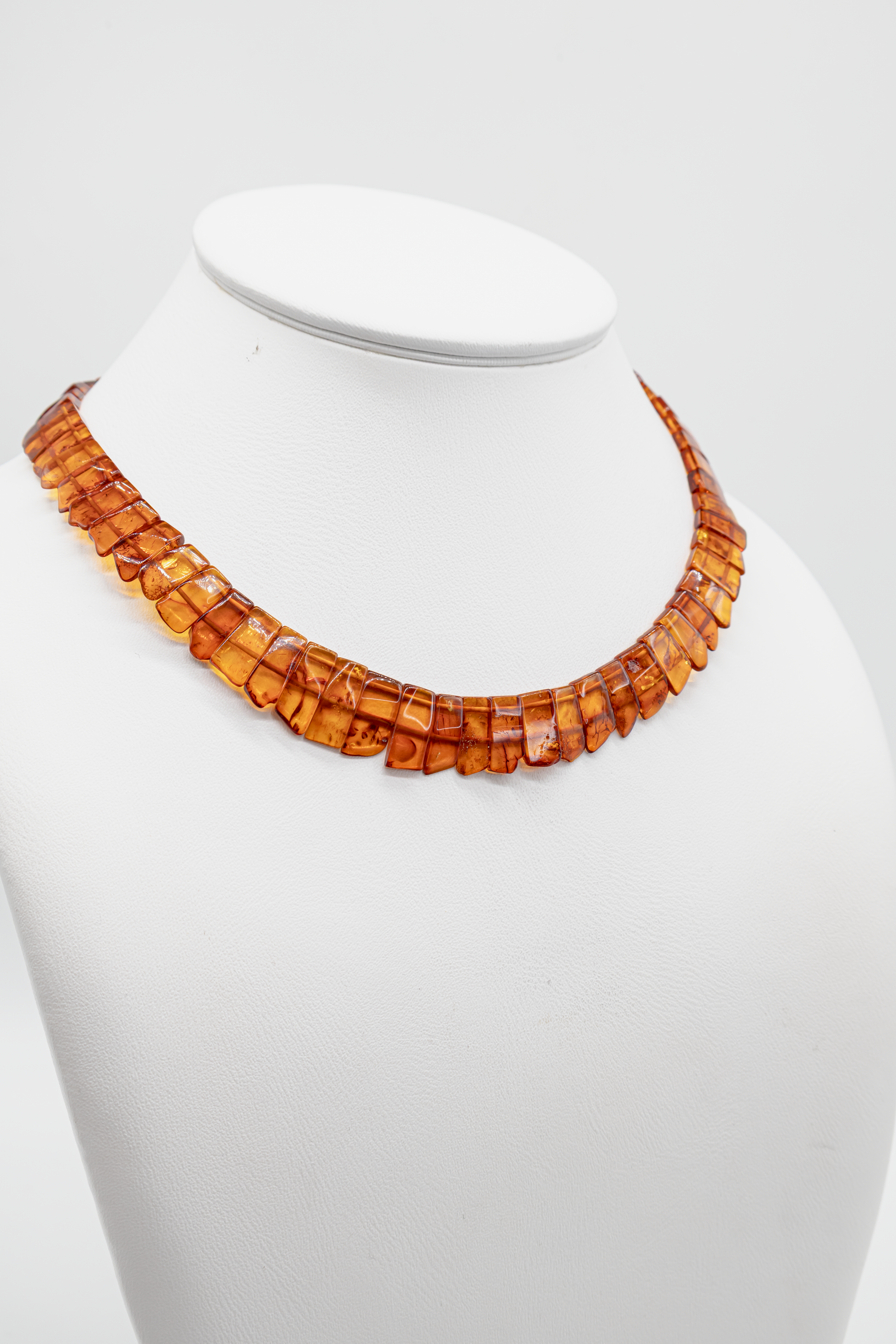 Der warme, goldene Bernsteinton wirkt besonders hochwertig und lässt das Schmuckstück sowohl im Alltag als auch zu besonderen Anlässen strahlen. Mit einer Länge von ca. 40 cm und einer Breite von etwa 1,7 cm liegt das Collier perfekt am Hals an und sorgt für ein elegantes Erscheinungsbild.