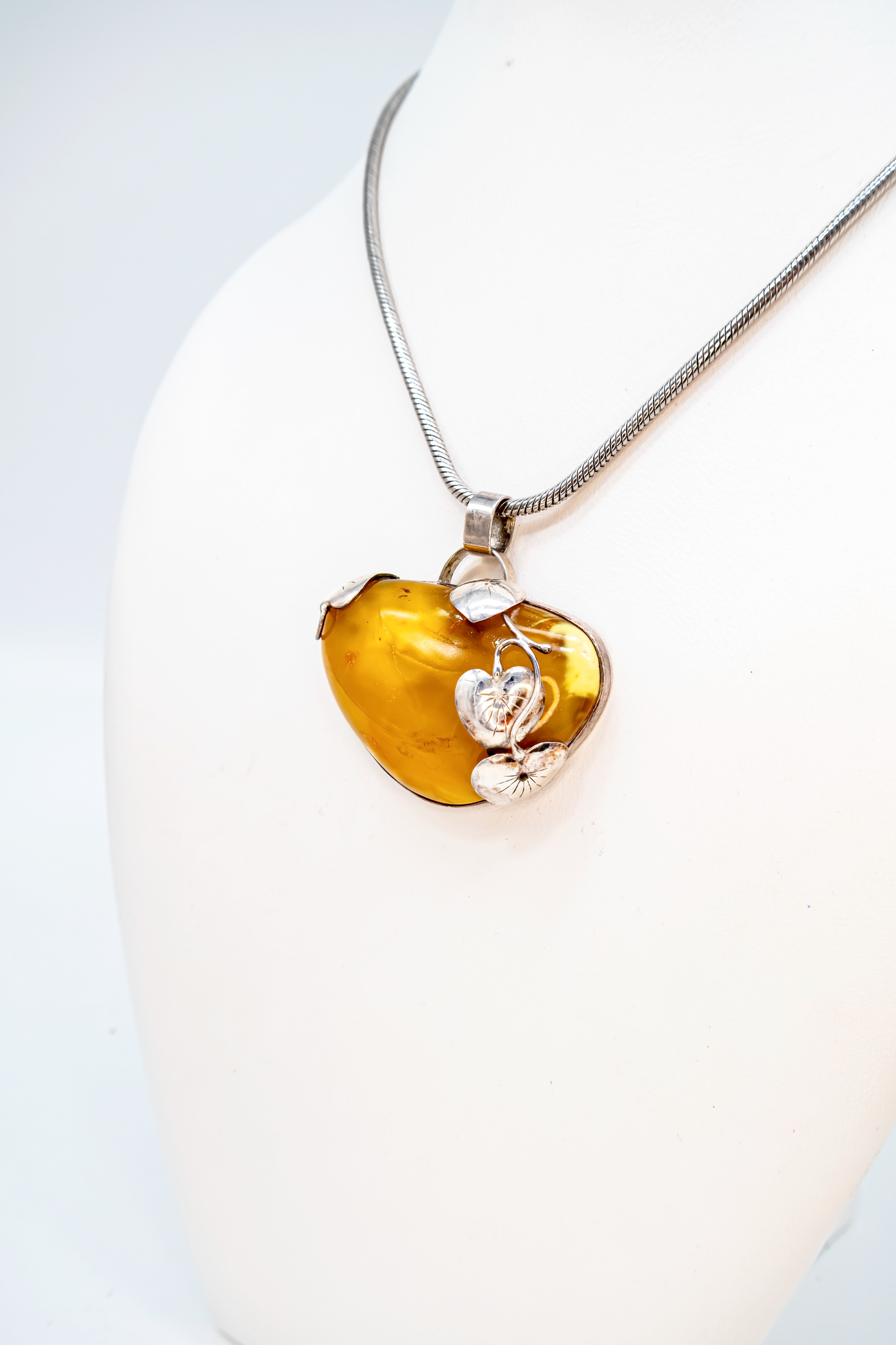 A unique, handcrafted piece with ornate silver decoration and a large, honey-colored amber.