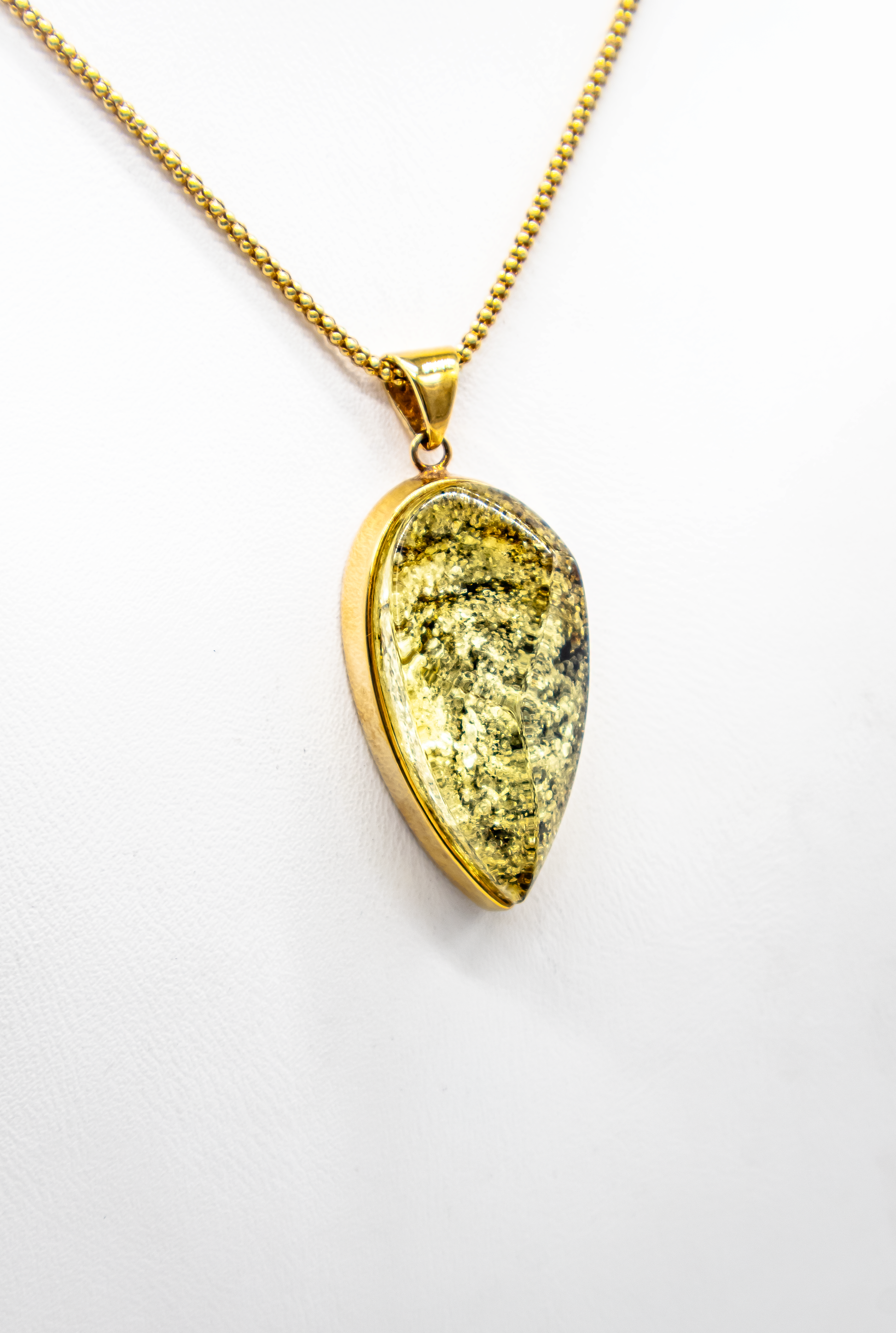 Der hellgrüne Bernstein erzeugt ein klares, leuchtendes Farbspiel, das jeden Anhänger einzigartig macht.