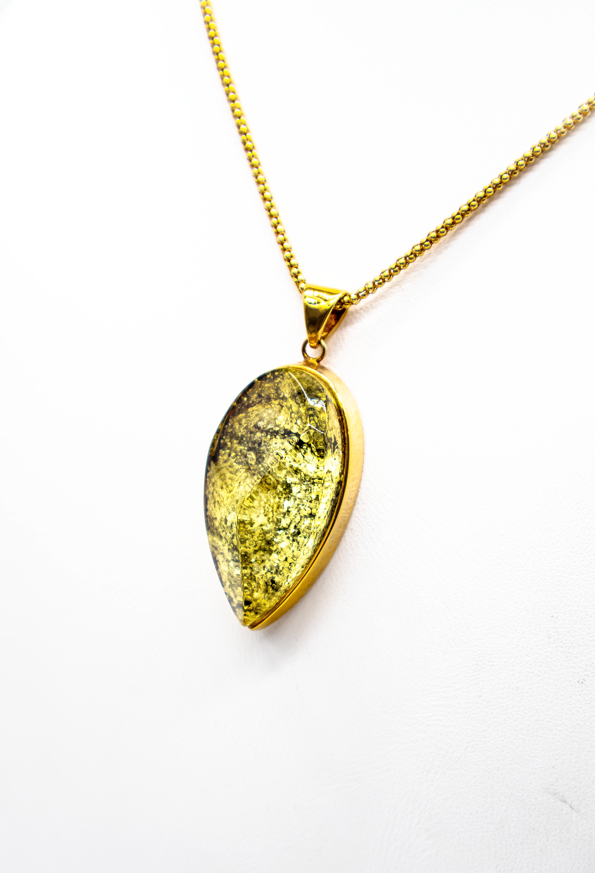 Dieser elegante Anhänger begeistert mit seinem hellgrünen Bernstein, der durch seine feinen, lichtreflektierenden Strukturen einen außergewöhnlich edlen Glanz erzeugt. Die tropfenförmige Silhouette verleiht dem Schmuckstück eine feminine und zugleich moderne Ausstrahlung. Gefasst ist der Bernstein in hochwertigem 24-Karat vergoldetem 925er Sterlingsilber mit zweischichtiger Premium-Vergoldung, die für warmen Goldglanz und besondere Haltbarkeit sorgt. Mit seiner Größe von 6 cm wirkt dieser Anhänger präsent und luxuriös – perfekt für besondere Anlässe oder als exklusives Geschenk. Ein einzigartiges Einzelstück für Liebhaberinnen von edlen, hochwertigen Naturmaterialien.