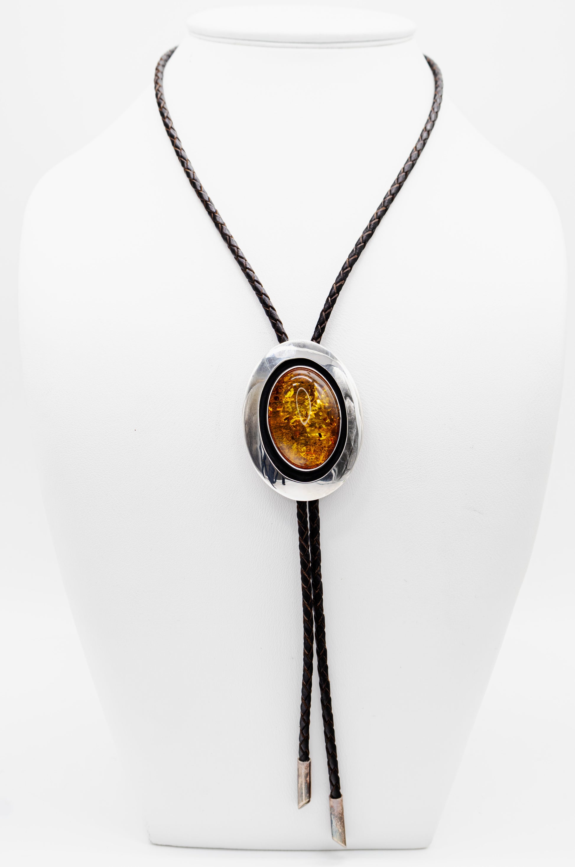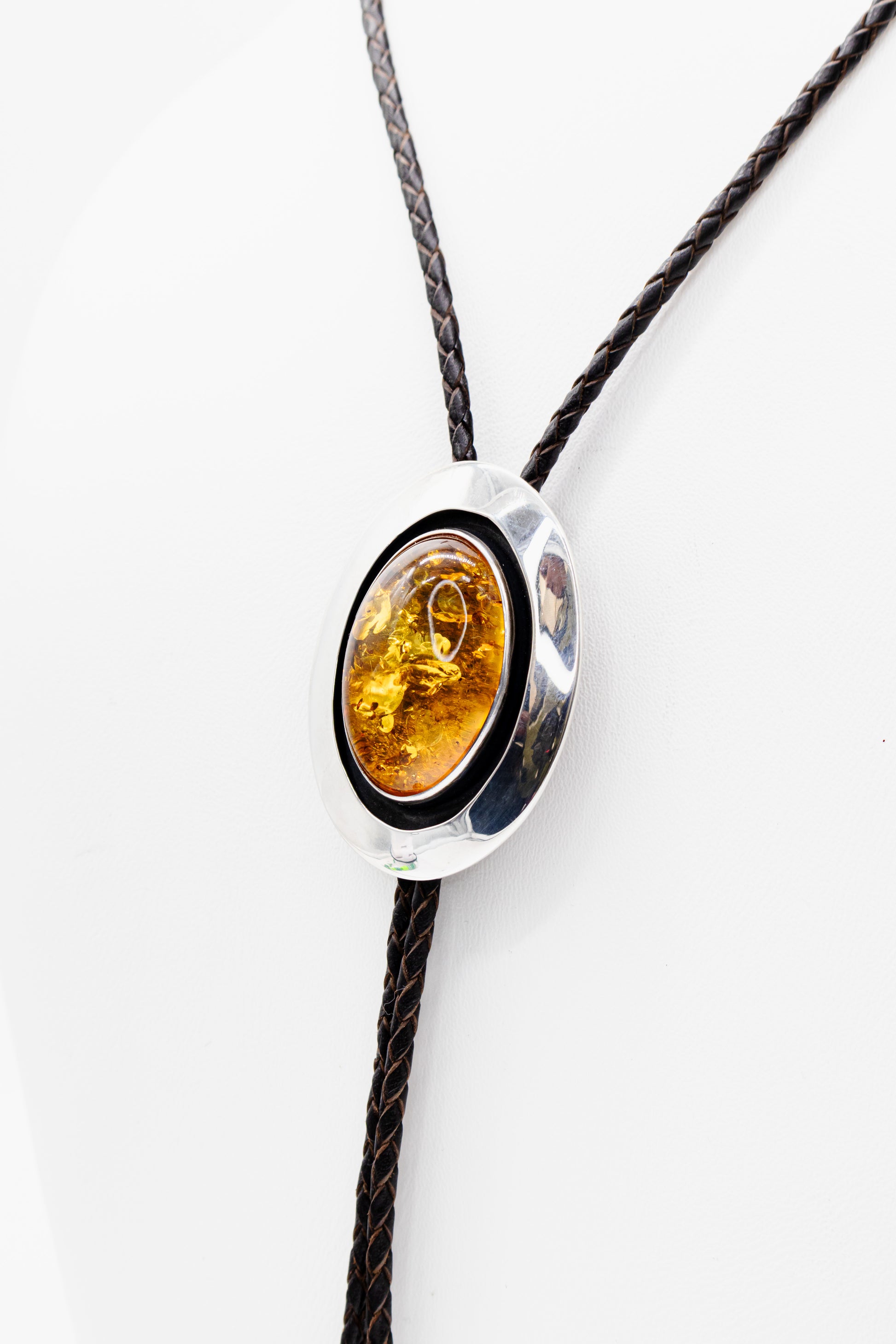 This exceptional amber pendant in 925 sterling silver impresses with its modern, masculine design and its high level of everyday wearability. The warm, luminous amber stands in striking contrast to the cool silver frame and the dark brown, braided leather cord .