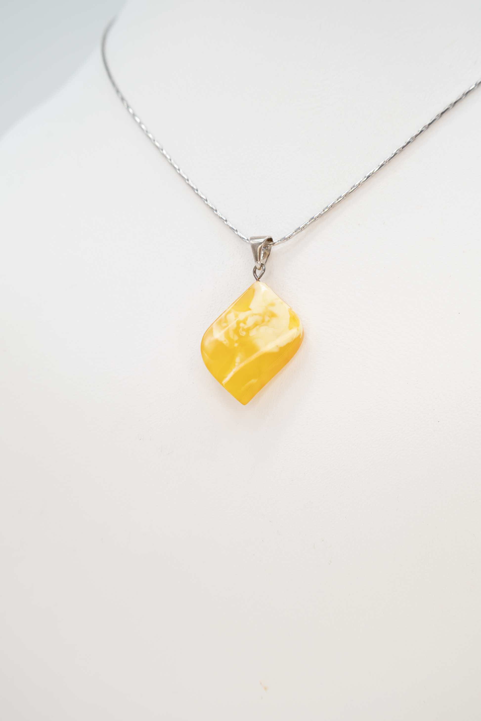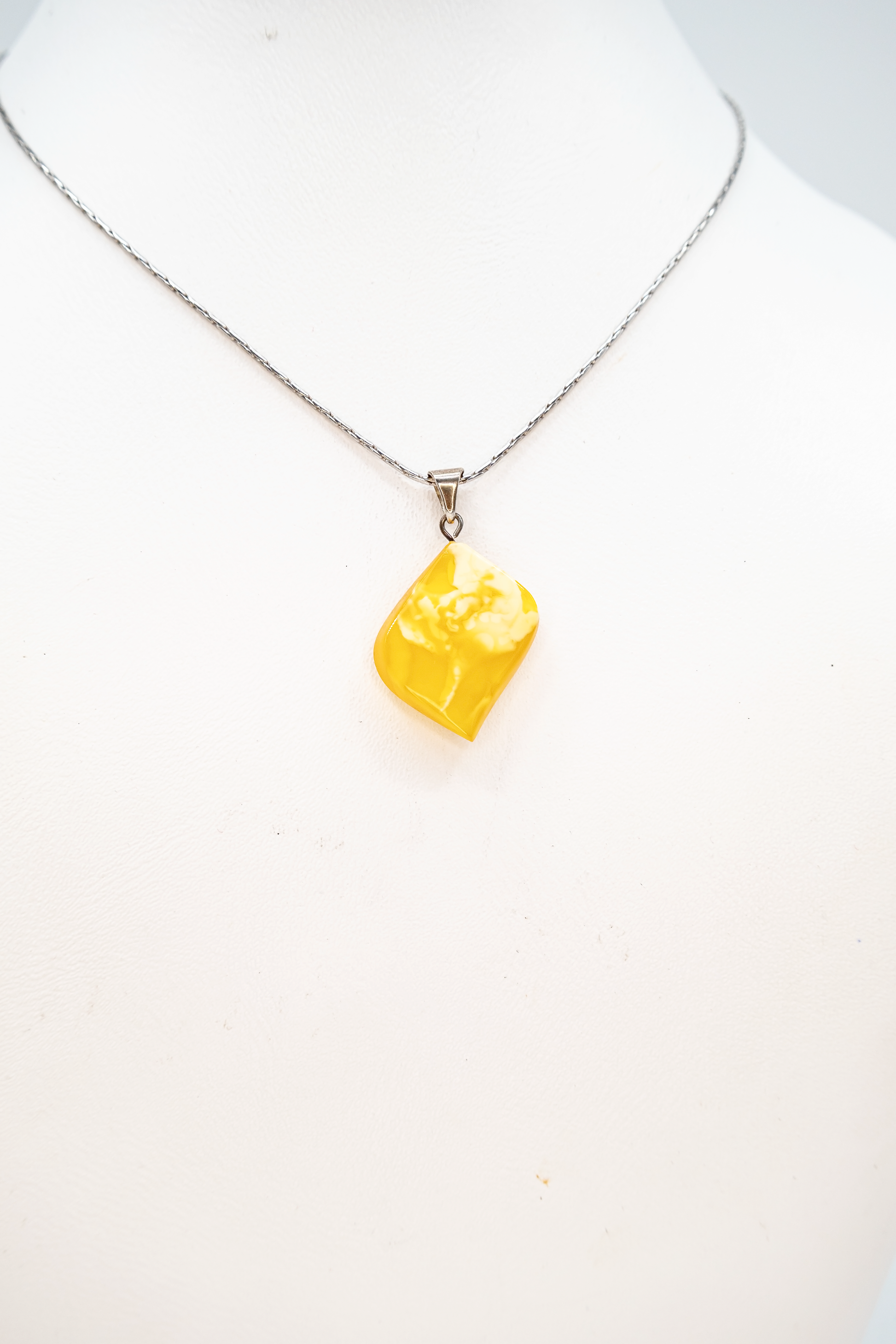 This amber pendant combines understated elegance with a unique design. The warm yellow amber has a characteristic grain and measures approximately 3.7 × 2.4 × 1.3 cm. Set in a simple silver frame, the natural beauty of the amber is particularly emphasized. Crafted from genuine amber and high-quality 925 sterling silver, each pendant is handcrafted and unique. Thanks to its compact size, it is comfortable to wear both everyday and on special occasions. The unisex design makes it versatile—for both men and women. A stylish piece of jewelry that also makes an excellent gift for a wife, sister, girlfriend, or partner, combining timeless elegance with naturalness.