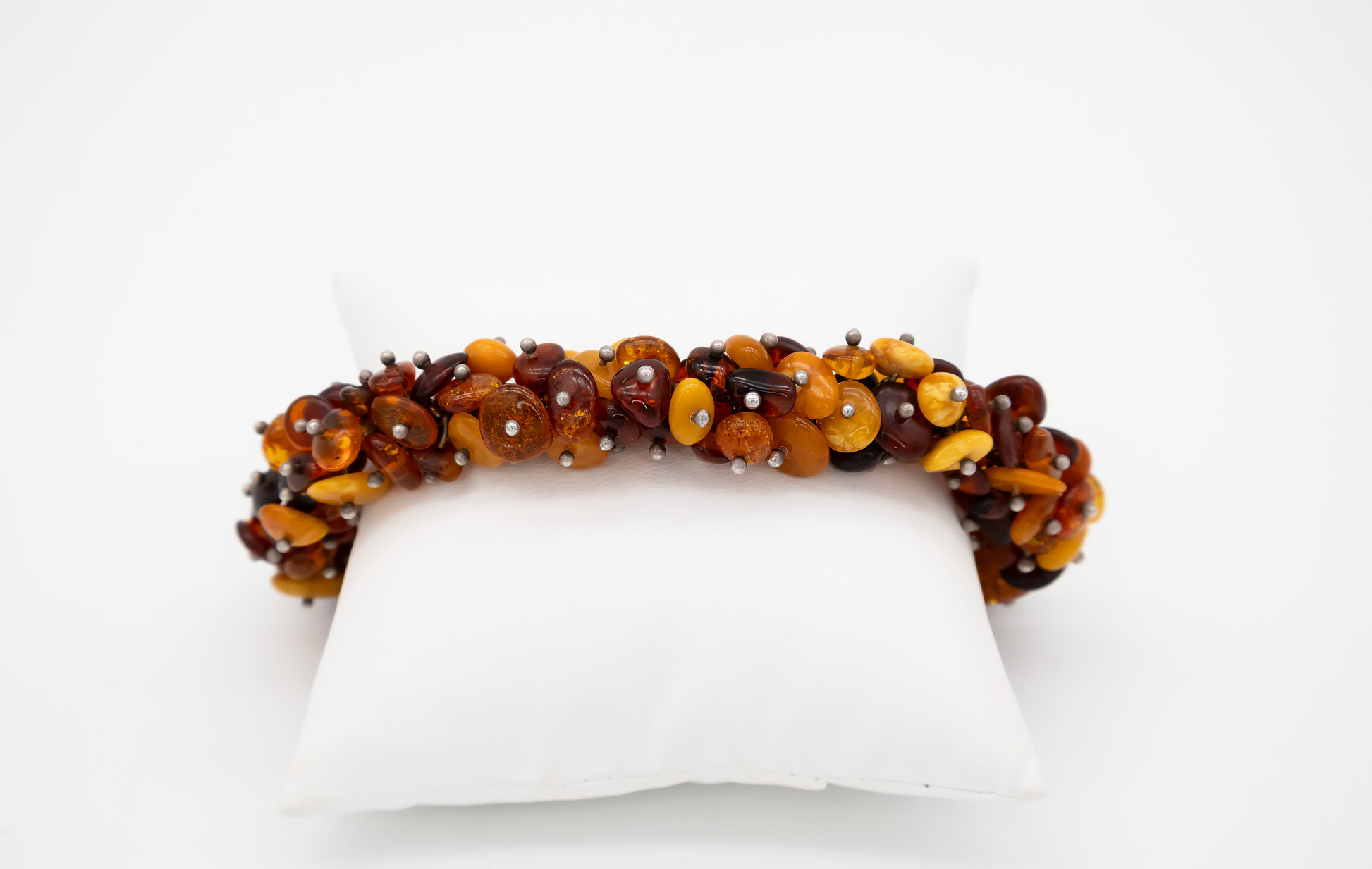 This handmade amber bracelet is a unique piece of jewelry, captivating with its artistic craftsmanship and the warm color palette of the amber. The stones, in various shades of brown, honey, and yellow, were carefully selected and crafted into an extraordinary design.