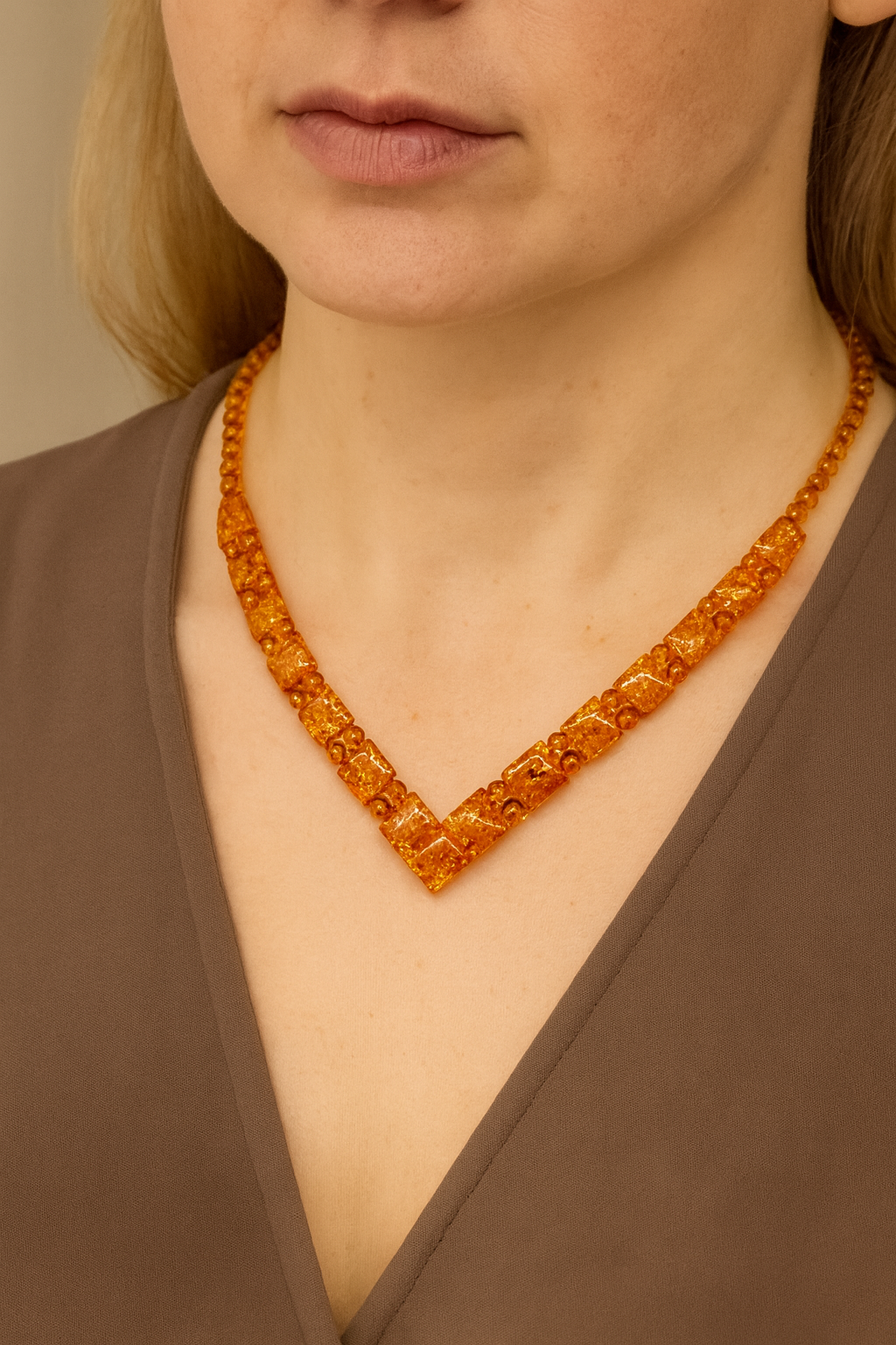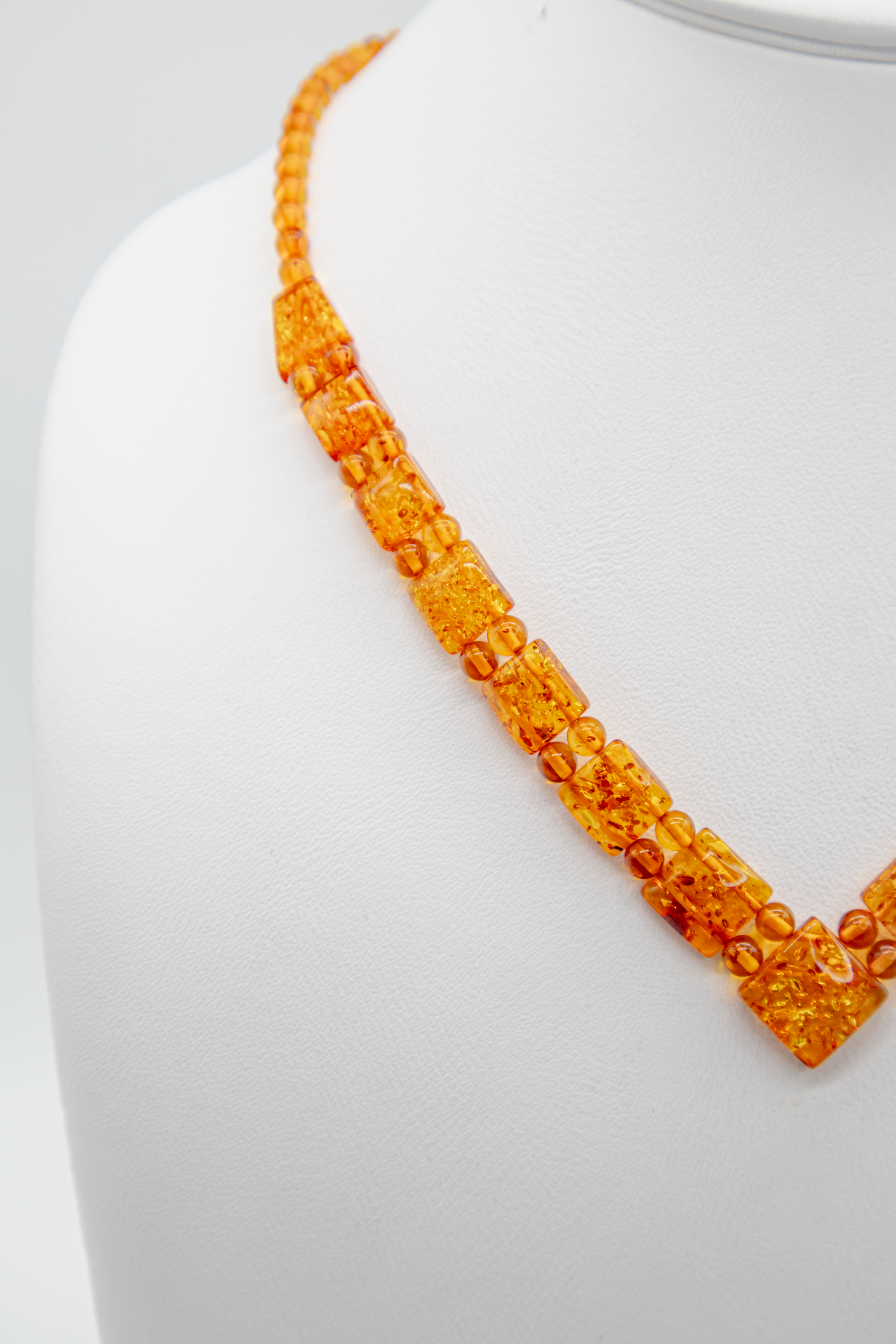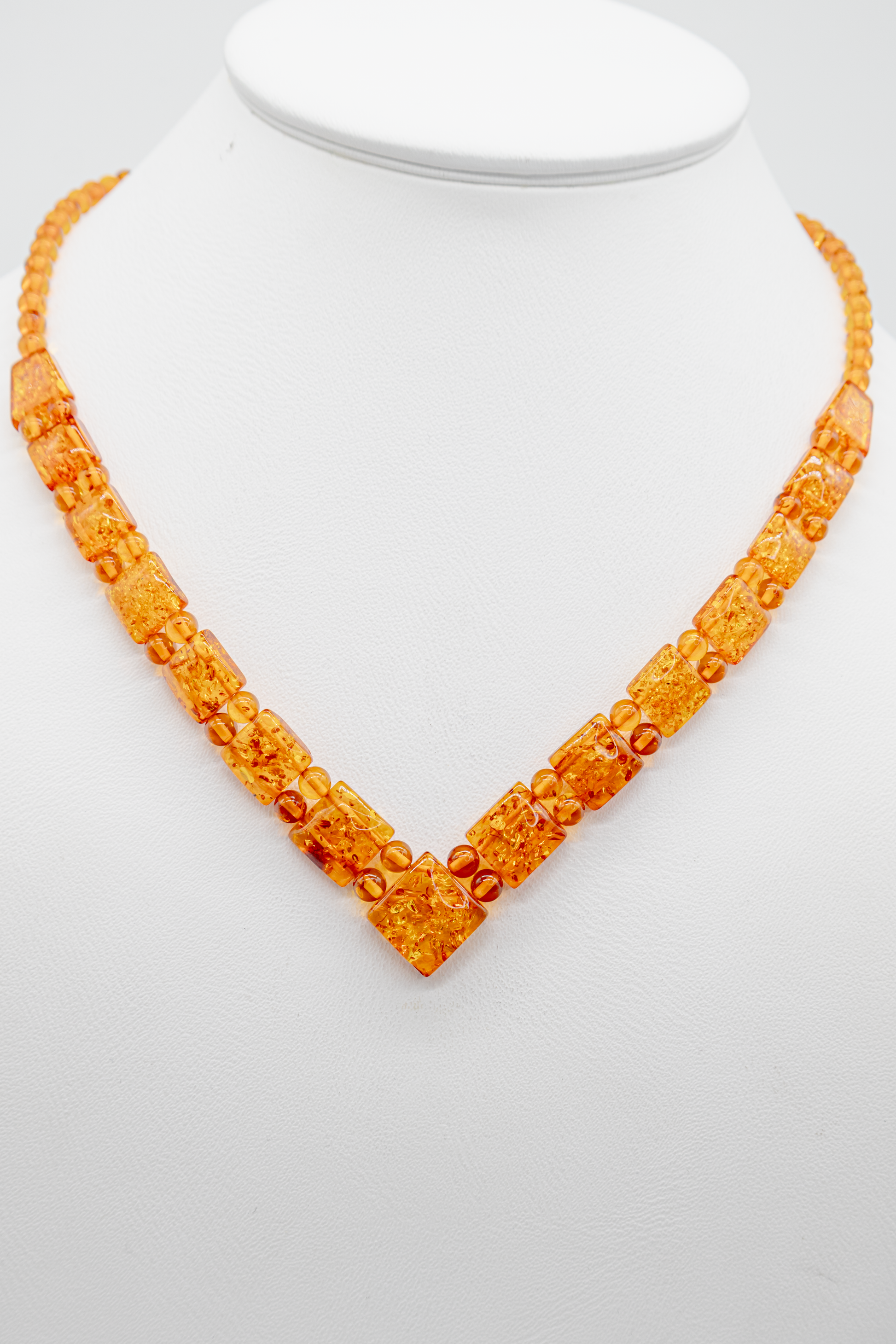 Dieses außergewöhnliche Collier aus echtem Bernstein wird vollständig in Handarbeit gefertigt und ist ein echtes Unikat. Die Kombination aus quadratischen Bernsteinplättchen und kleinen runden Elementen erzeugt einen warmen, funkelnden Effekt, der sofort ins Auge fällt. Die intensive Honigfarbe wirkt edel und lebendig – perfekt für alle, die natürliche Eleganz und hochwertige Handwerkskunst lieben.
