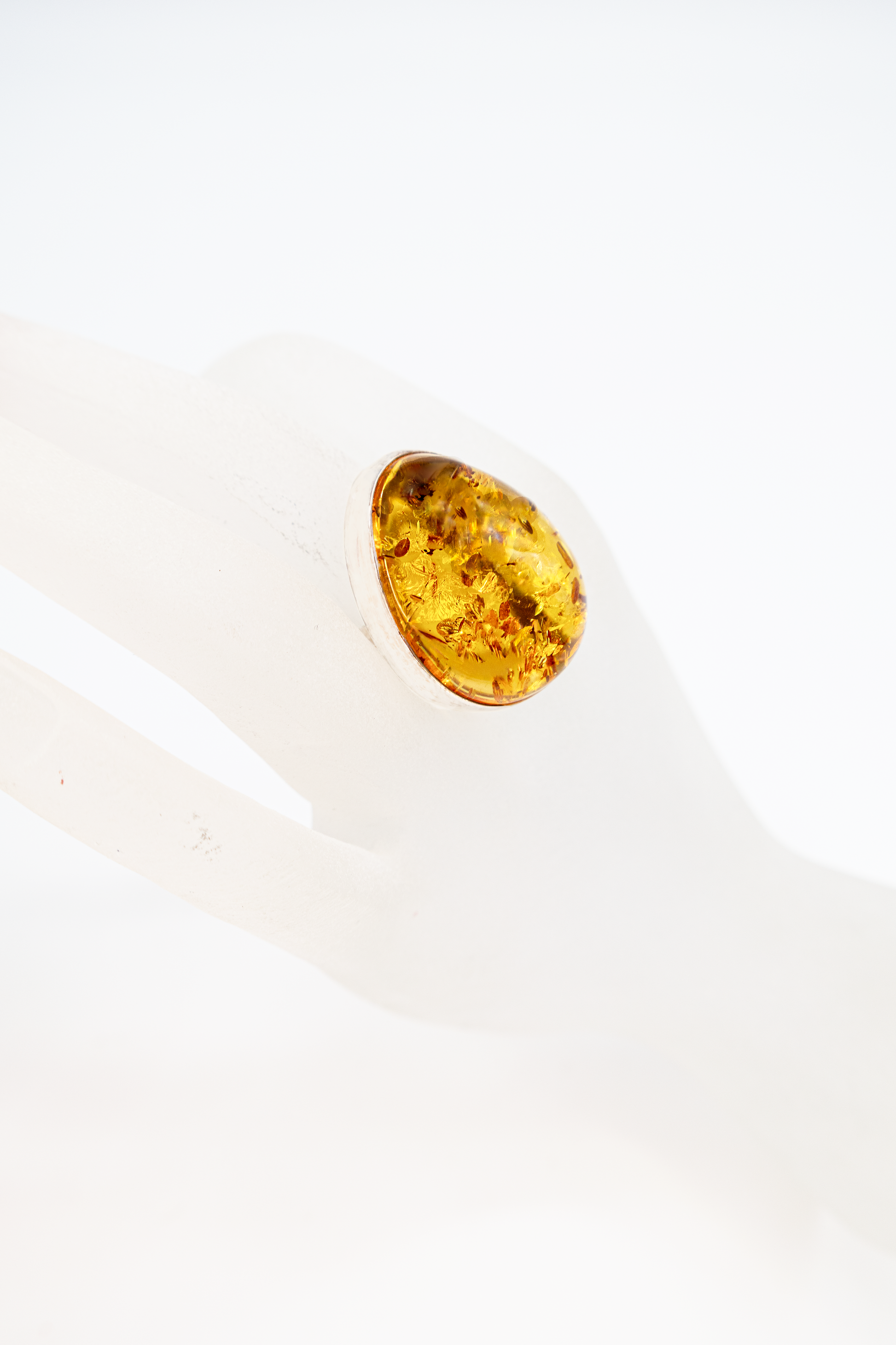 Large honey-yellow amber cabochon in a simple silver setting—a handcrafted unique piece with visible inclusions.