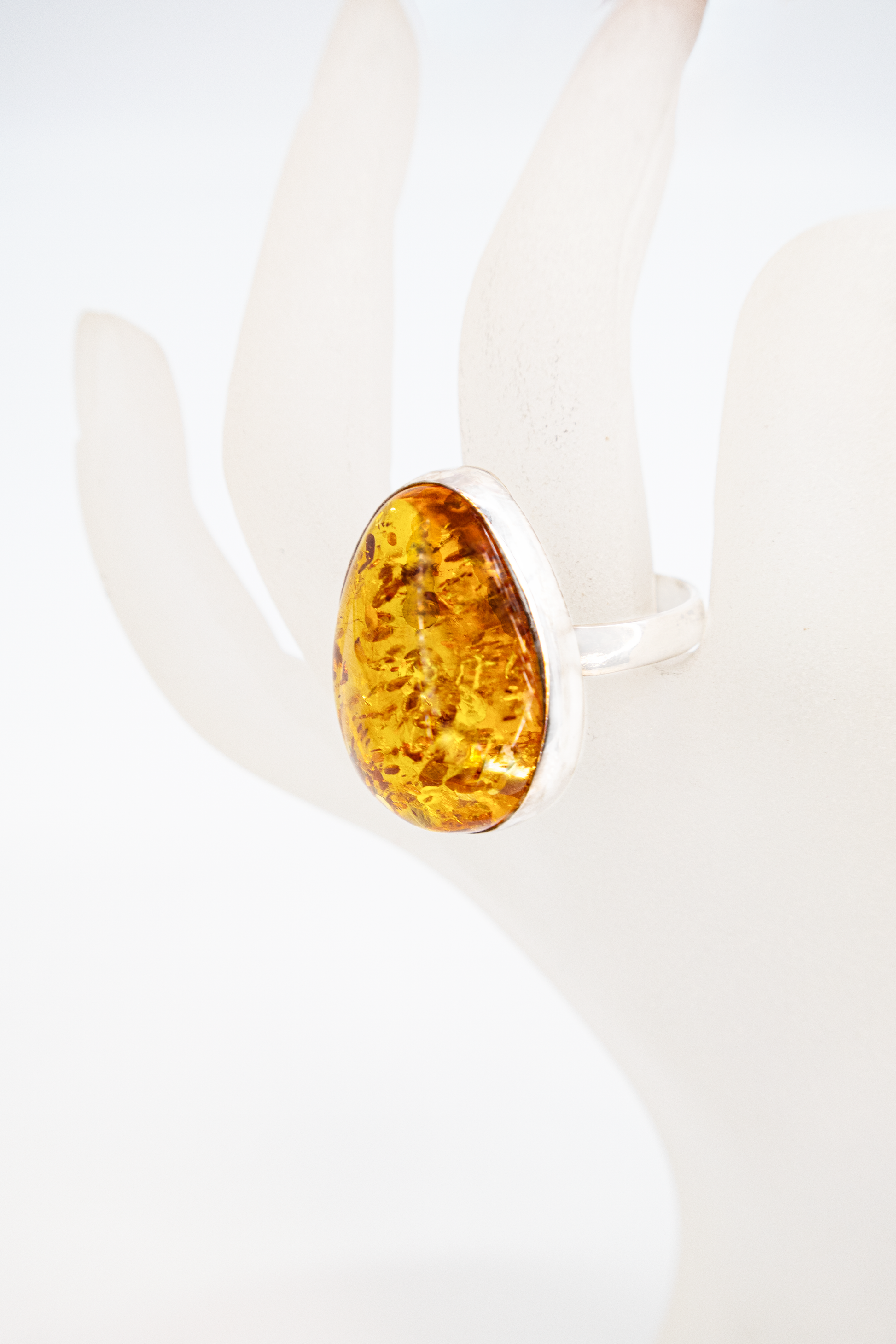 This elegant silver ring with genuine amber is a unique, handcrafted piece in size 64. The large, oval-cut amber boasts a warm honey tone with vibrant inclusions, revealing its natural depth. Set in 925 sterling silver, the cabochon is particularly beautiful and sits comfortably on the finger. Measuring approximately 2.6 × 2.1 × 1 cm, the ring has a striking appearance, yet remains elegant and suitable for everyday wear. Whether as a stylish accessory or as a special gift, this amber ring combines timeless elegance with genuine craftsmanship and goes perfectly with both classic and modern looks. Ideal for women who appreciate high-quality materials and unique, one-of-a-kind pieces.