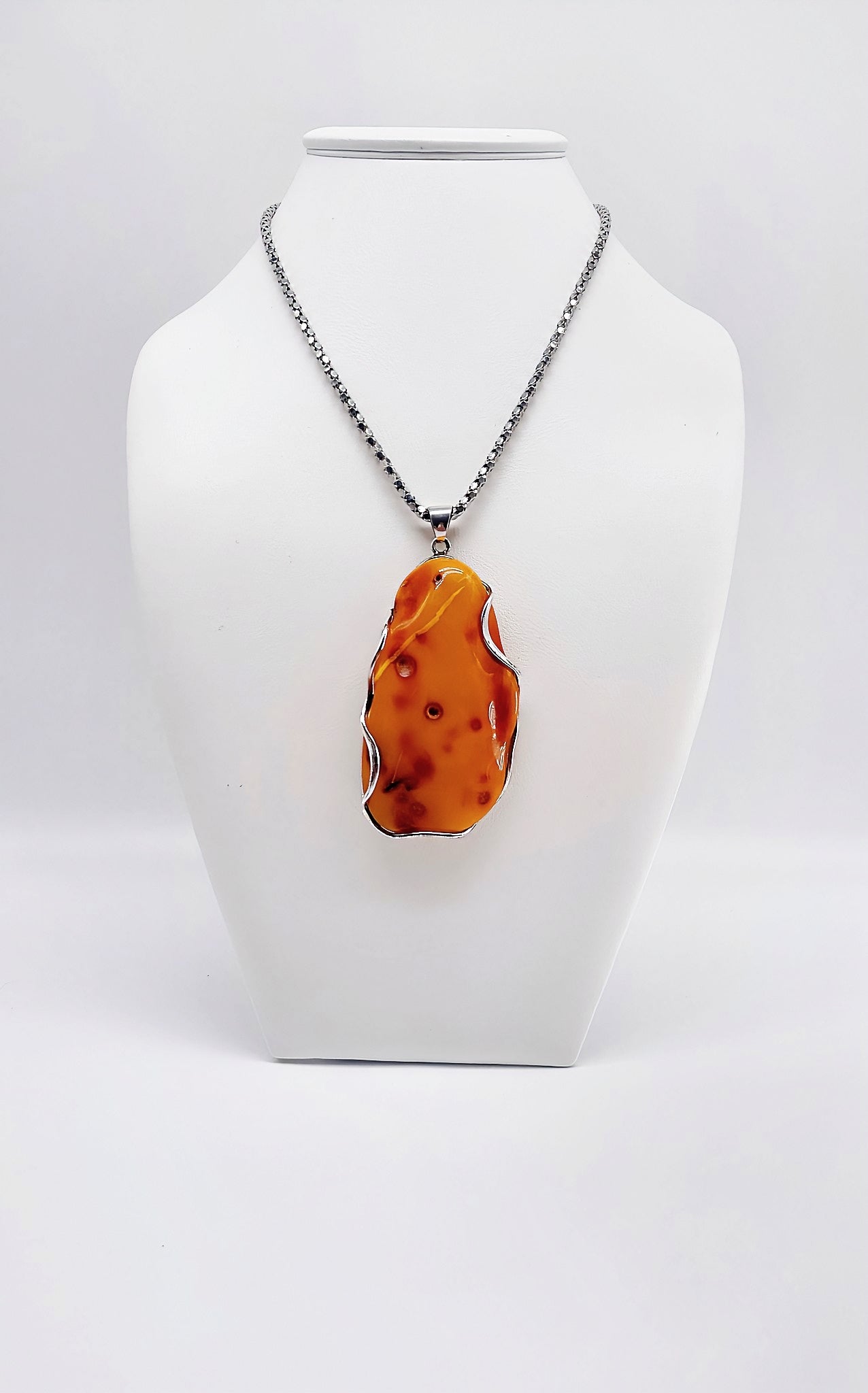 This beautiful amber pendant captivates with its unusual shape and warm, golden hue. Set in an elegant silver frame, the pendant perfectly showcases the natural beauty of the amber. Each pendant is unique and distinguished by its unique grain and color. This piece of jewelry is a timeless accessory that adds a touch of elegance and connection to nature to your style.