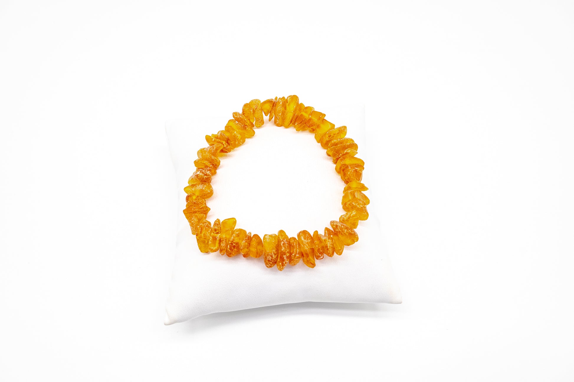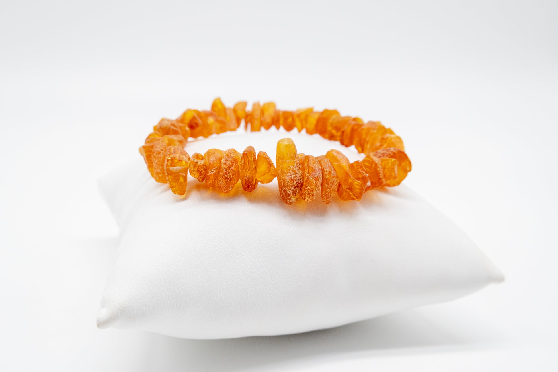 This elastic amber bracelet impresses with its natural elegance and warm, golden-orange color. The matte amber stones, in an irregular, authentic shape, lend the piece a modern, natural character.