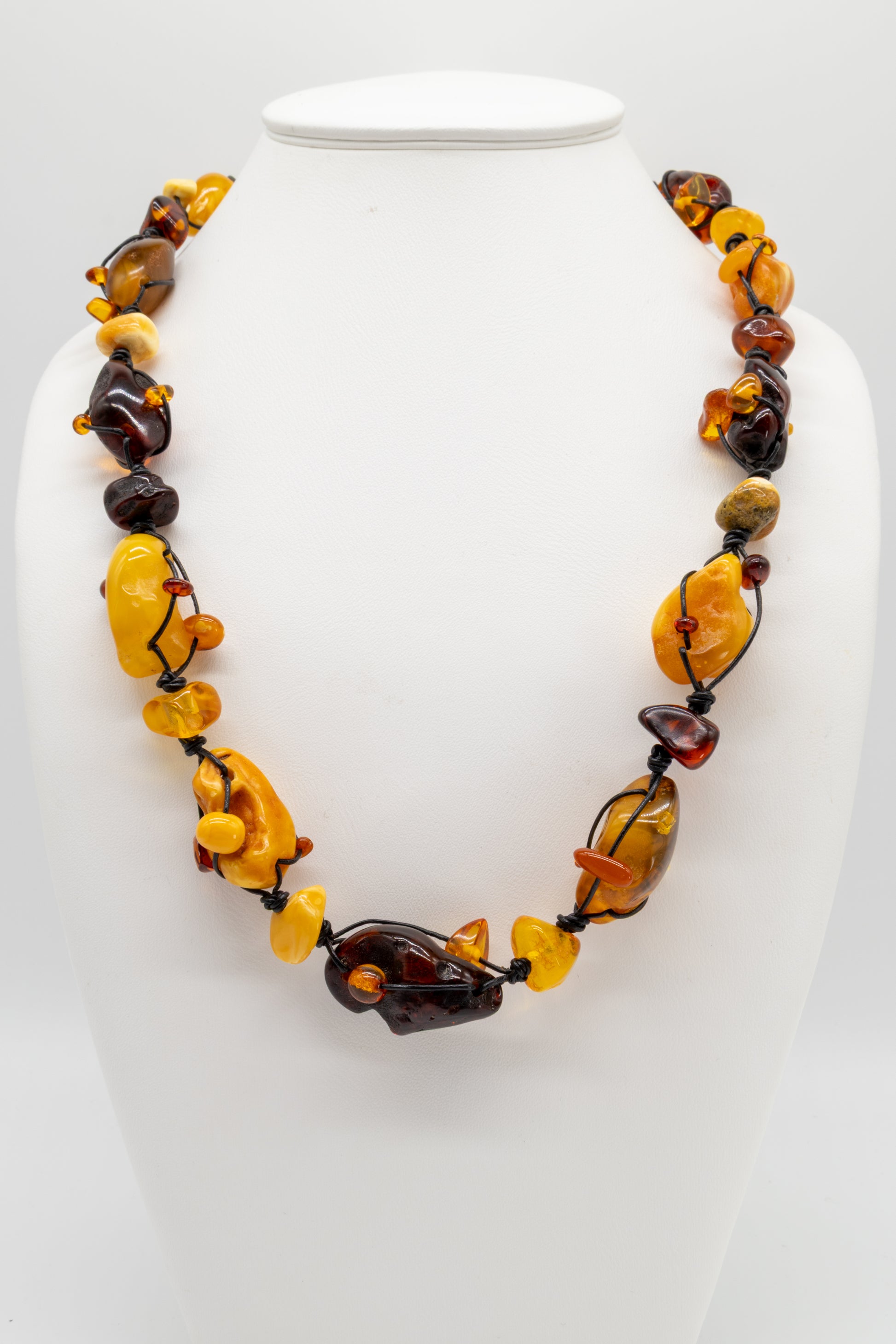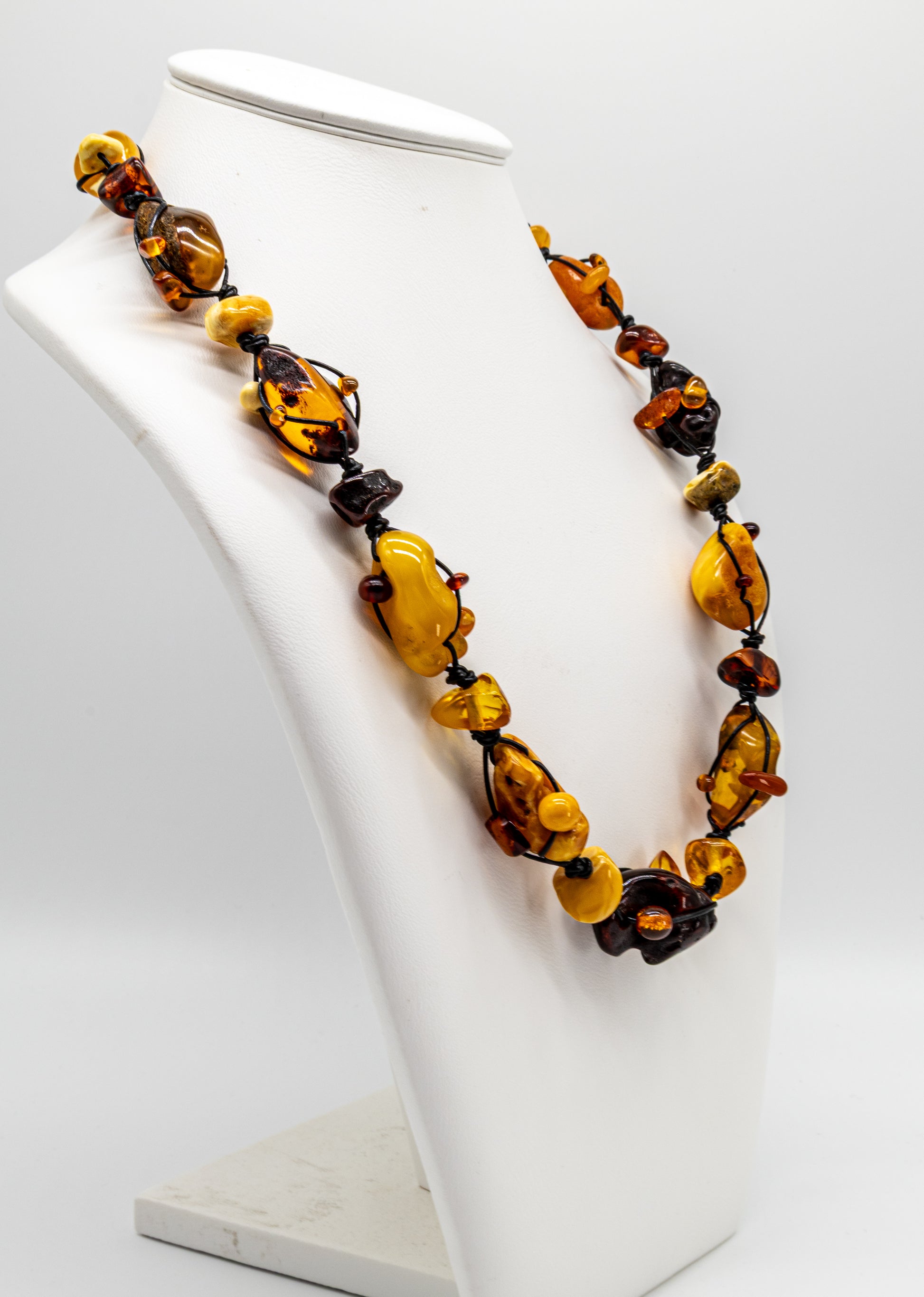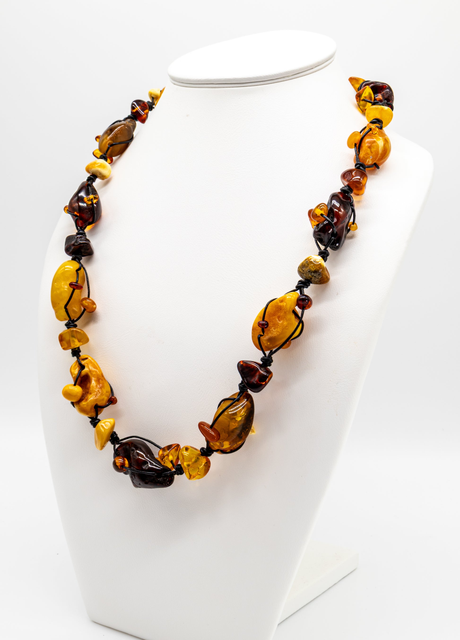 This exclusive amber necklace is truly unique and impresses with its extraordinary design and high-quality craftsmanship. The harmoniously combined amber stones in various shades are artfully arranged on a robust, elegant leather cord. With a length of approximately 64 cm and a width of approximately 2.5 cm, this necklace offers a striking yet stylish presence. The carefully crafted, discreet clasp ensures a secure fit and completes the elegant appearance. A unique piece of jewelry – ideal as a gift for your wife, sister, or girlfriend.