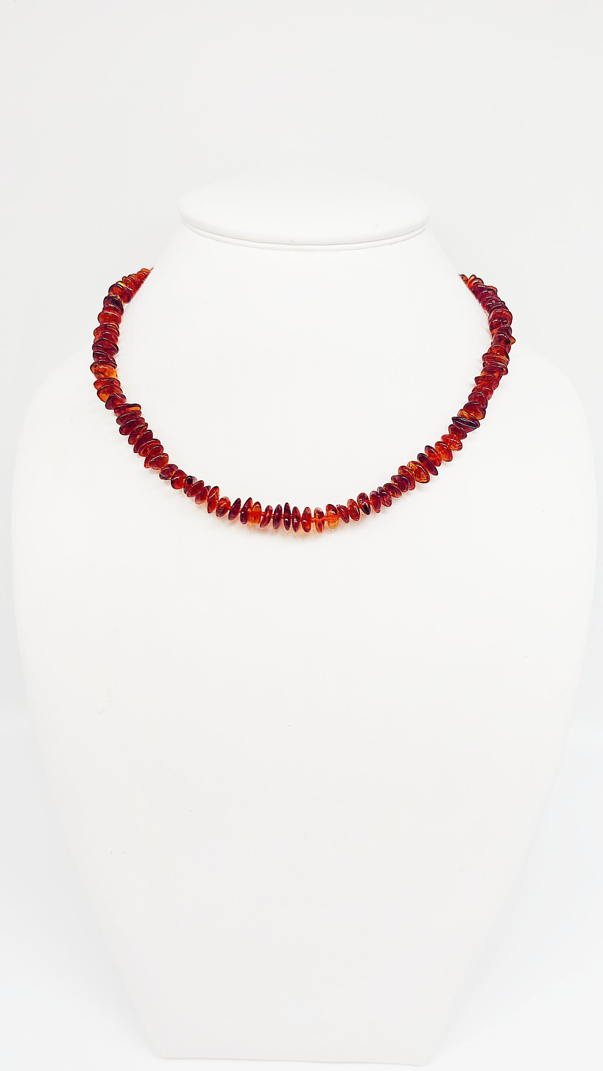This beautiful amber necklace is made of finely polished amber beads shimmering in warm red tones. Each bead has been carefully selected and strung to create an elegant and timeless piece of jewelry. The necklace is handcrafted and exudes natural beauty. It's perfect for special occasions, but also as an everyday accessory, adding a touch of elegance to any outfit.