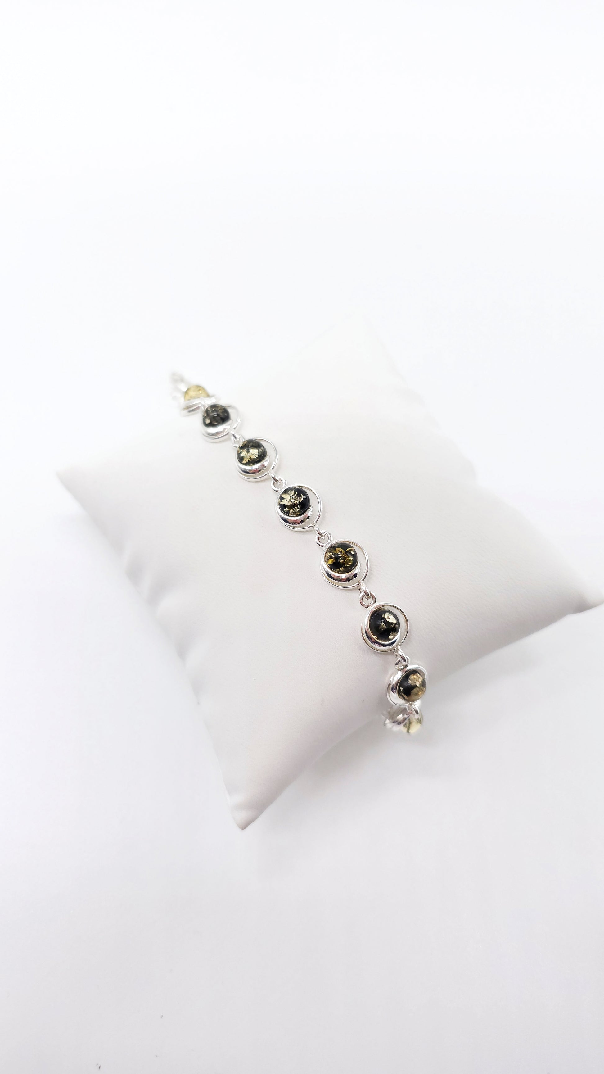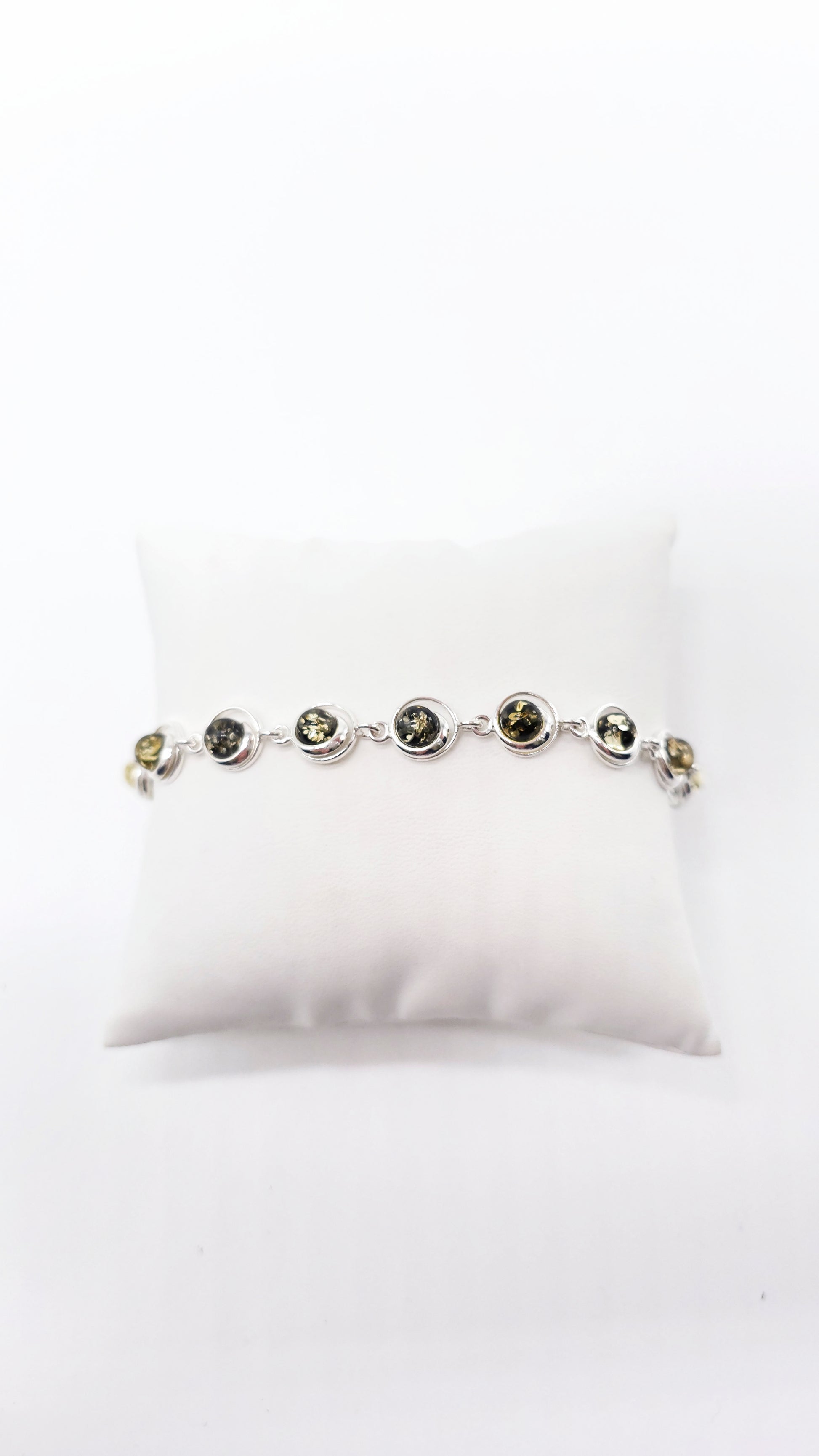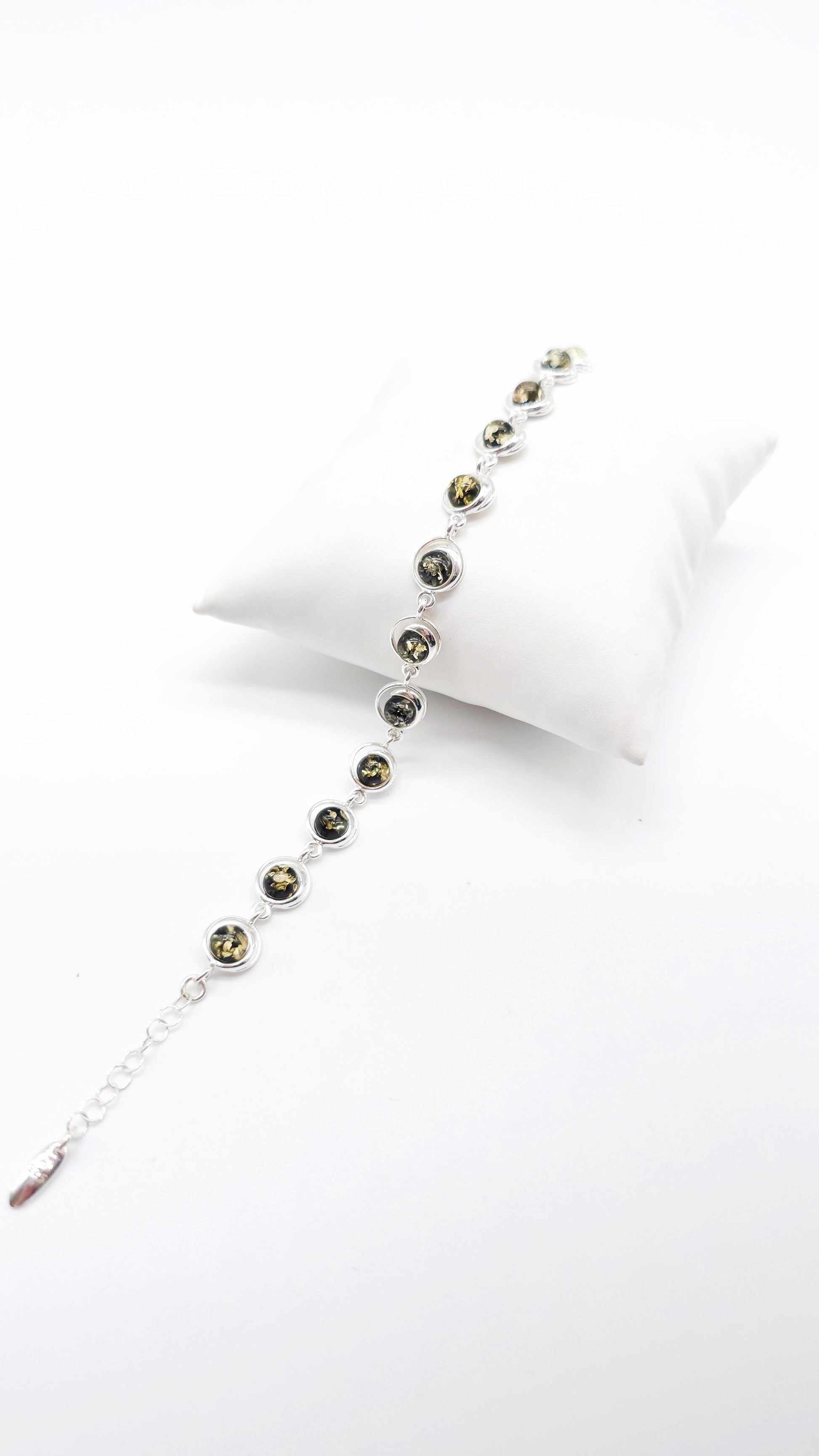 This elegant bracelet made of 925 sterling silver is adorned with round elements of green natural amber and impresses with its simple elegance. The subtle silver settings allow the amber's natural luster to shine brightly, making this piece a stylish companion for everyday wear as well as special occasions.