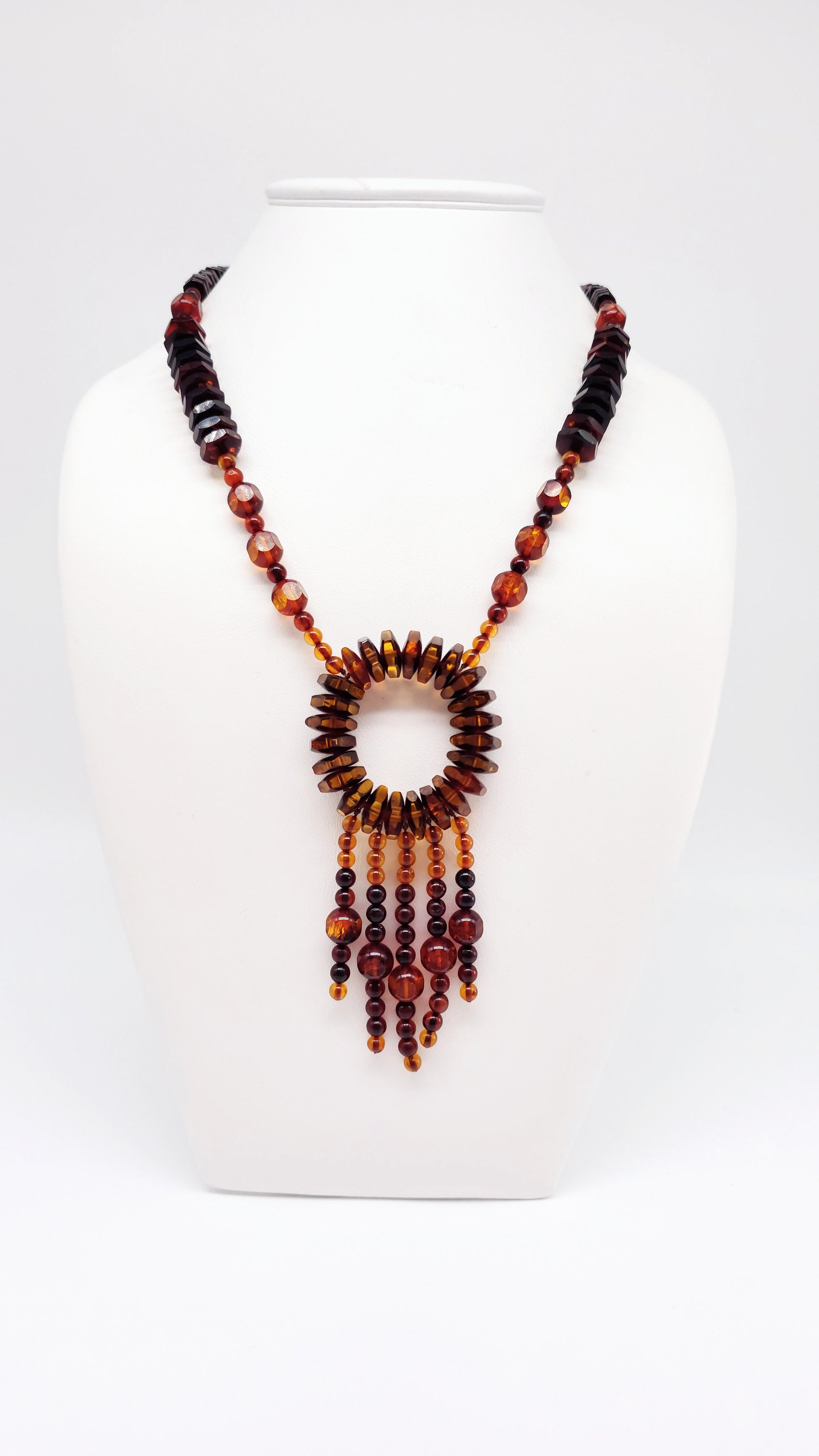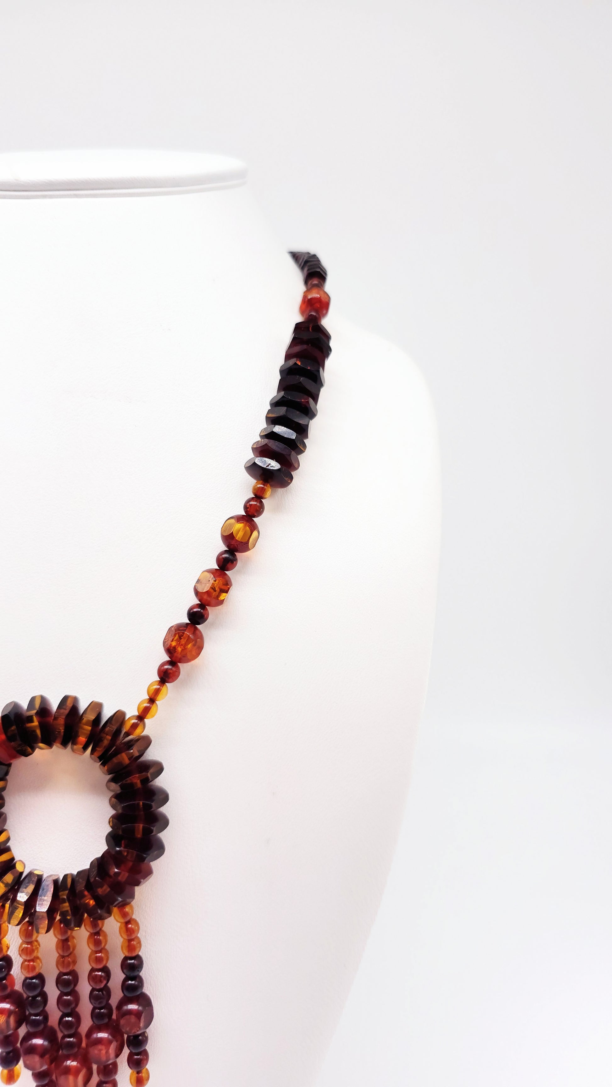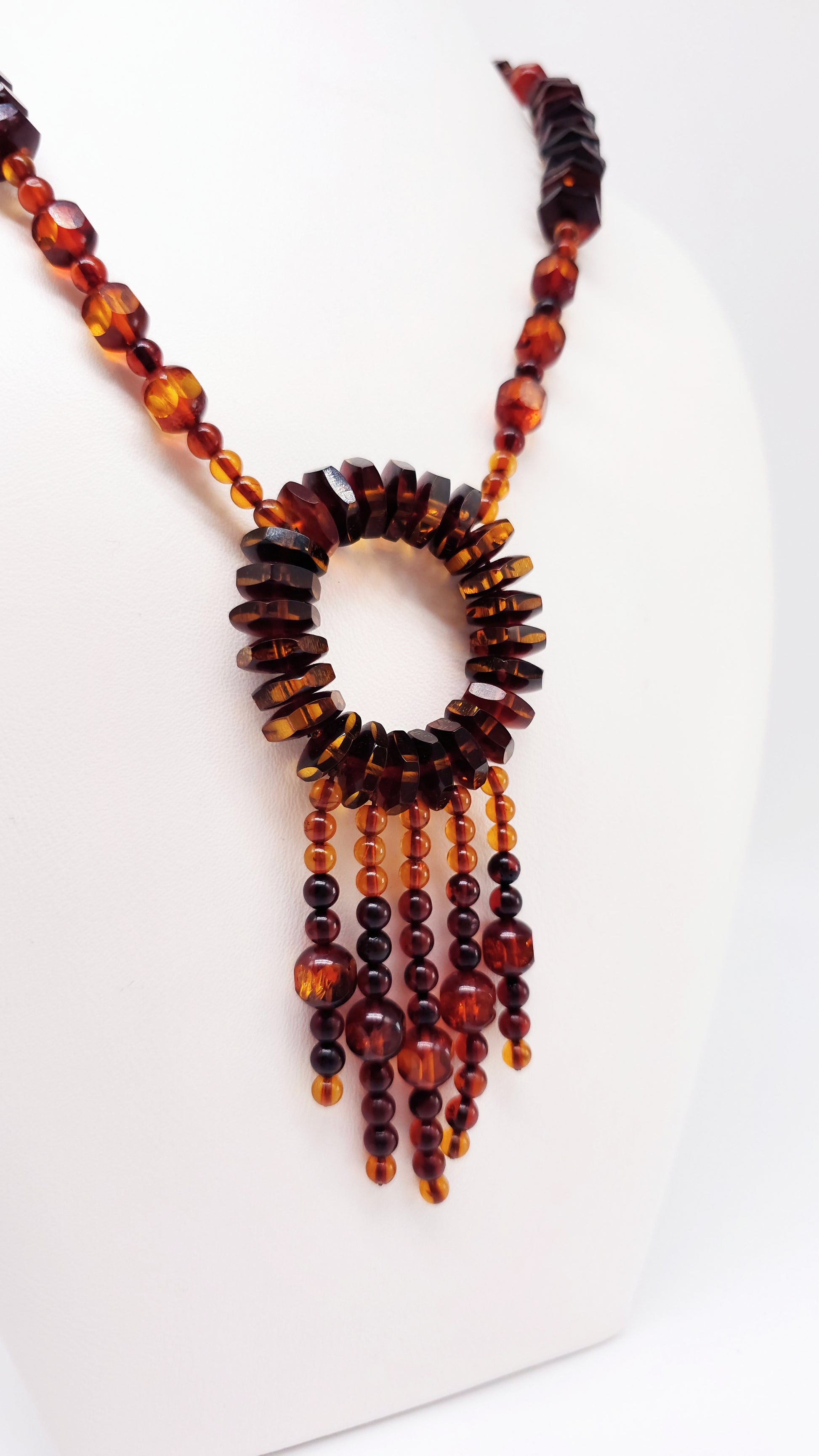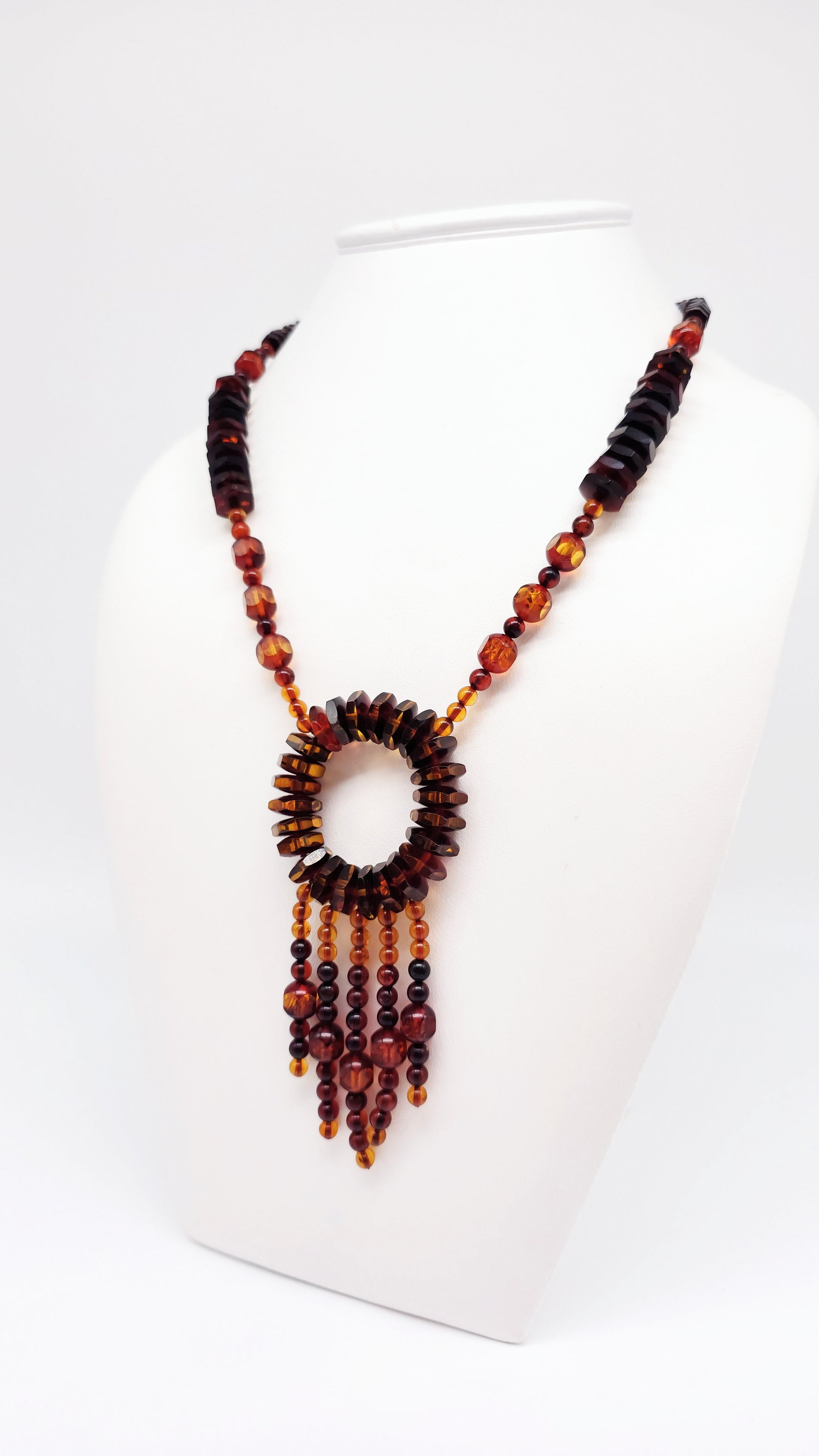 This impressive amber necklace is truly unique and draws attention with its artistic design. The large, round central pendant with its movable fringes lends the piece a playful yet elegant touch. The harmonious color variety of the amber—from honey-colored to deep brown—underscores the natural character of this exquisite necklace.