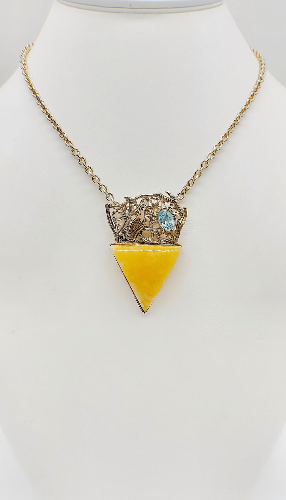 This exquisite 925 sterling silver pendant combines artisanal craftsmanship with natural beauty. The triangular amber element radiates a rich, golden yellow and is complemented by a delicate silver setting. A sparkling topaz adds an additional accent, lending this piece of jewelry a regal touch. Perfect for special occasions or to add an elegant touch to any outfit.
