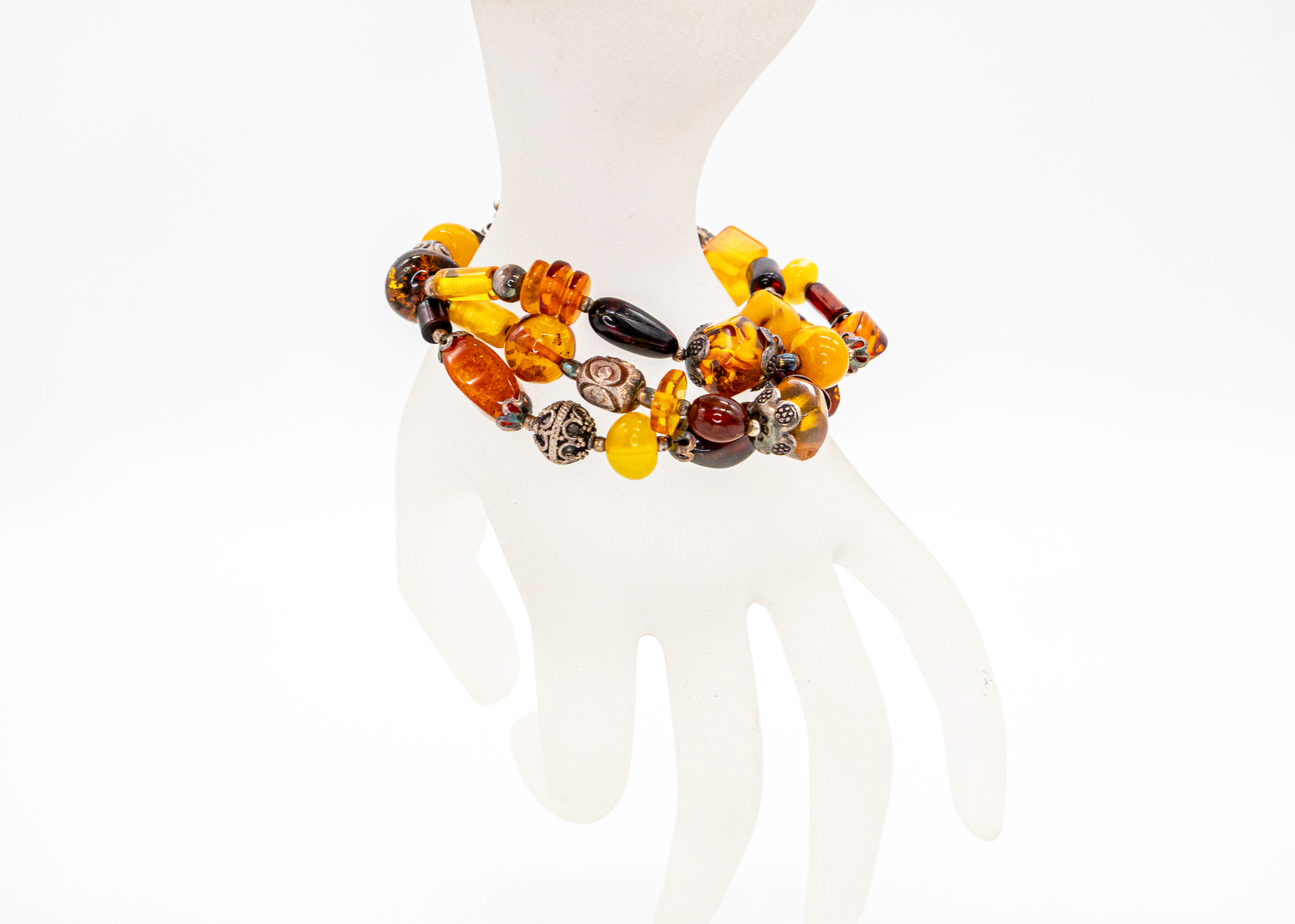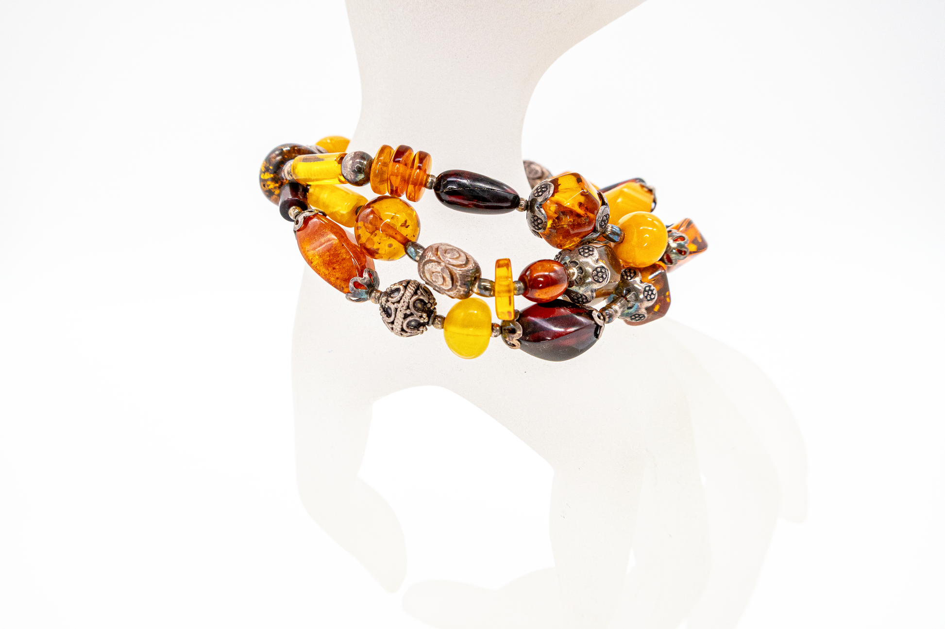 This two-strand bracelet is truly unique and an eye-catcher for anyone who appreciates something special. It is crafted from genuine amber in a range of colors—from sunny yellow to deep cognac and mysterious blackish brown—combined with artistic silver elements and small accent beads. Measuring approximately 20.5 cm in length and with a flexible fit, it nestles comfortably around the wrist. The unusual design adds expression and style to any outfit. It's the ideal gift for women who appreciate unique and handcrafted jewelry.