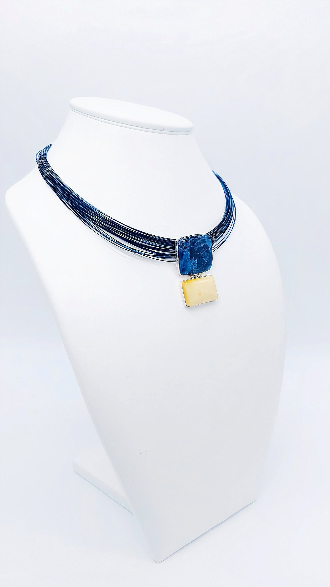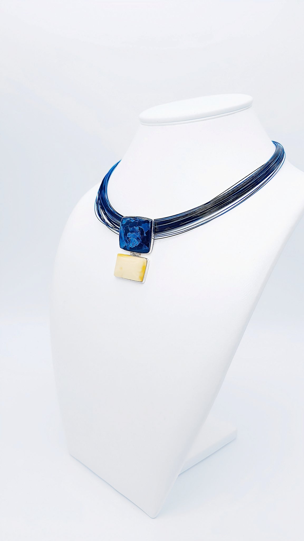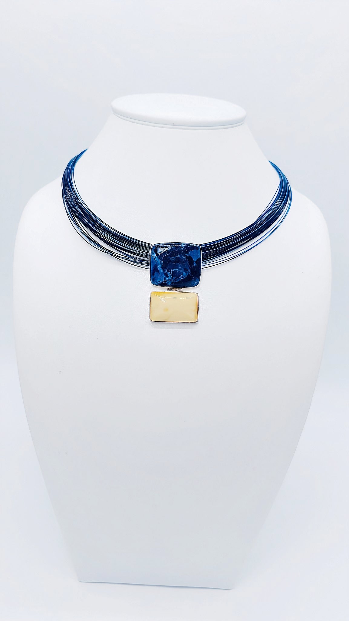 This stunning necklace combines the captivating depth of Pietersite with the warm elegance of Royal Amber. The two striking stones are set in a modern design and hang from several fine, dark wires that elegantly caress the neck. The contrasting mix of the intense blue tones of Pietersite and the radiant yellow of Royal Amber makes this necklace a unique piece of jewelry that enhances any outfit. Perfect for special occasions or as a stylish everyday accessory.