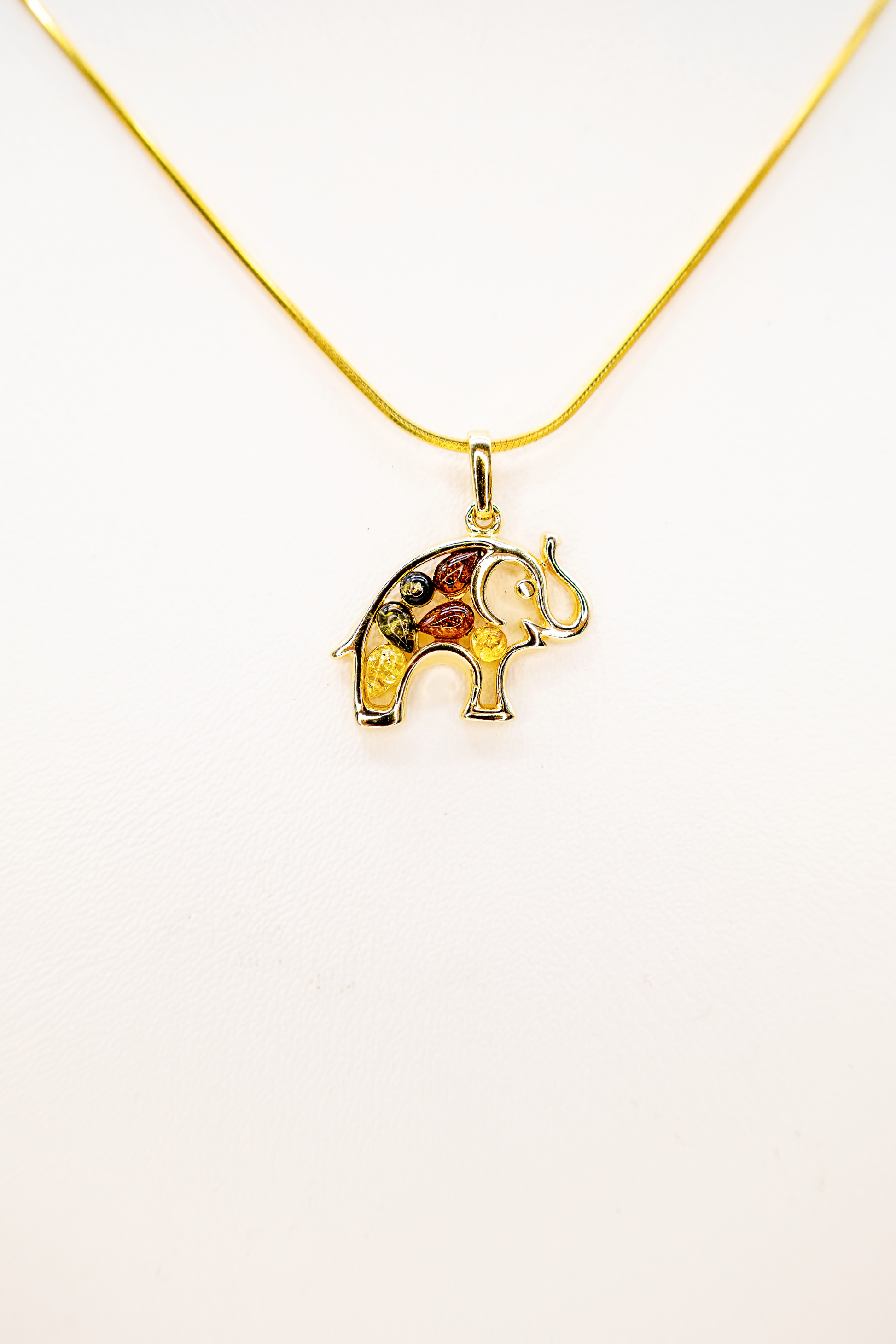 This gold-plated elephant pendant is a unique piece of jewelry steeped in deep symbolism. For centuries, the elephant has represented good luck, strength, and permanence. Adorned with several genuine amber stones in varying shades, the pendant exudes a special vibrancy and elegance. Measuring 2.5 x 2.2 cm, it is a striking yet comfortable eye-catcher. Whether as a lucky charm, a symbolic accessory, or a stylish gift, this pendant combines precious materials with craftsmanship and significance.
