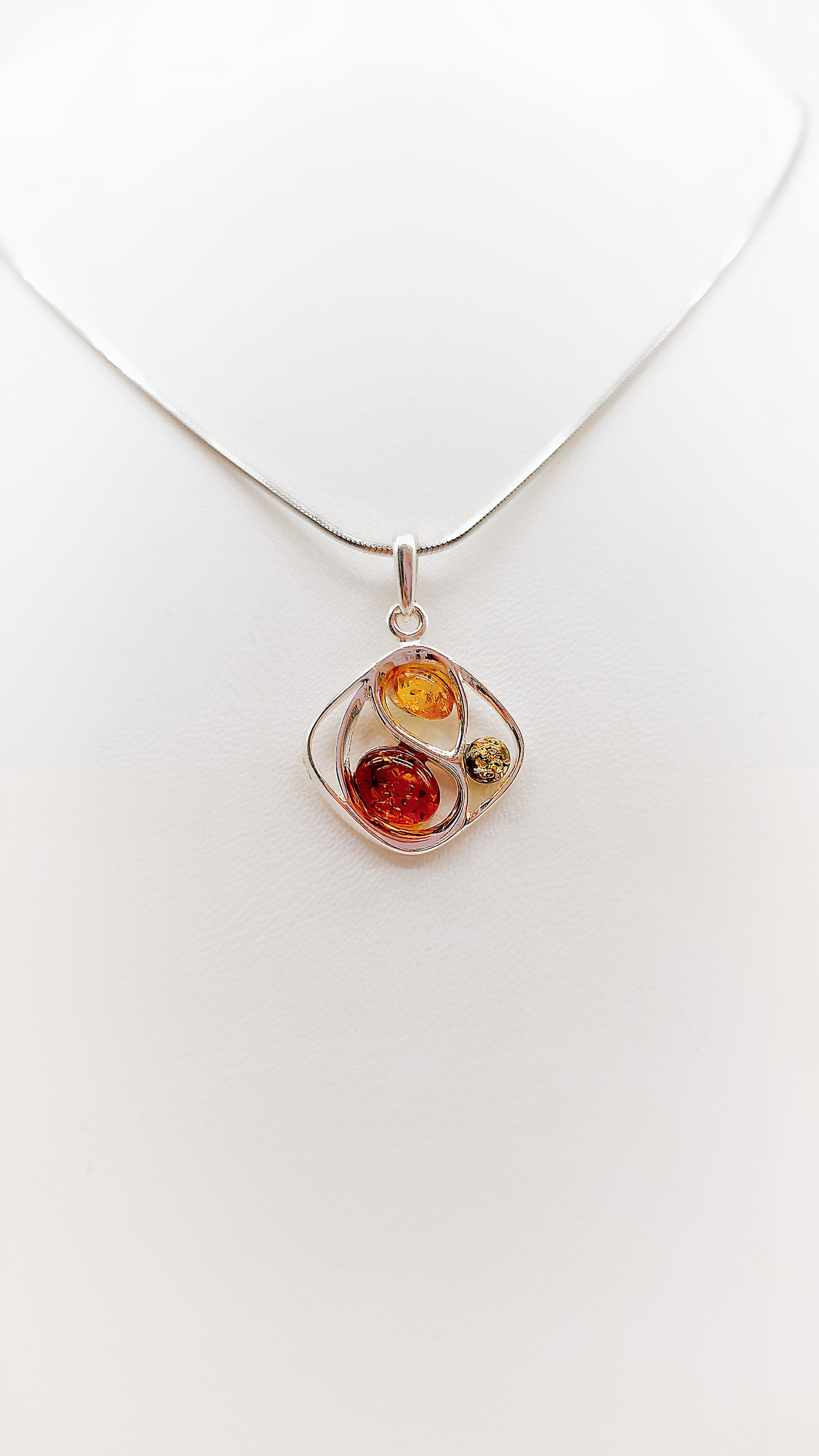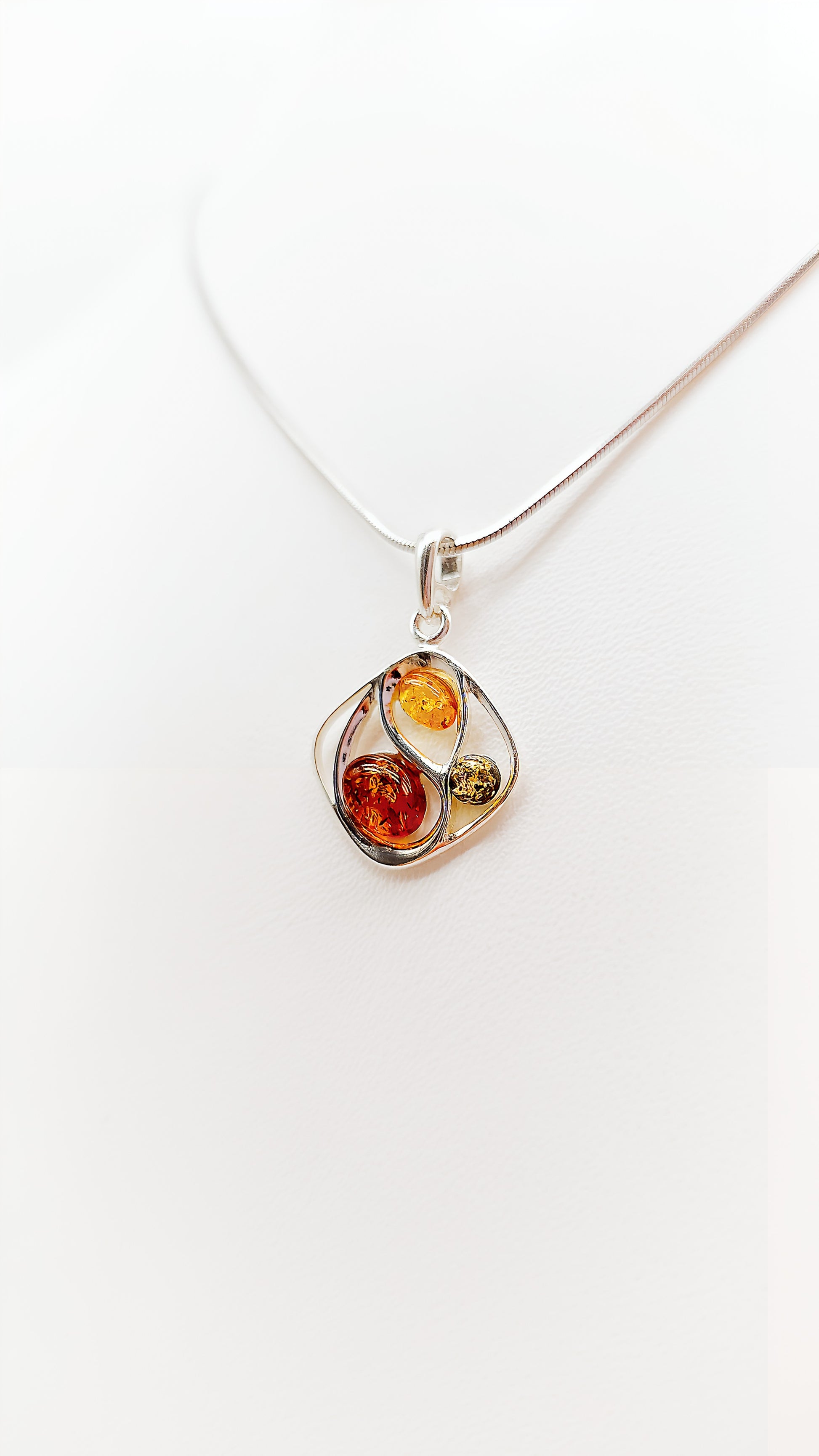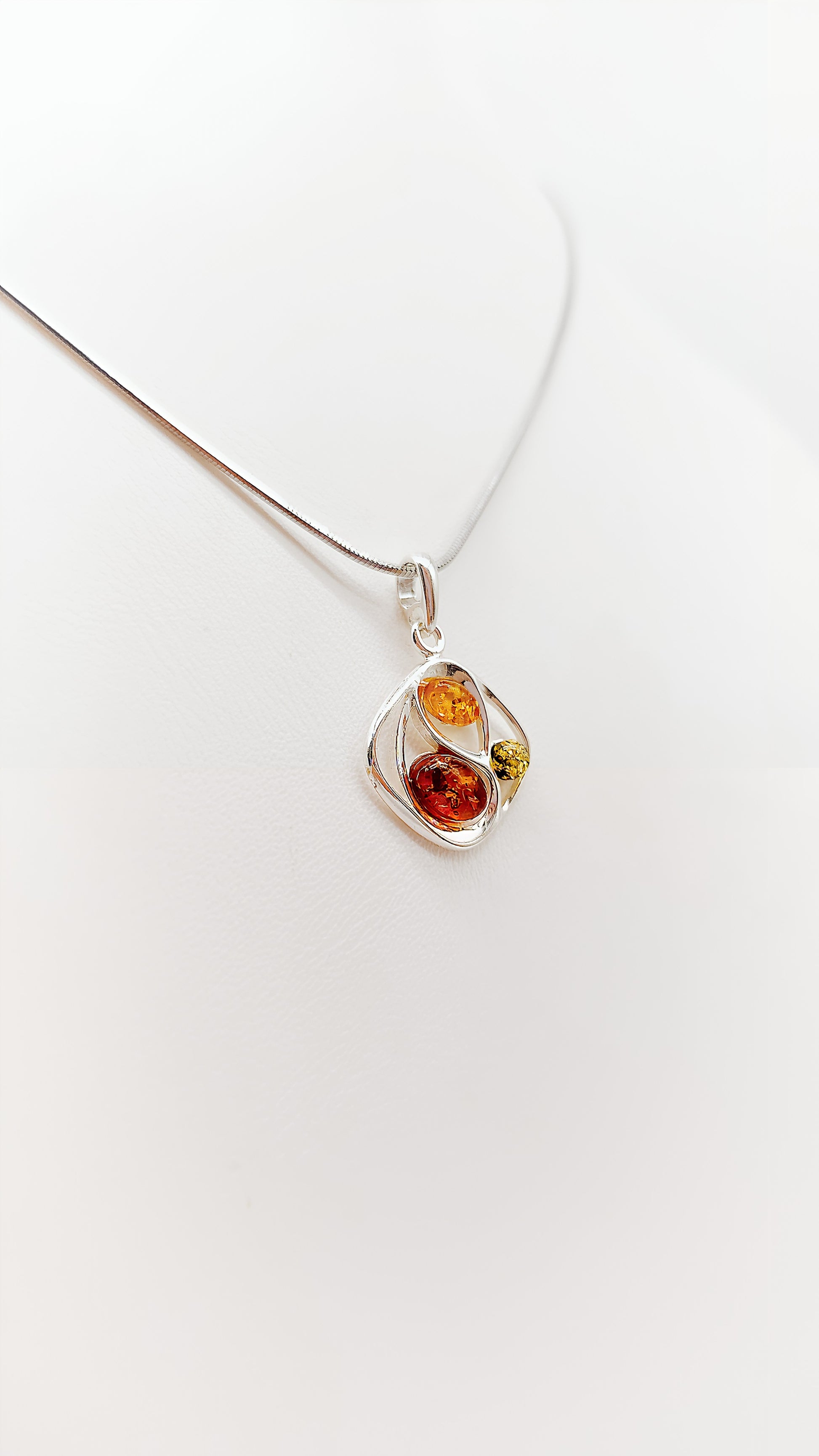 This elegant pendant crafted from 925 sterling silver combines the beauty of three different amber stones in a harmonious design. The gentle curves of the silver frame embrace the luminous amber stones, which shine in a variety of shades – from deep red to warm yellow to a golden sheen. This piece of jewelry is not only an expression of natural elegance but also a versatile companion that adds a special touch to any outfit. A must-have for lovers of unique and sophisticated jewelry.