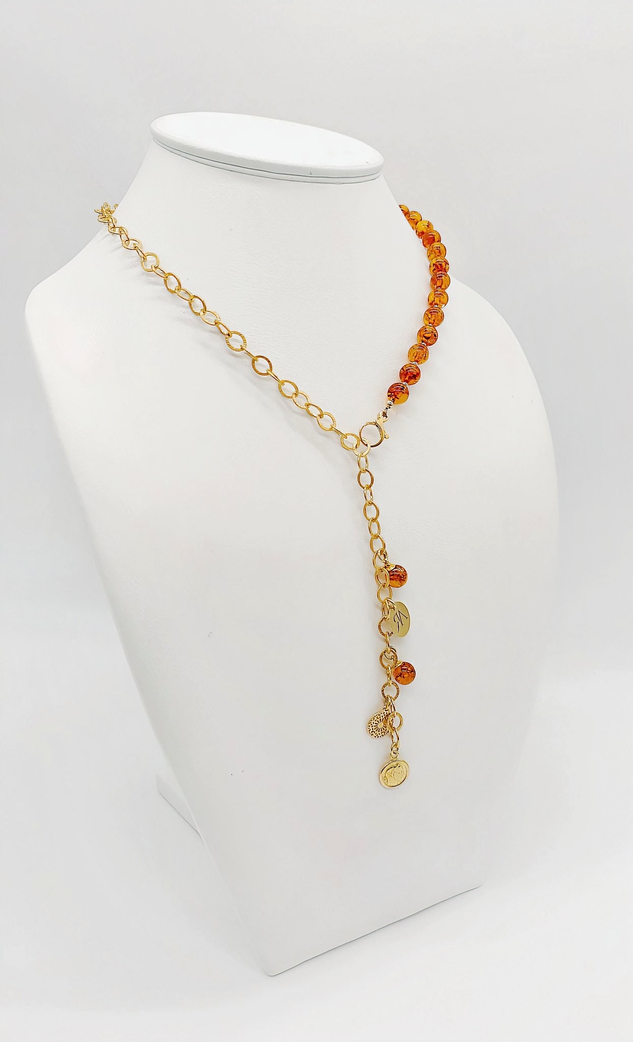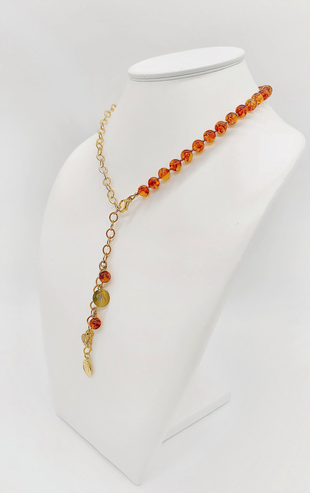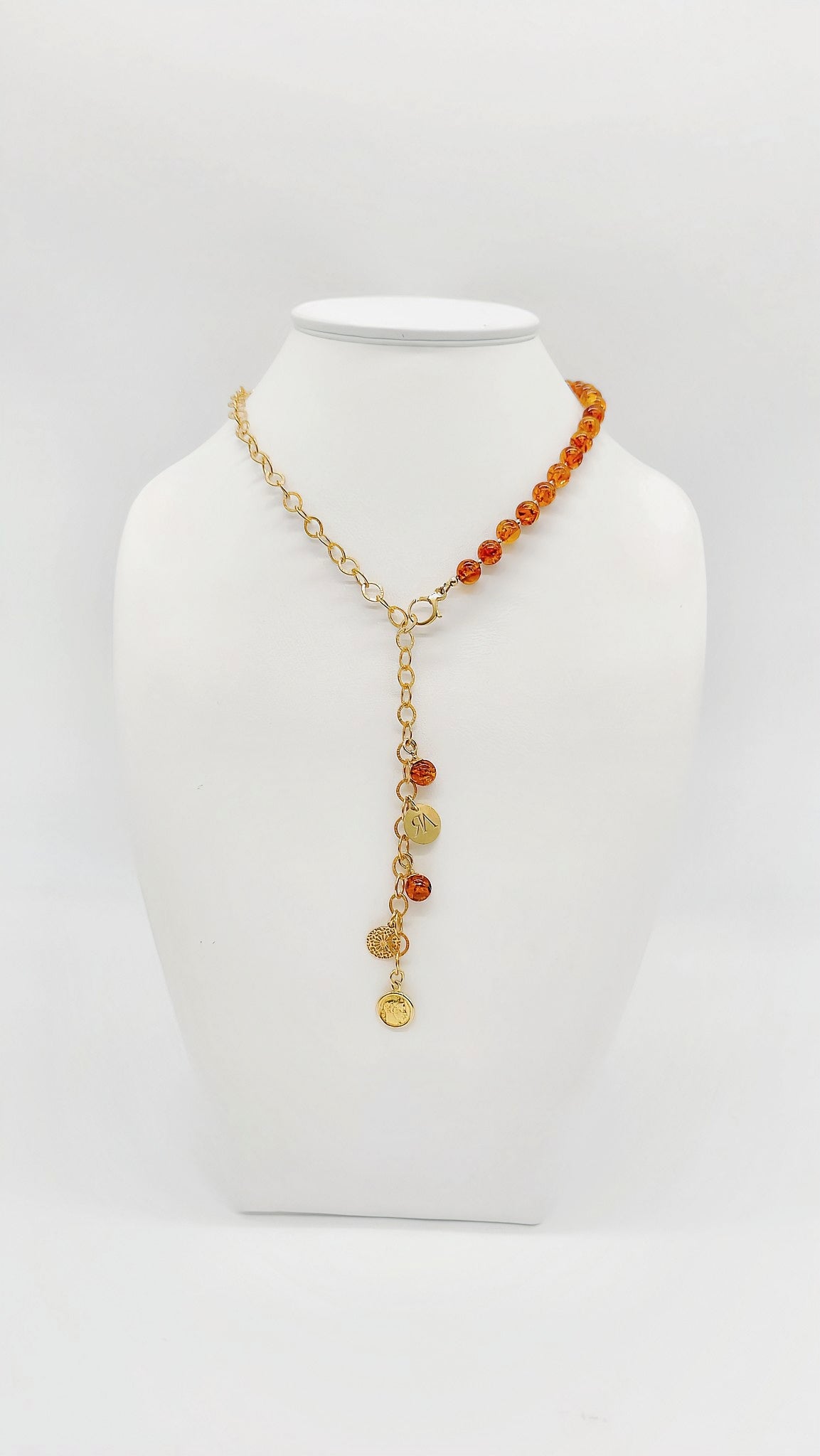 This stunning Y-necklace combines the warm beauty of amber with the luxurious shine of gold-plated 925 sterling silver. The necklace is composed of delicate amber spheres, artfully integrated into the design, terminating in an elegant Y-shape. Embellished with delicate pendants and gold elements, this necklace is a true eye-catcher. Ideal for special occasions or to add a touch of elegance and sophistication to your everyday outfit.