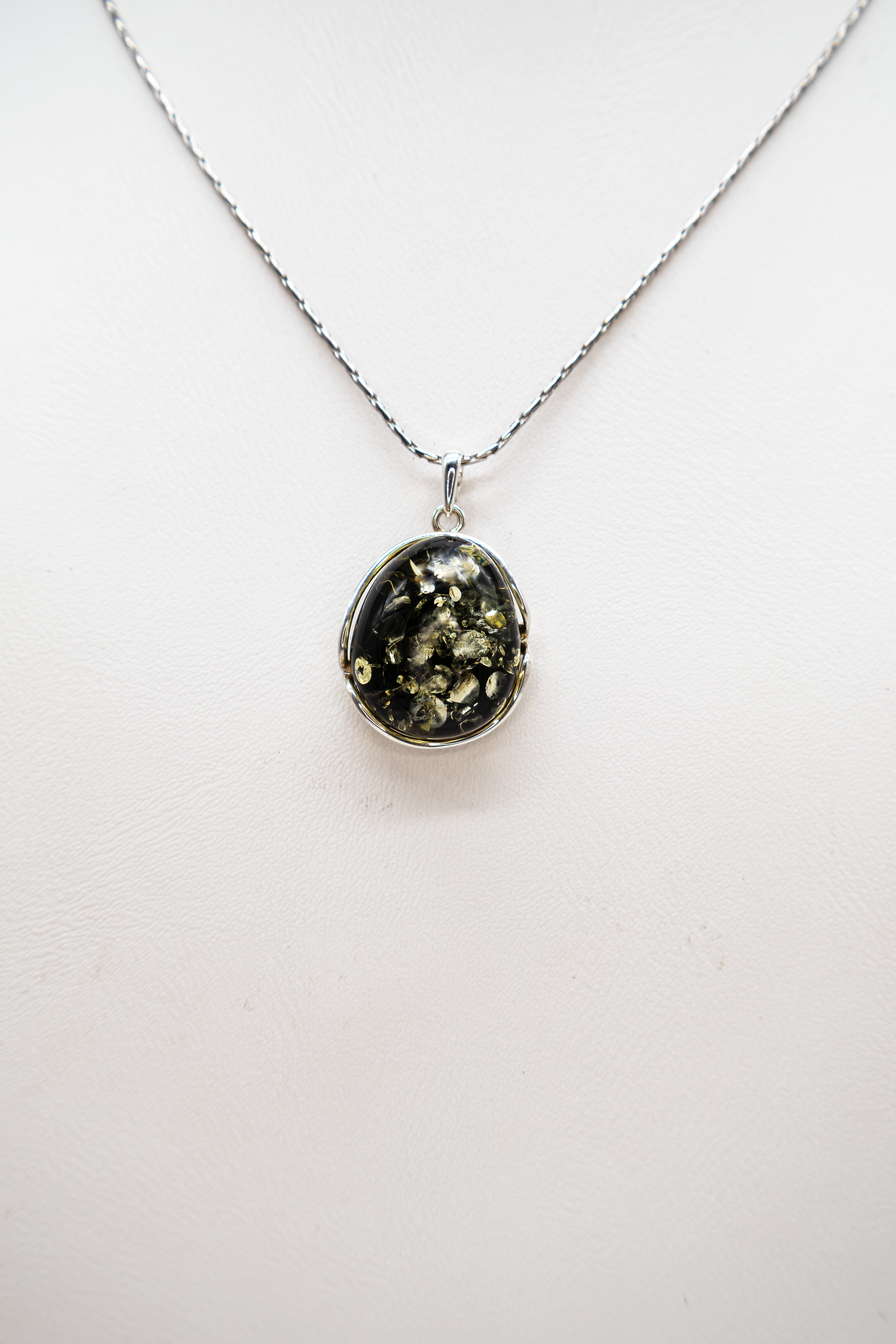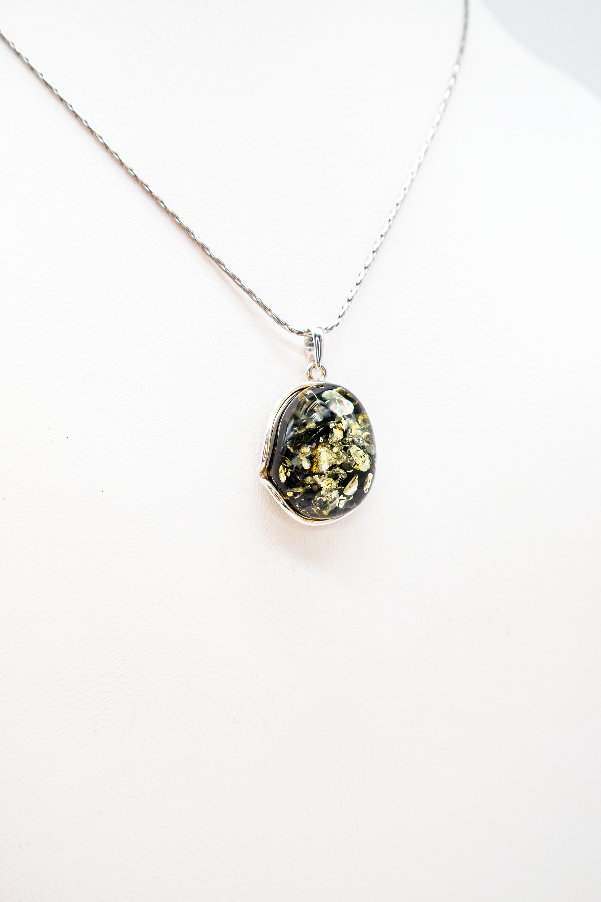 This handcrafted silver pendant with a captivating green amber is a truly one-of-a-kind piece. The stone's natural structure, with its vibrant inclusions, makes each piece unique and lends it a special charm. Set in high-quality 925 sterling silver, the pendant combines timeless elegance with the natural beauty of amber. A precious piece of jewelry that makes an ideal gift for a wife, sister, or girlfriend.