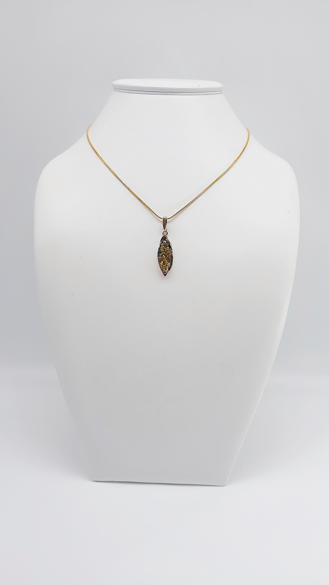 This leaf-shaped pendant combines the natural beauty of amber with an elegant, gold-plated setting. The amber is artfully embedded into the leaf design and radiates warm tones. This piece of jewelry is a perfect accessory for everyday wear or special occasions, adding a special touch to any outfit. An ideal gift for nature lovers and jewelry enthusiasts.