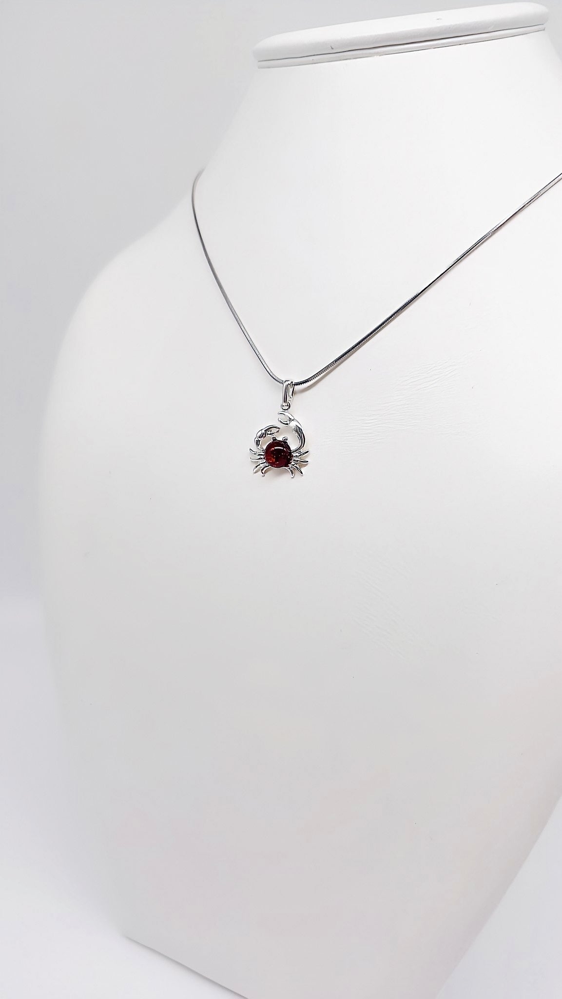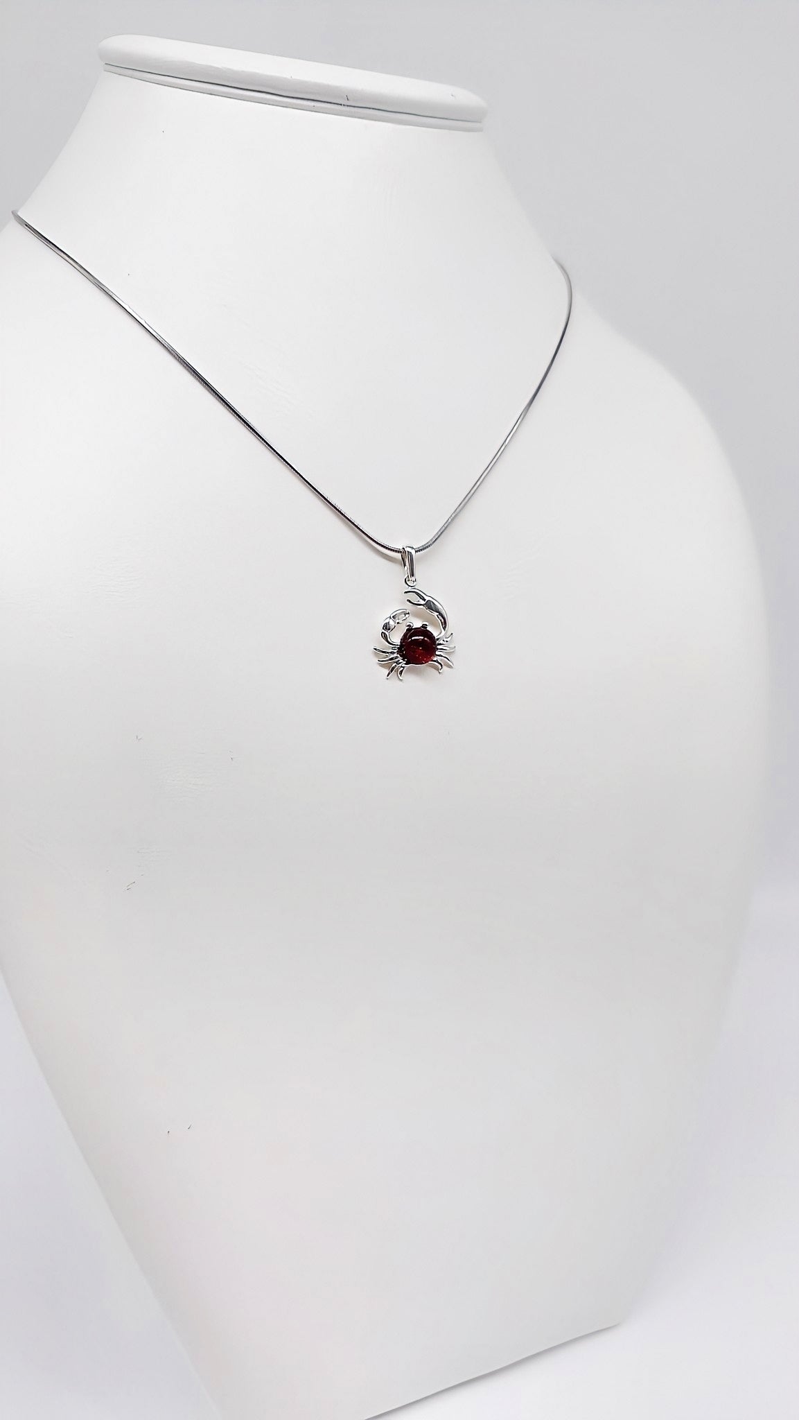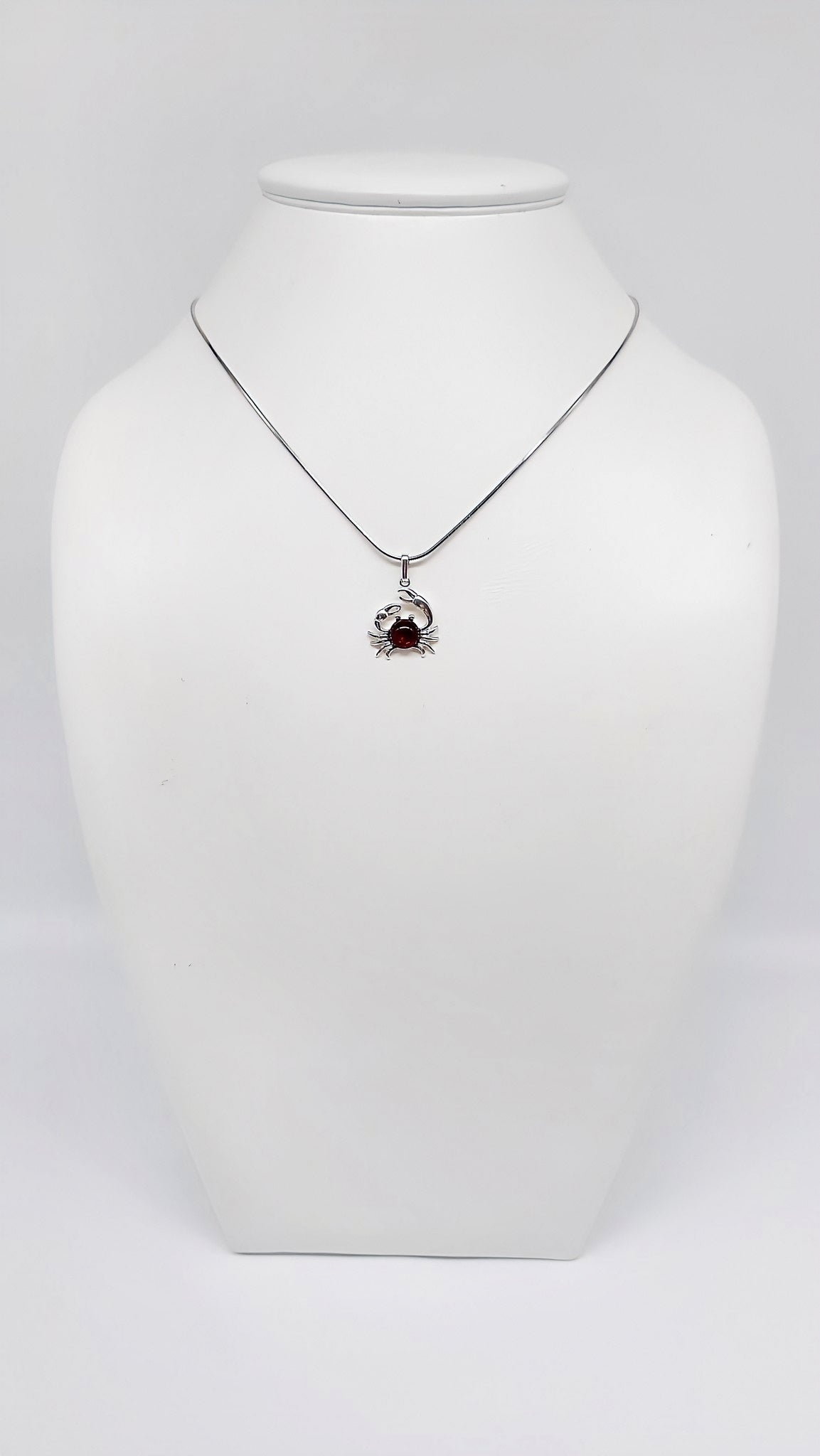 This enchanting crab pendant crafted from 925 sterling silver combines nautical charm with the warmth of vibrant red amber. The artfully crafted pendant features a detailed crab encircling a lustrous piece of amber. The high-quality silver perfectly complements the warm luster of the amber, making this piece a true highlight. An ideal accessory for anyone who loves the beauty of the sea and the elegance of nature.