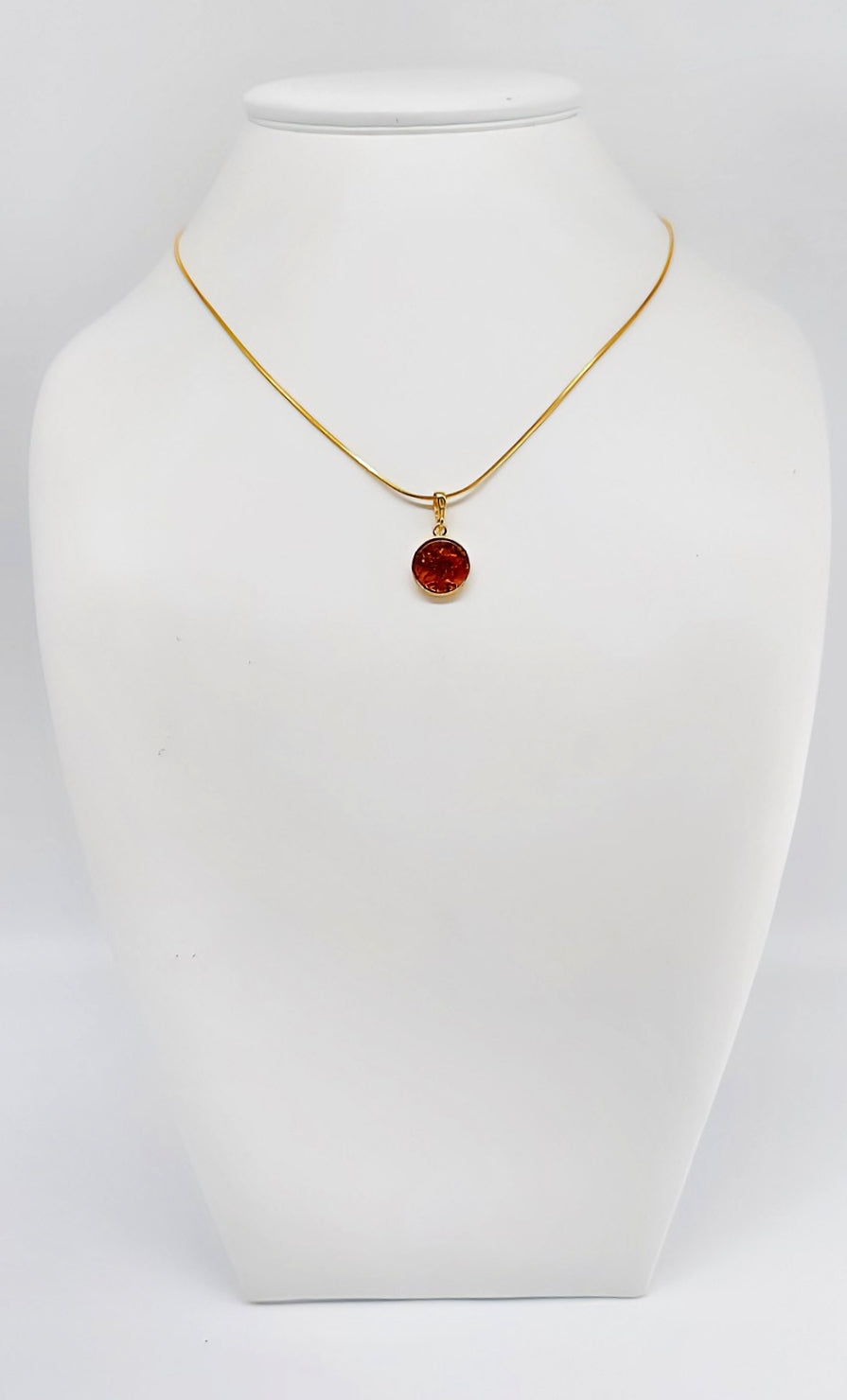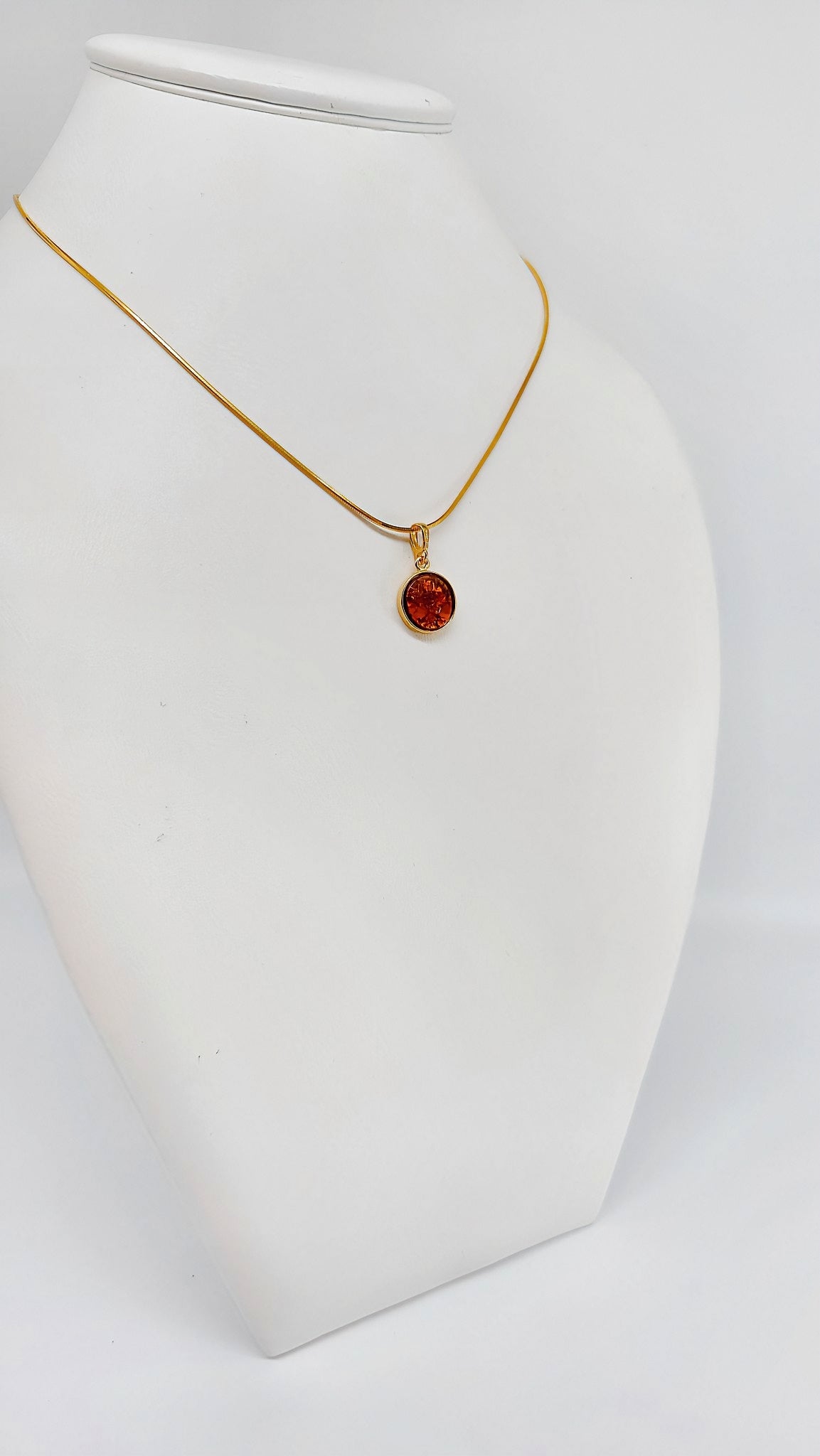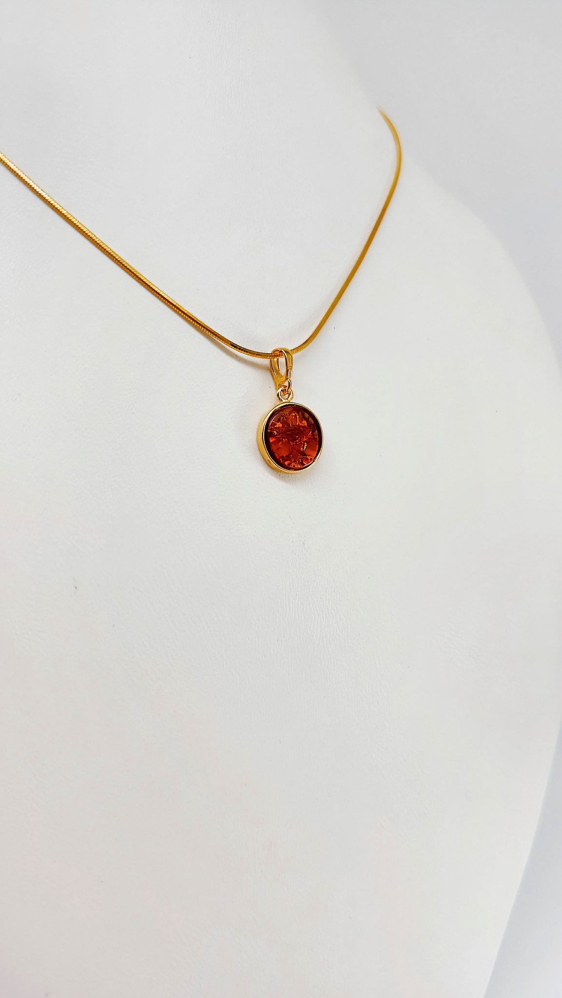 This timeless round pendant combines the natural beauty of amber with a sophisticated, gold-plated setting. The warm, luminous glow of the amber is perfectly enhanced by the gold frame, creating an elegant yet understated piece of jewelry. Wear this pendant as a symbol of permanence and grace. The pendant is versatile and makes a perfect gift for special occasions or as an everyday companion.