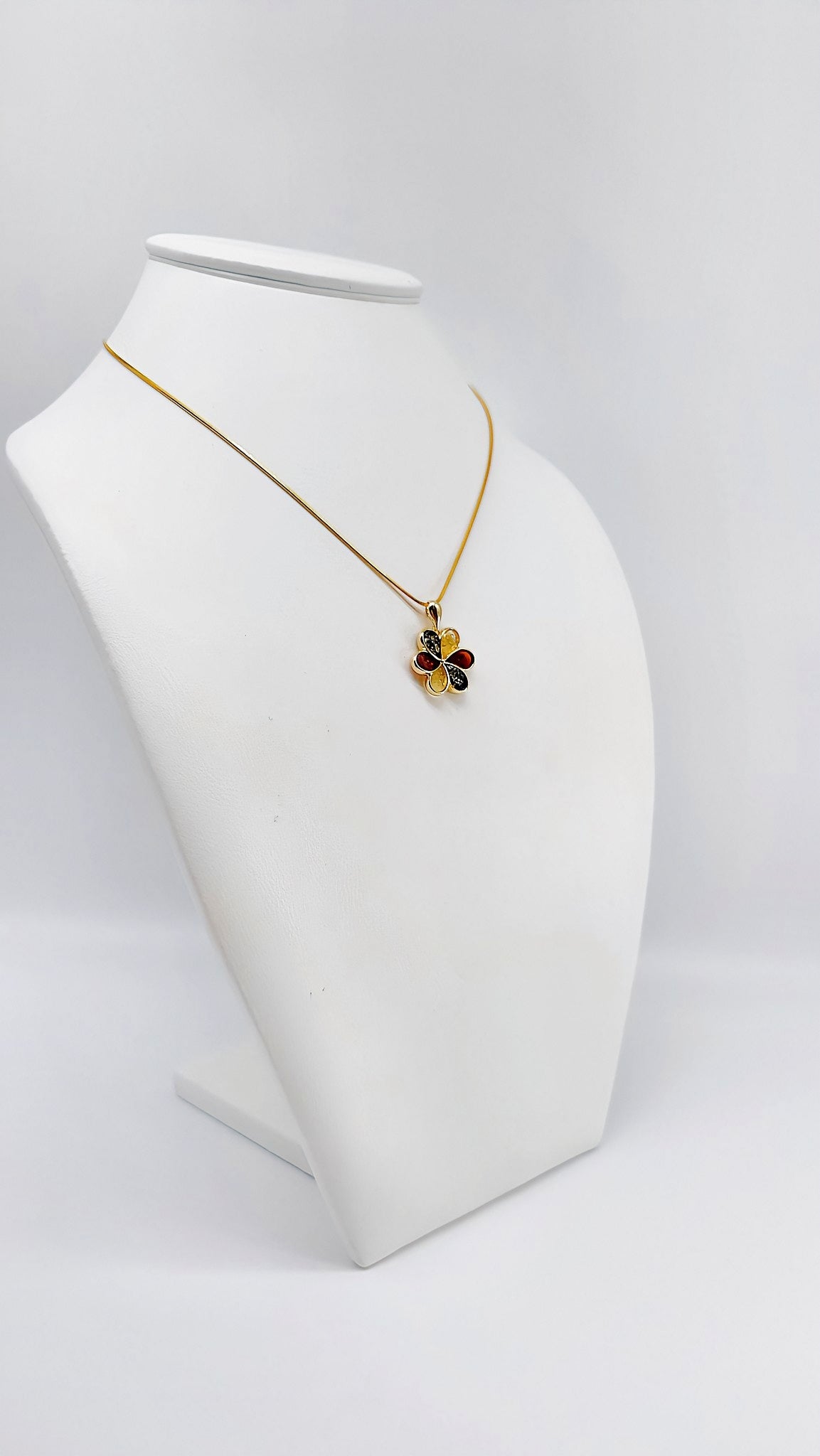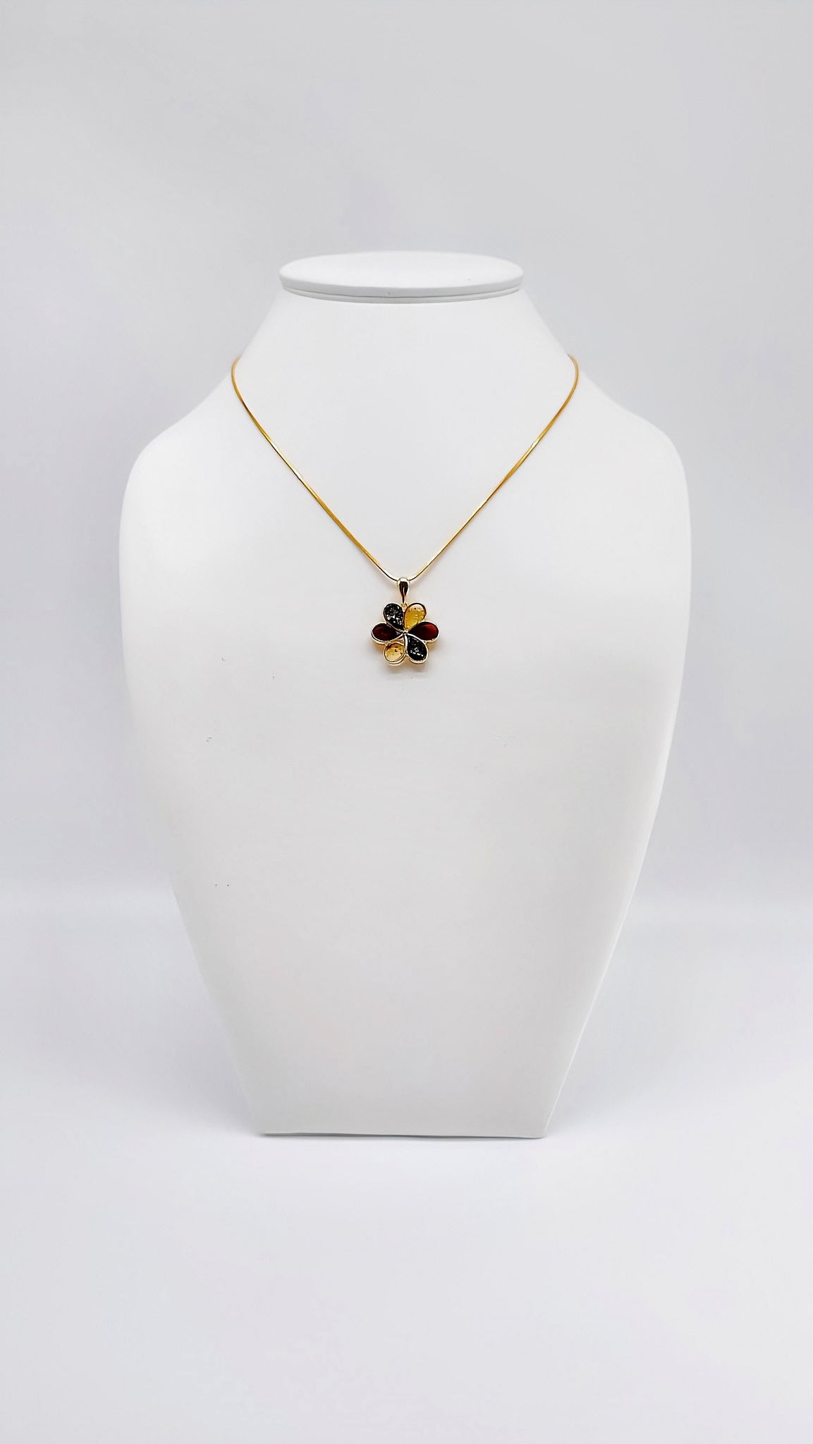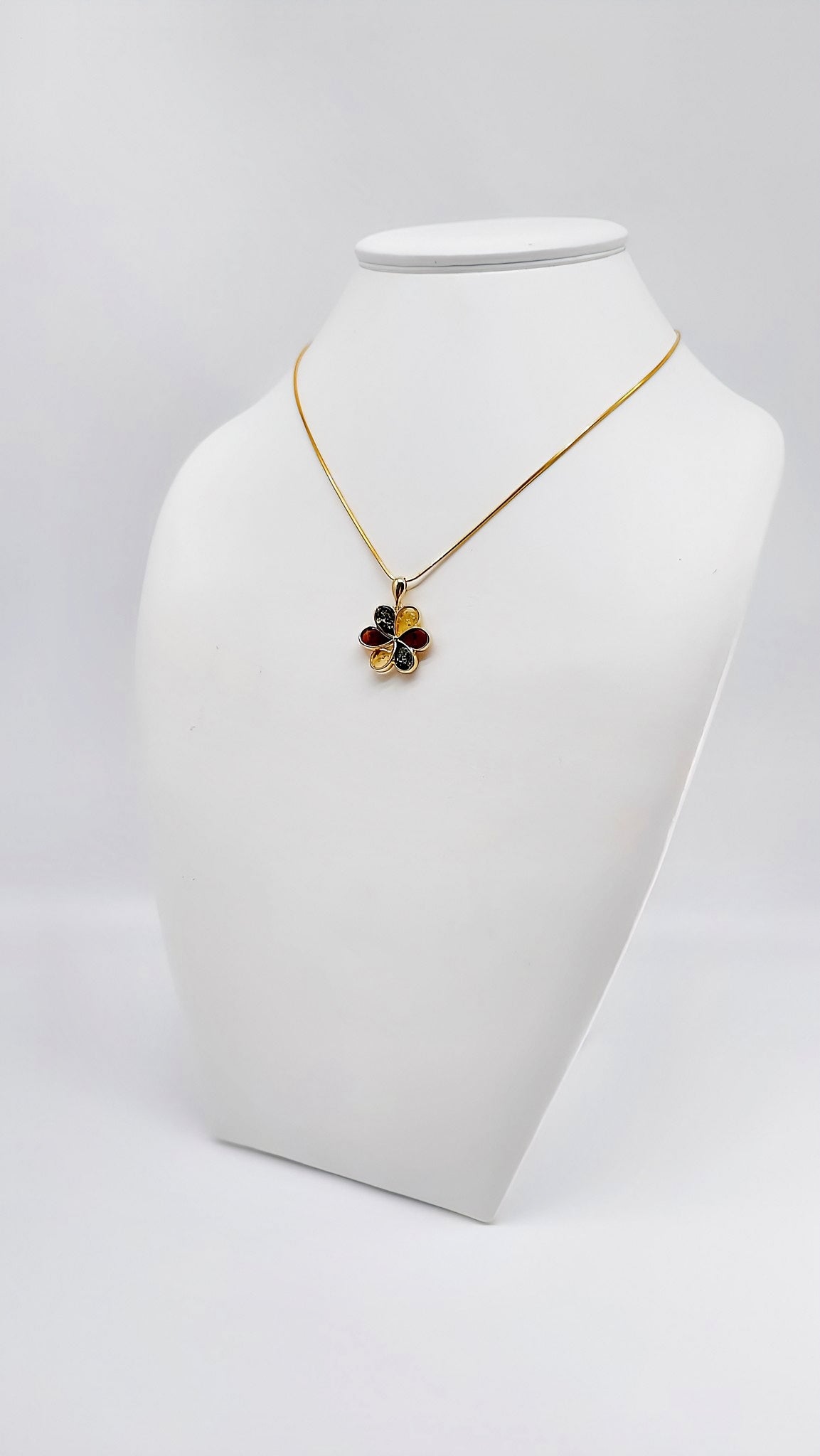 This enchanting pendant captivates with its elegant flower shape and the sophisticated combination of gold-plated silver and amber. The various shades of amber lend the piece a special charm and make it a real eye-catcher. Perfect for special occasions or to add a touch of elegance to your everyday life.