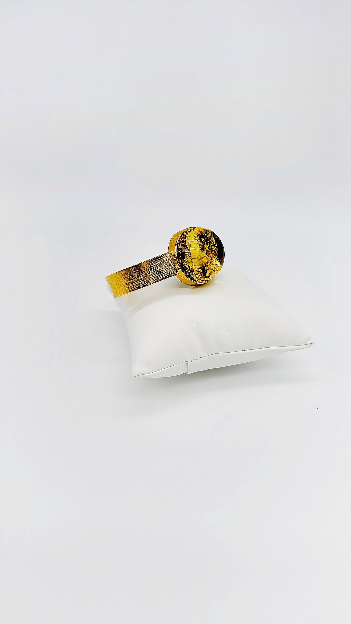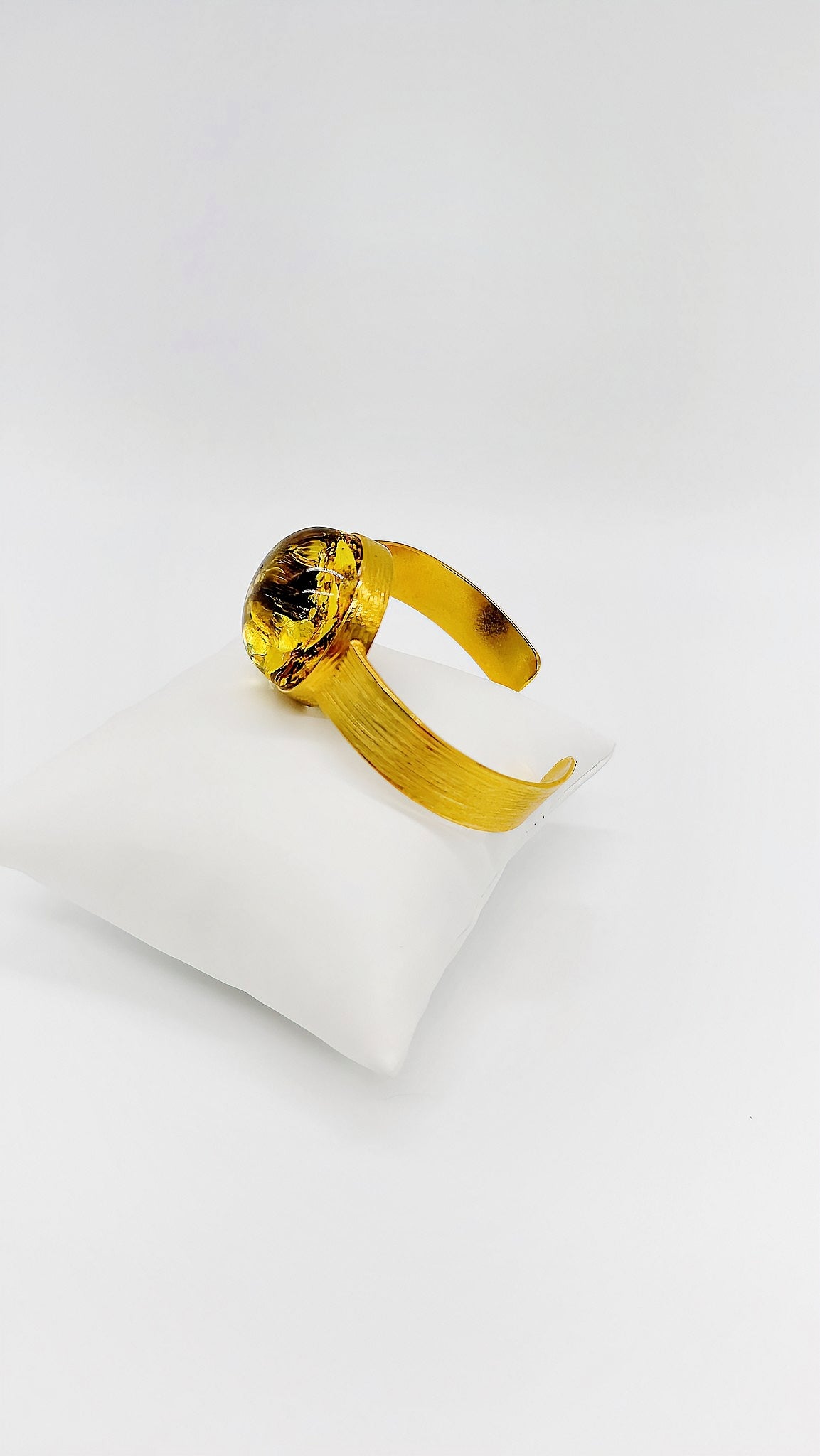 This exquisite bangle is truly unique, captivating with its stunning green amber. The amber shimmers in mesmerizing shades of green and is set in an elegant, gold-colored clasp. The finely textured surface of the bangle lends the piece additional sophistication and elegance. Perfect for special occasions or to add a touch of luxury to your everyday outfit, this bangle is a true highlight for any jewelry lover.