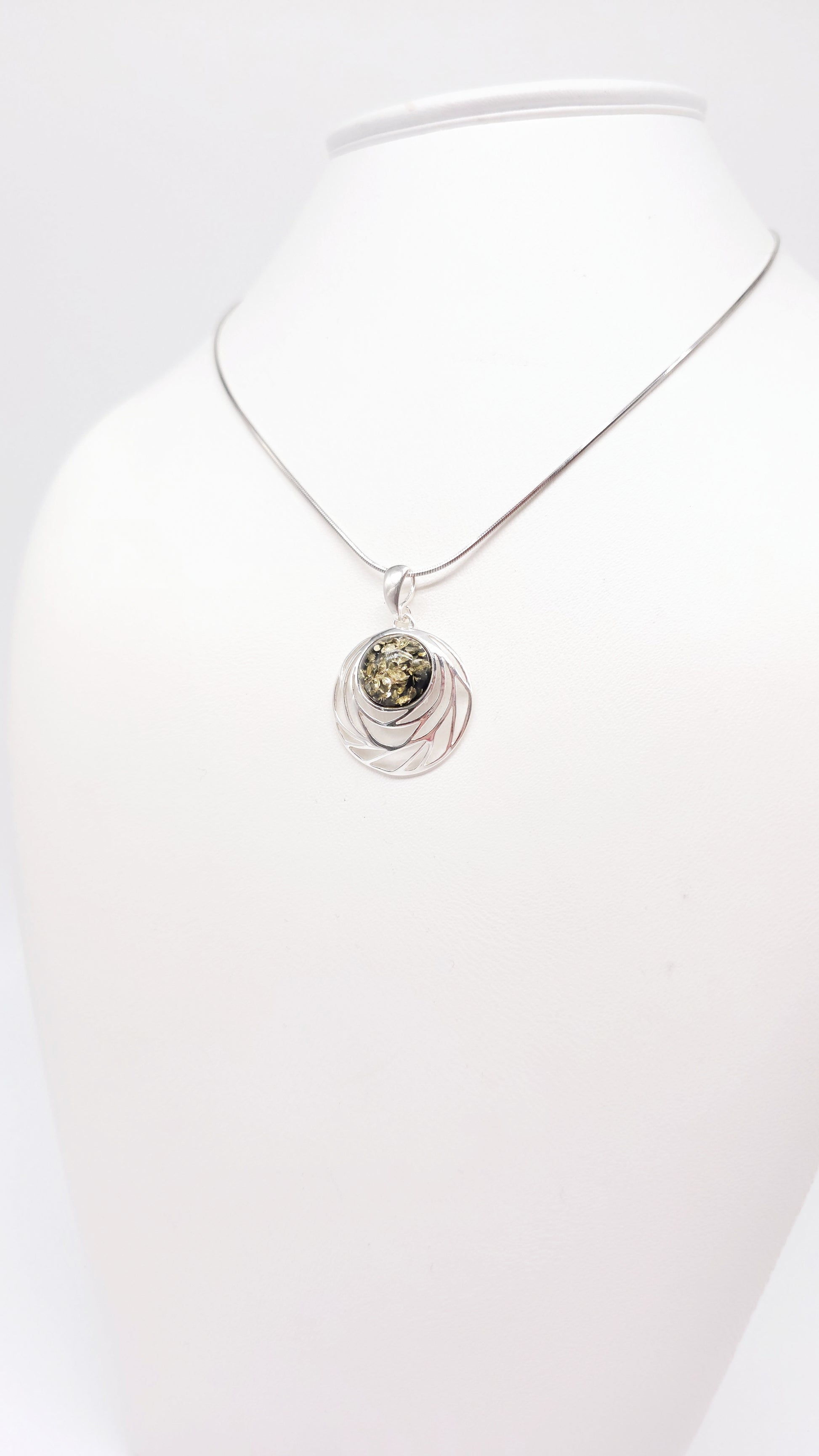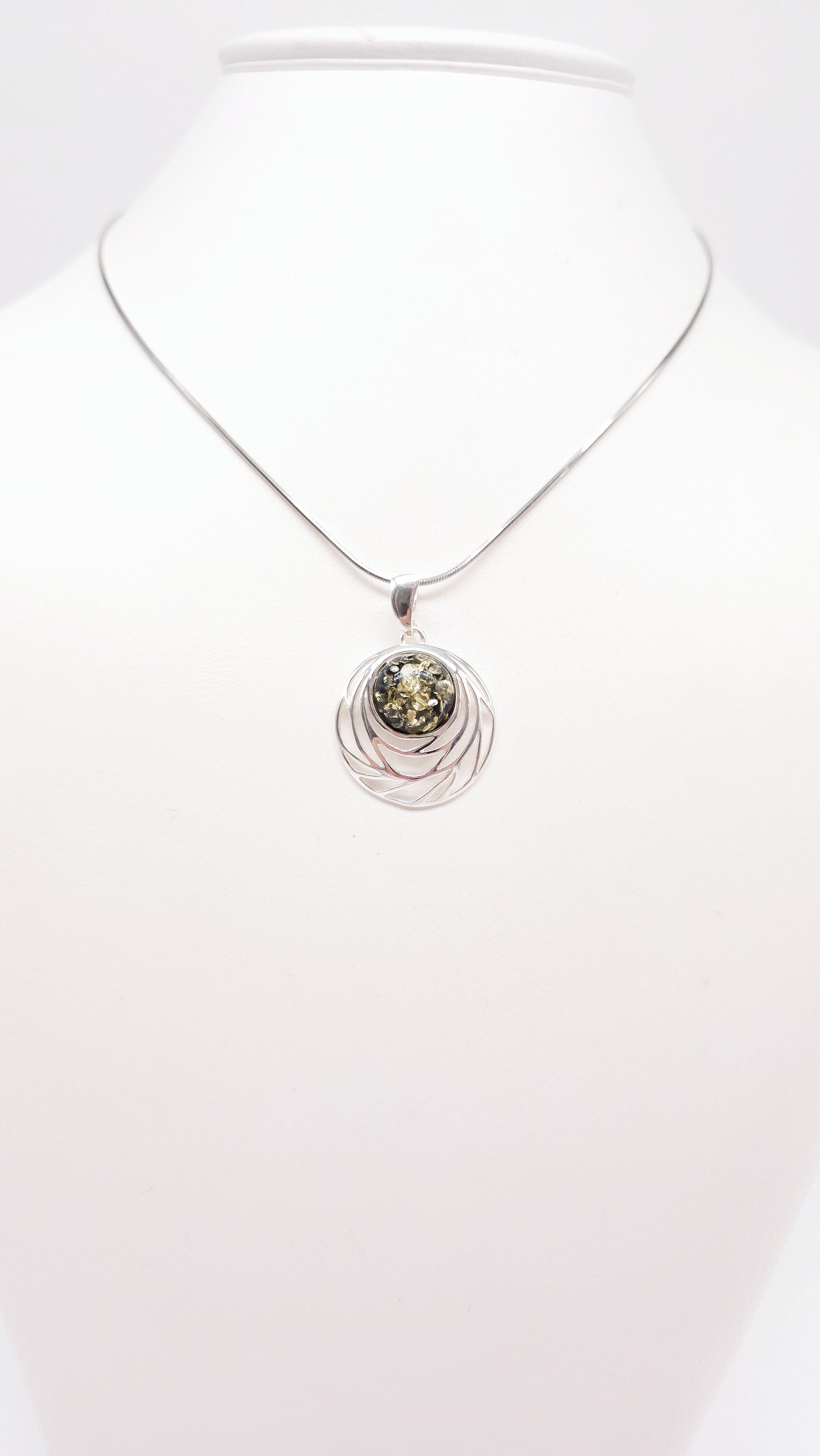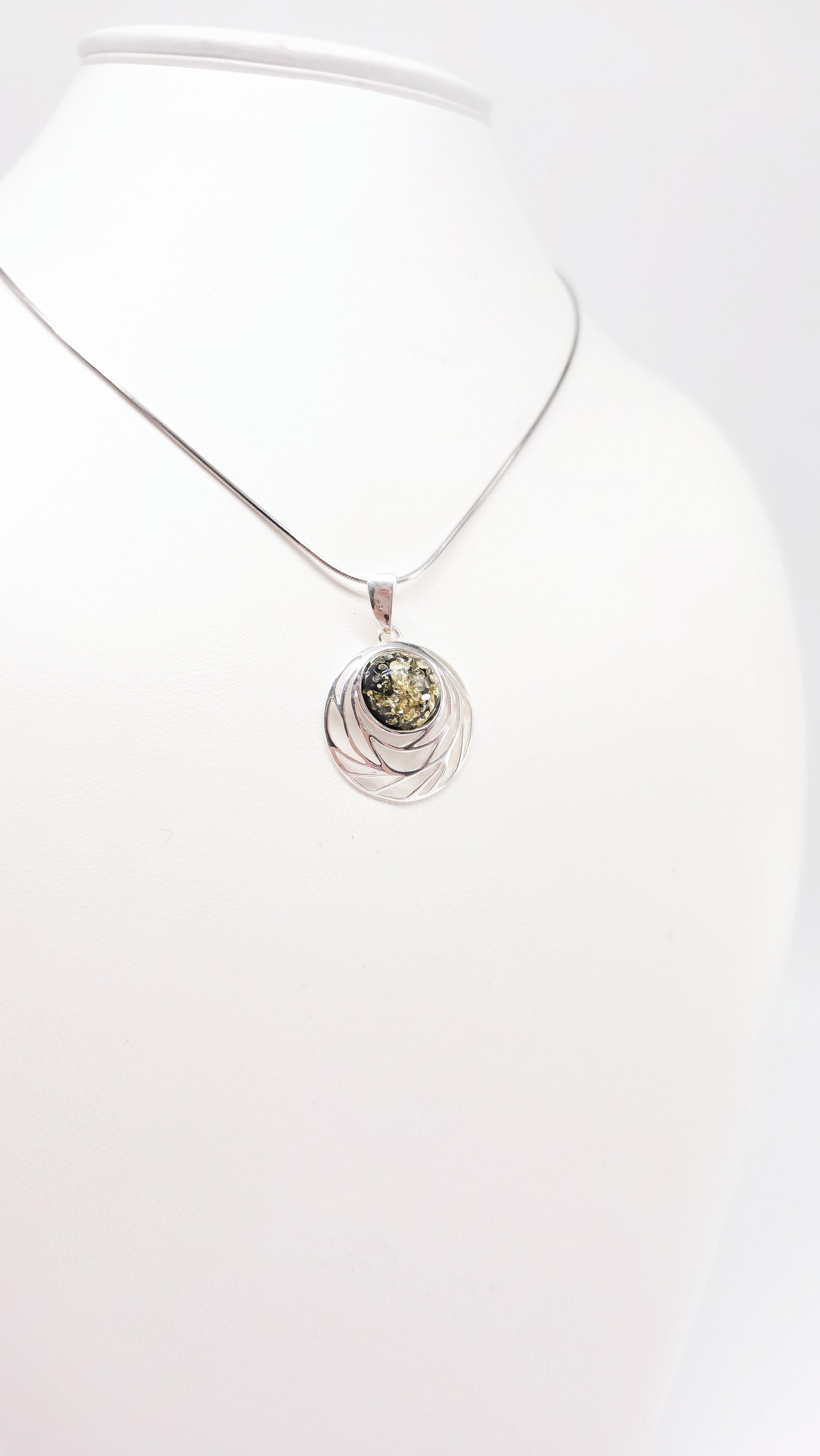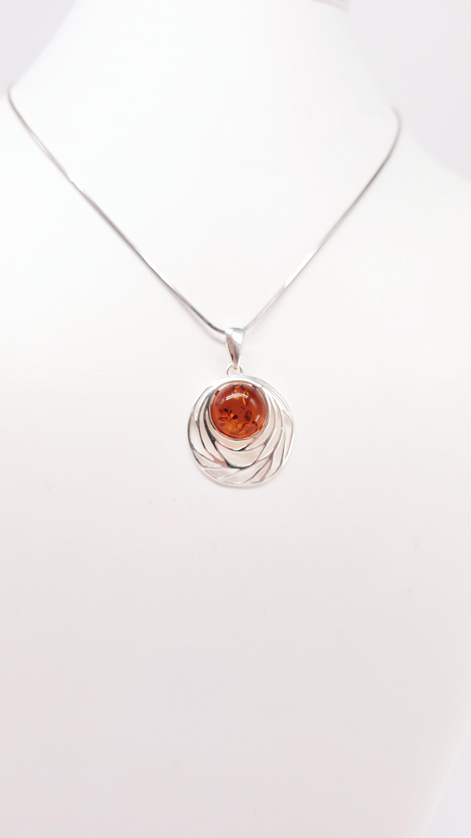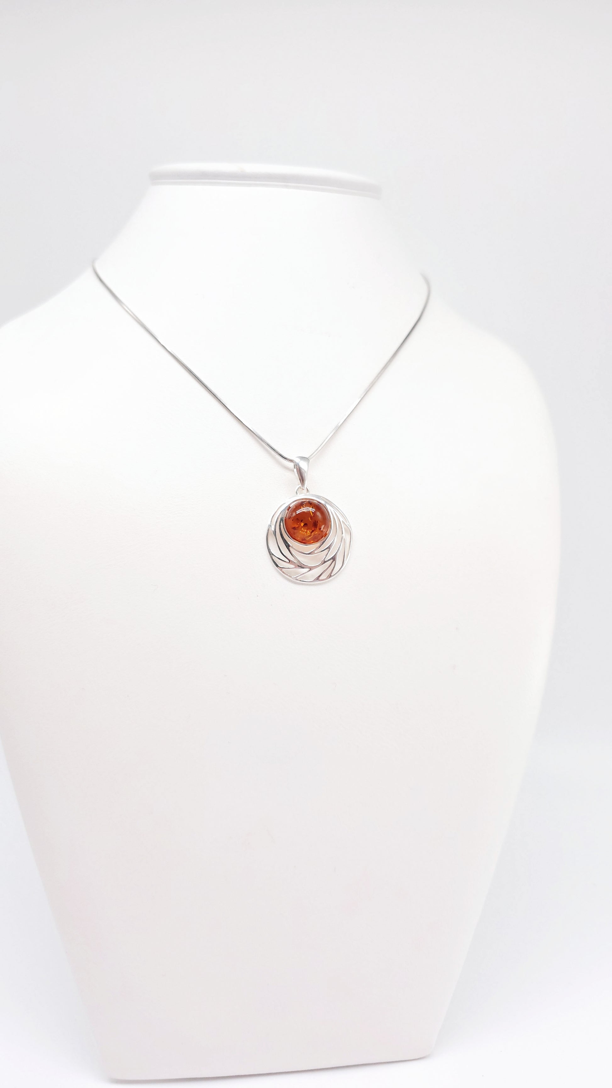 This artistic round pendant made of high-quality 925 sterling silver is set with a radiant amber stone. The warm tones of the amber complement the lustrous silver beautifully, giving the piece a sophisticated and timeless appeal. The unique design with curved lines makes this pendant a true eye-catcher. Perfect for everyday wear or special occasions, this pendant is an ideal accessory or a special gift for your loved ones.