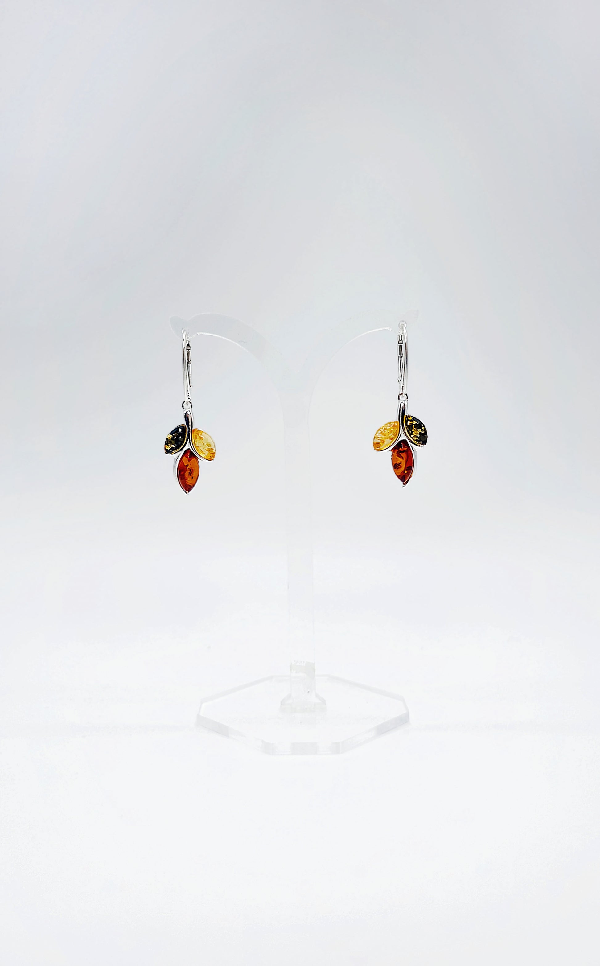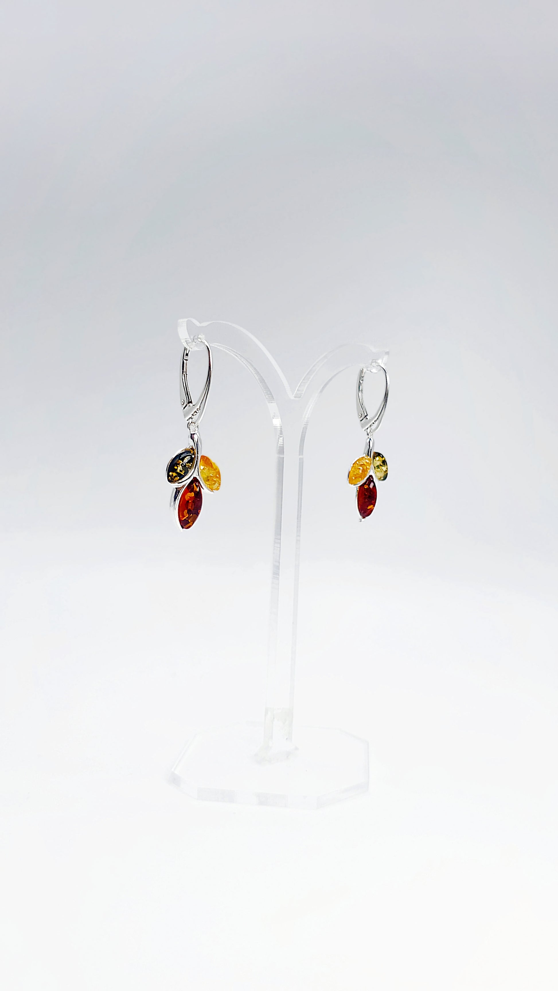 These colorful silver amber earrings are a true eye-catcher. The earrings combine amber in various colors—yellow, green, and red—arranged in a stylish leaf shape. The shiny silver setting perfectly showcases the vibrant colors of the amber. These earrings are the ideal accessory for special occasions or to add a cheerful and elegant touch to your everyday look.