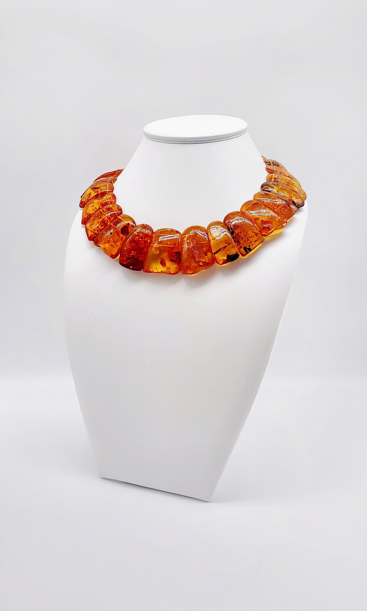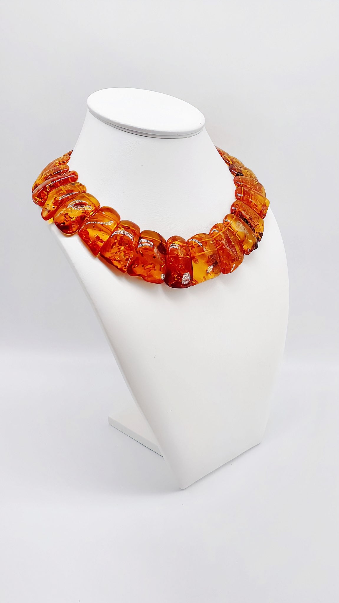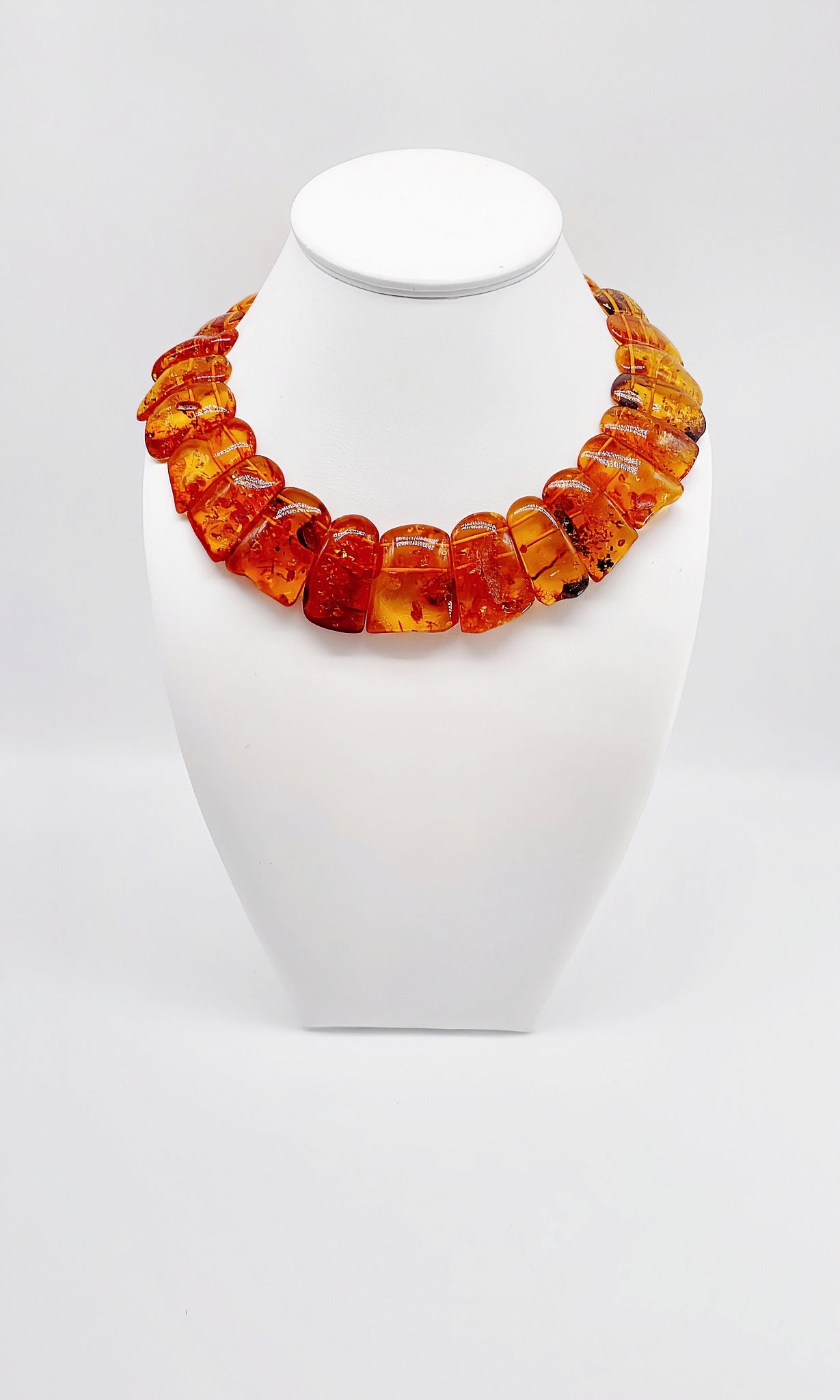 This stunning amber necklace captivates with its deep red, almost fiery color and meticulous craftsmanship. Each amber bead has been individually selected and artfully crafted to create a unique piece of jewelry. The smooth surface of the beads reflects the light and gives the necklace an extraordinary shine. Ideal for special occasions or as a luxurious everyday accessory.