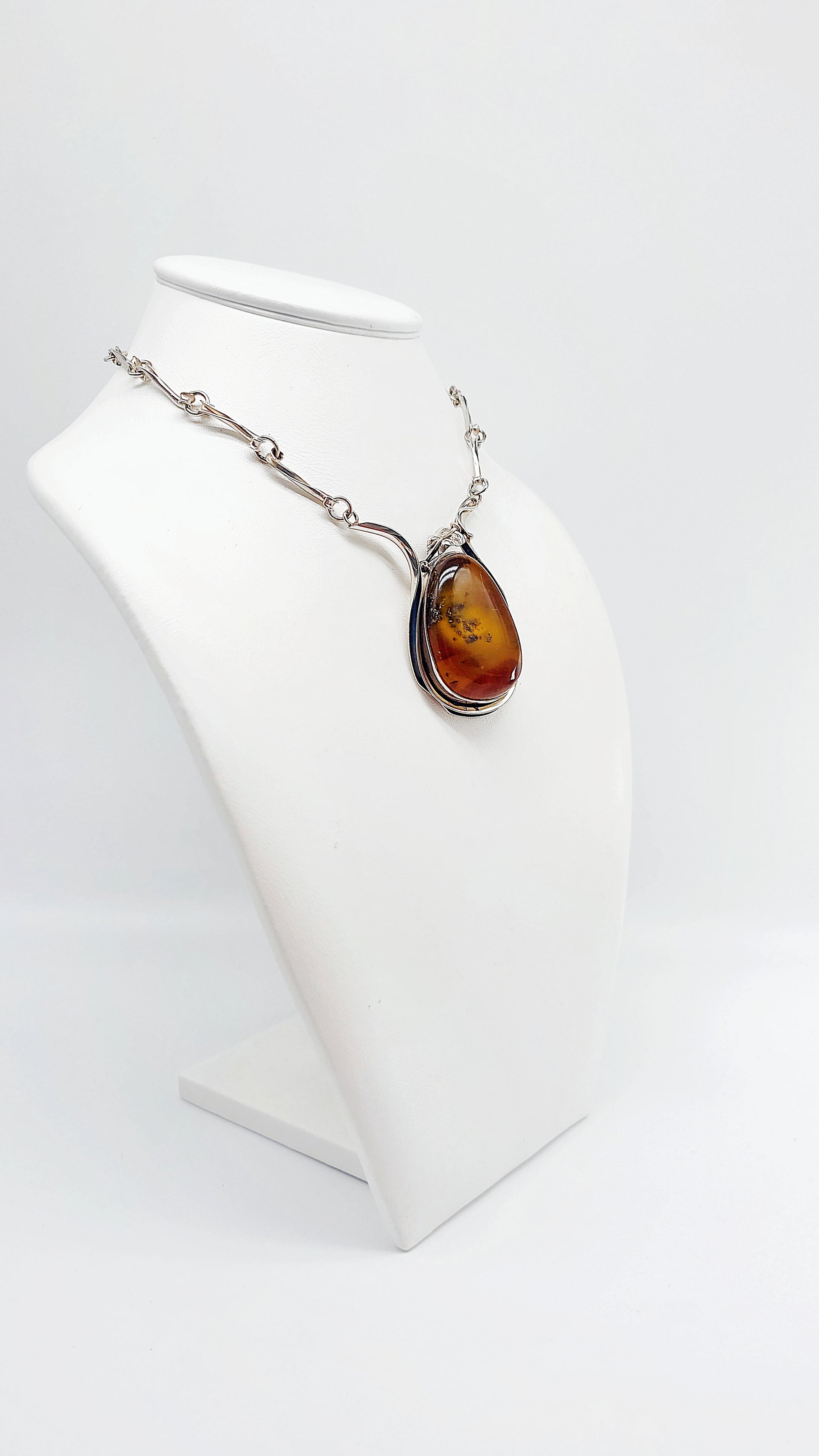 This elegant amber pendant combines the warm, natural beauty of amber with an artistic silver setting. The vibrant golden amber, framed by delicate silver, draws all eyes and adds a special touch to any outfit. Each pendant is unique and distinguished by its individual grain and color. This piece of jewelry is perfect for special occasions or to add a touch of elegance and natural beauty to your everyday look.