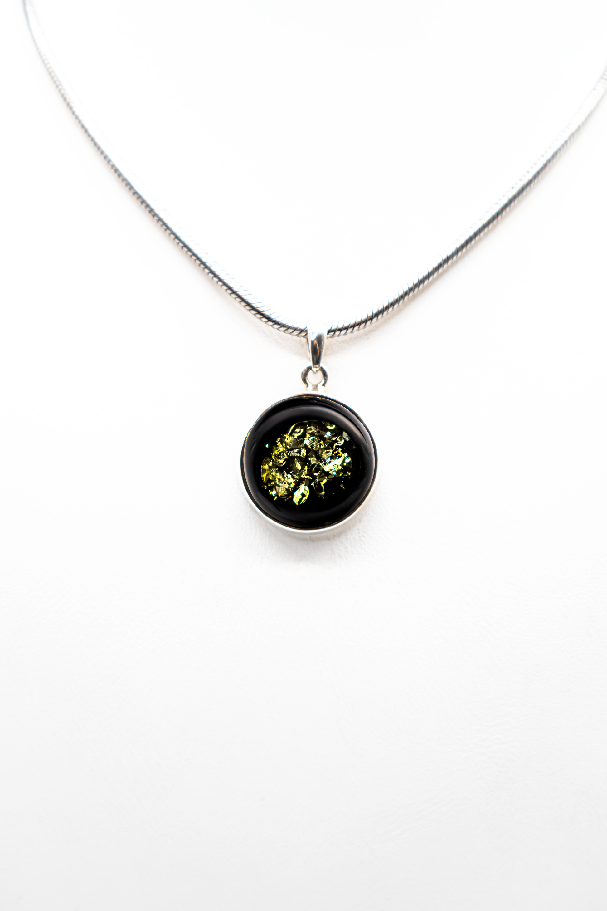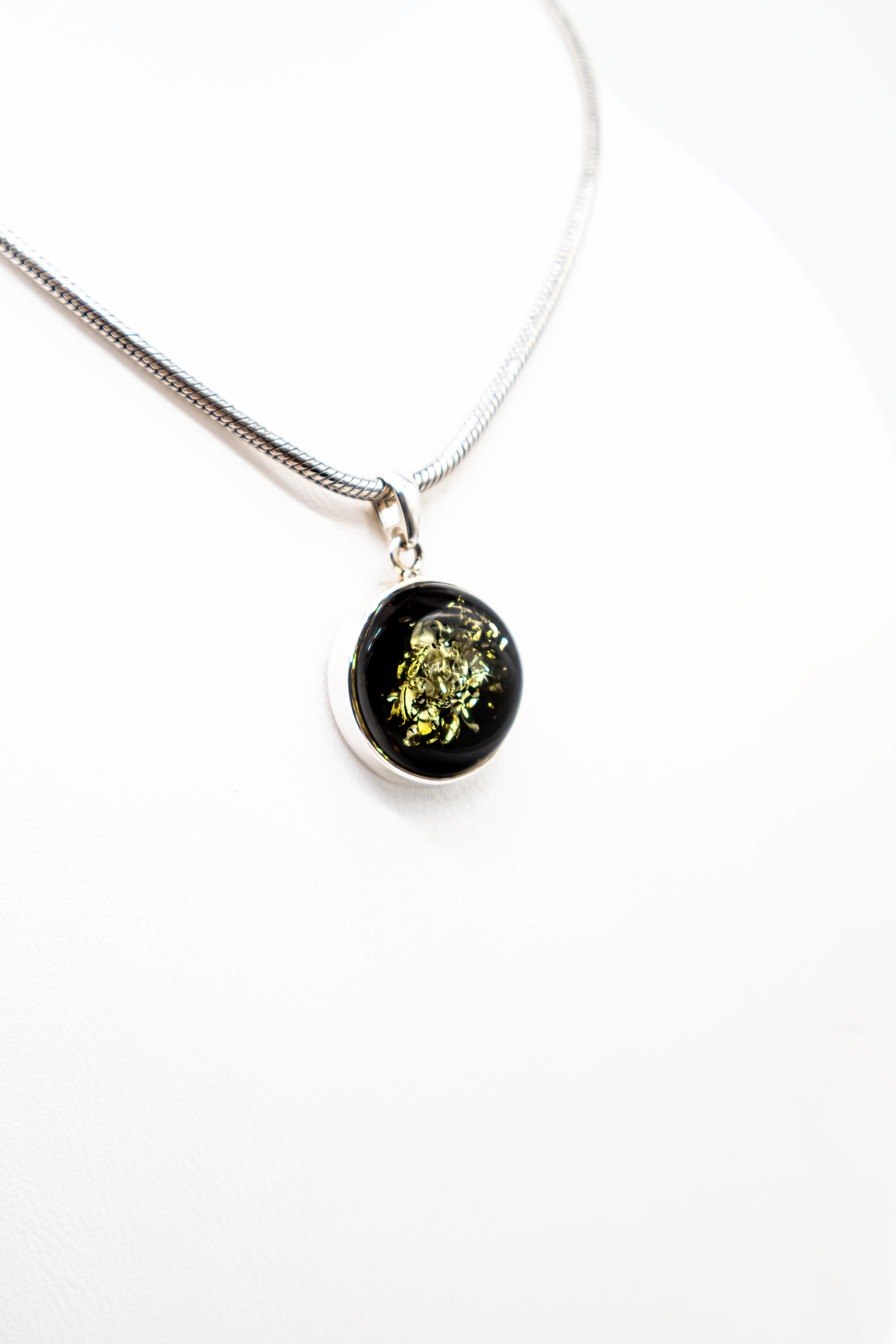 Der tiefgrüne Bernstein zeigt ein lebendiges, leuchtendes Innenmuster, das jeden Anhänger einzigartig macht.