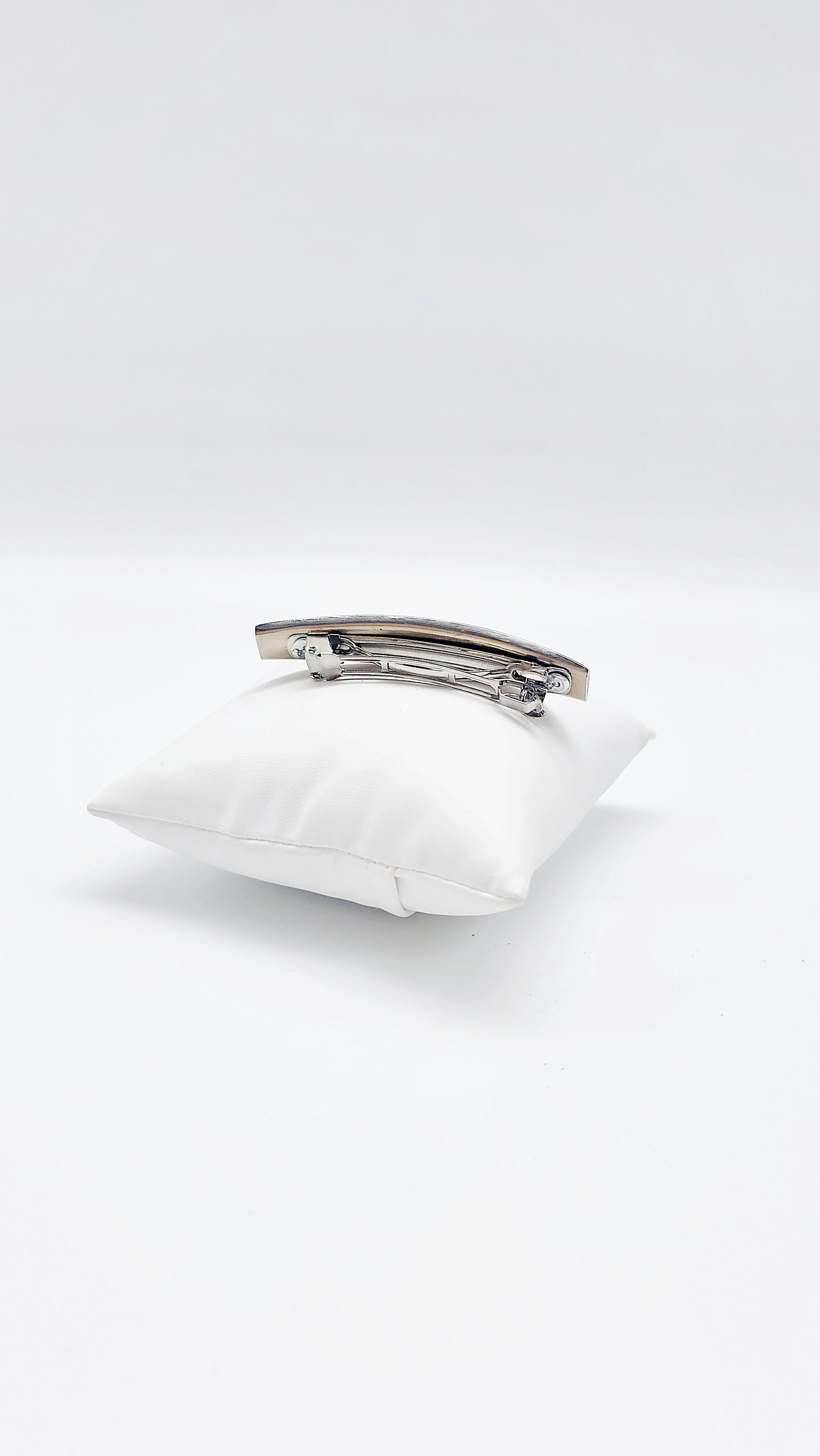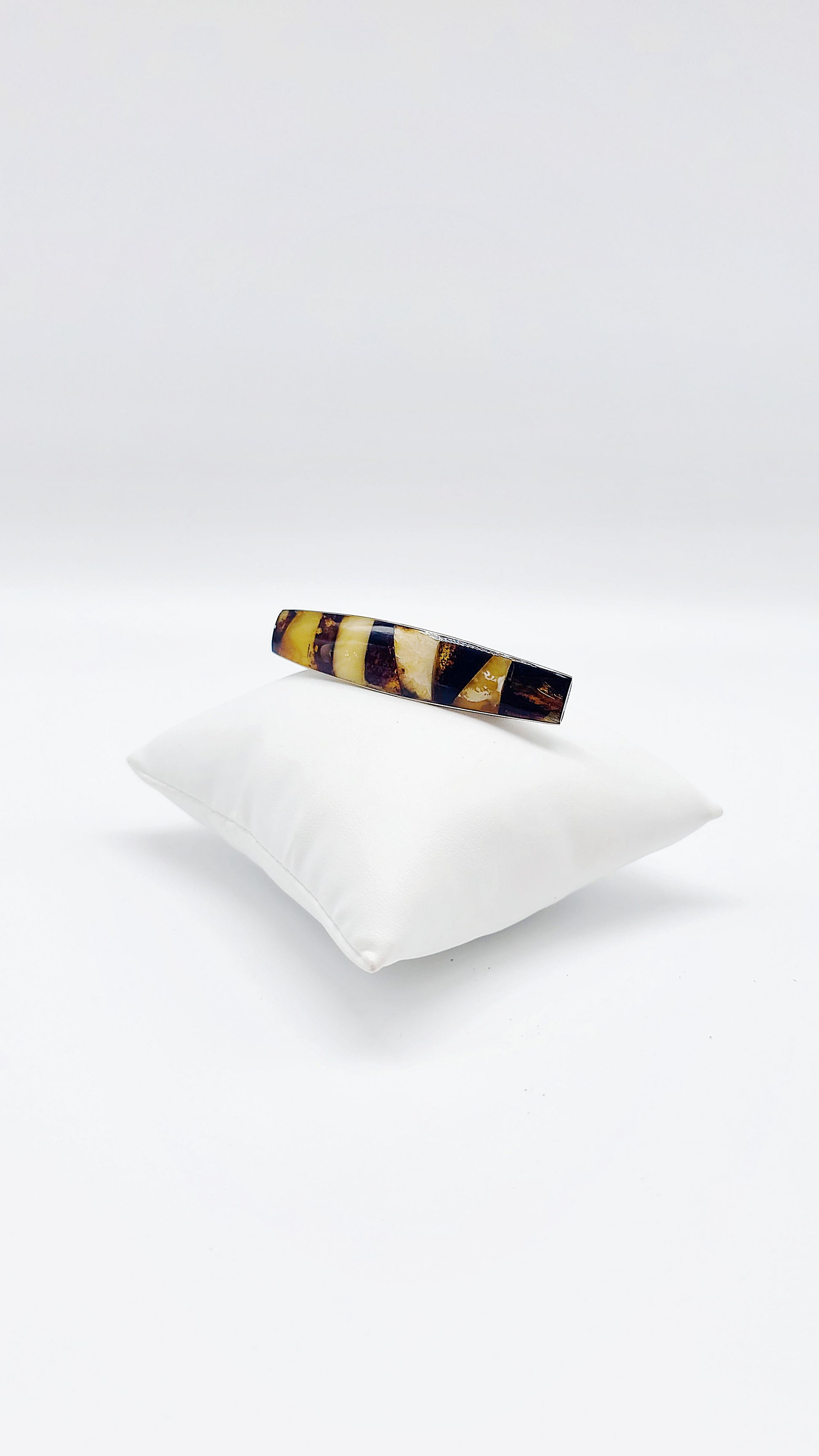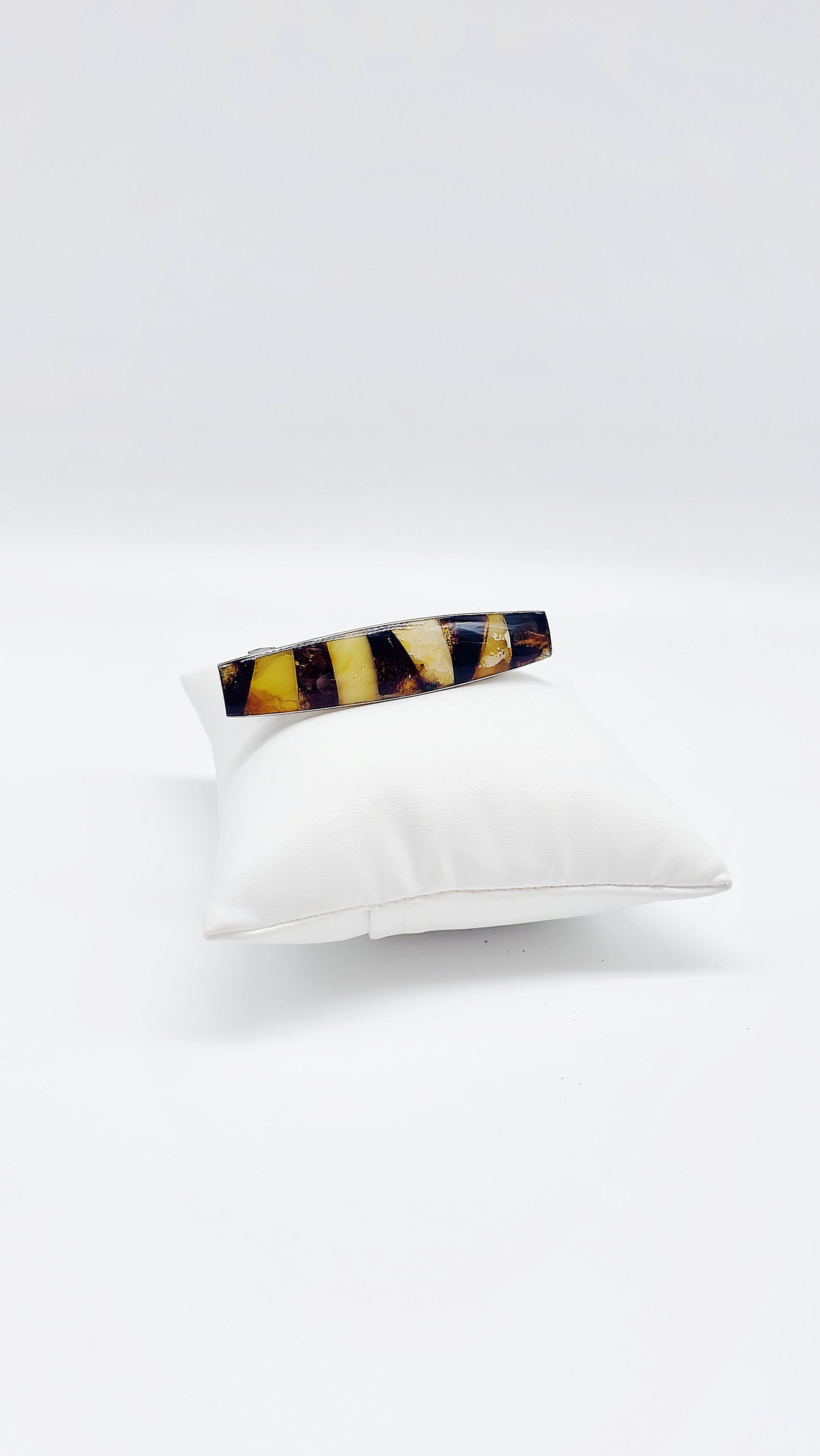 This exquisite hair clip captivates with its unique striped design, composed of various amber stones in warm shades. The harmonious arrangement of the yellow, cognac, and dark red amber stones lends the clip a special charm and style. Perfect for adding an elegant and natural touch to any hairstyle. A stylish accessory for everyday wear and special occasions.