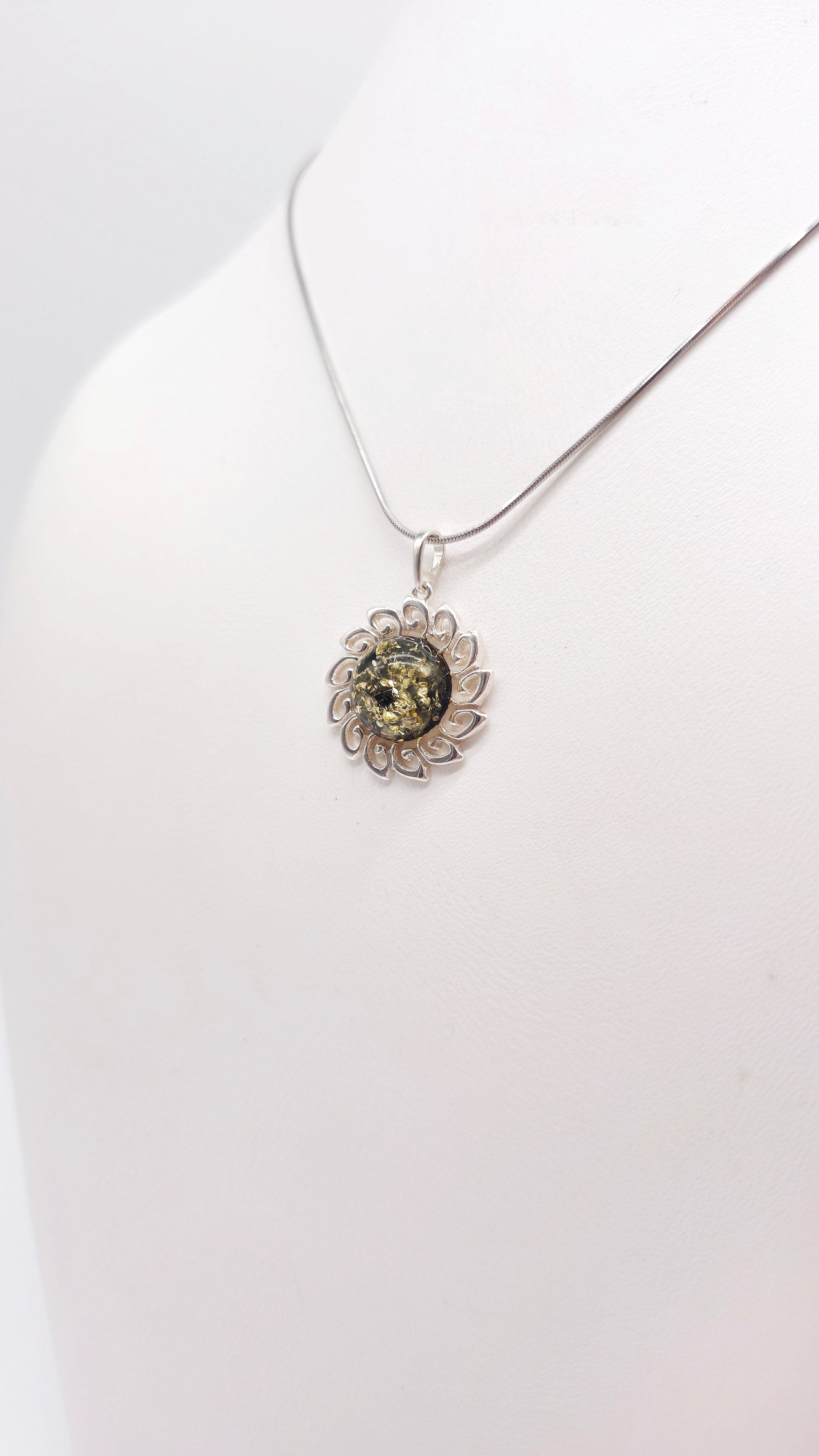 The harmonious combination of amber and filigree sun rays gives this pendant its special charm.
