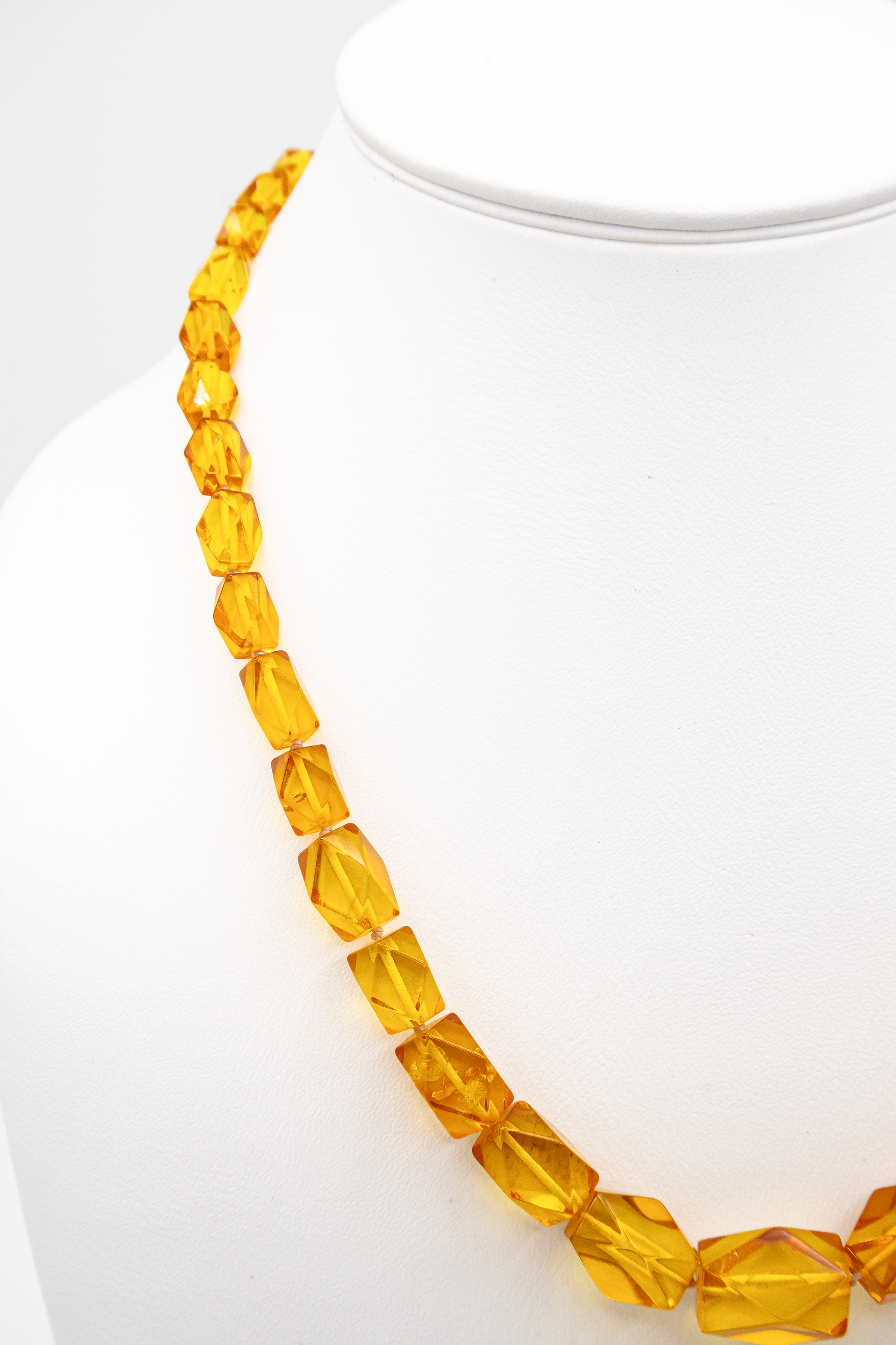 This handmade amber necklace is a truly unique piece in a vintage style. The necklace measures approximately 53 cm in length and features faceted amber beads in a warm yellow hue. Each bead is uniquely crafted and beautifully showcases the natural luster of the genuine amber.