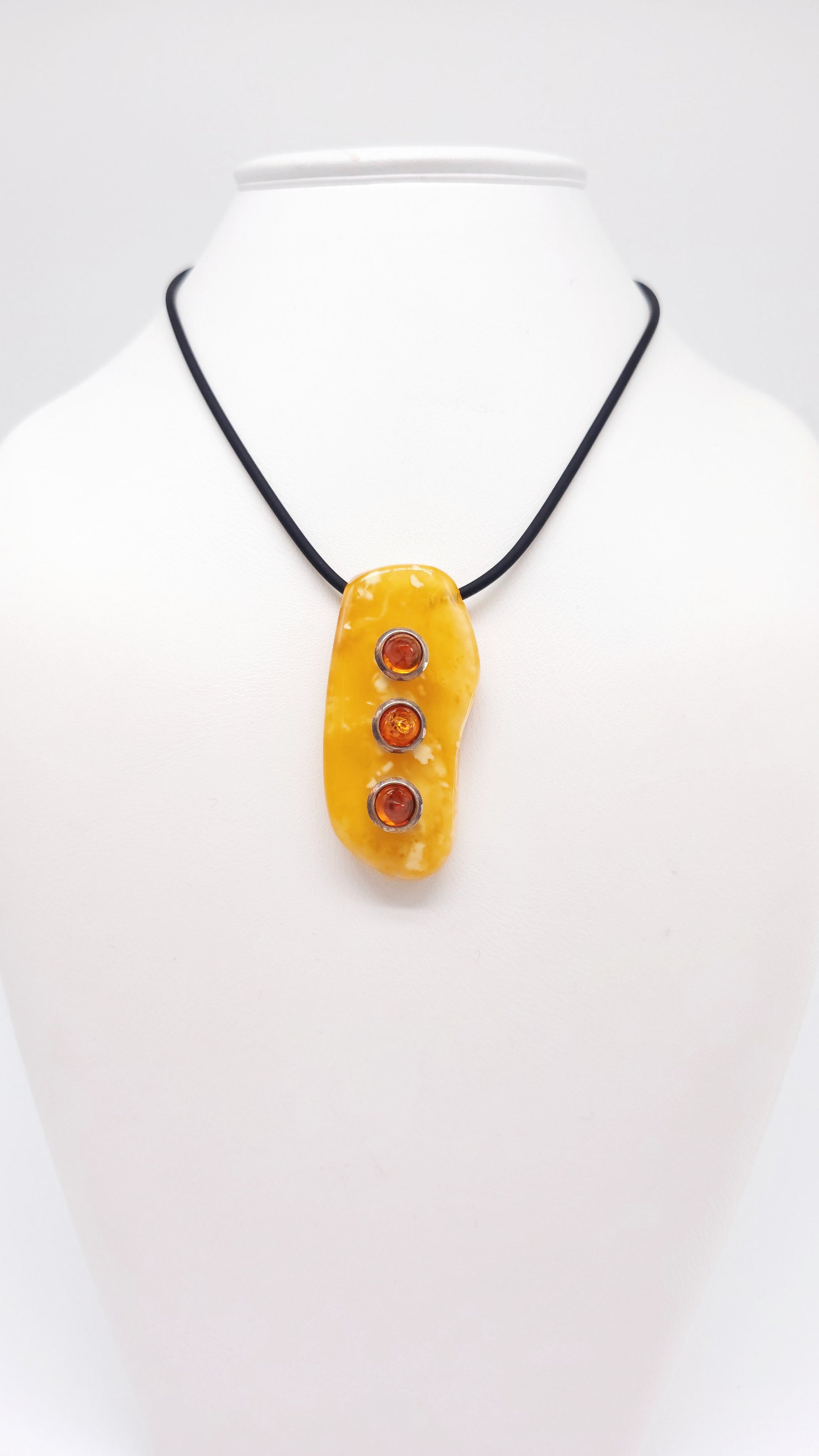 This extraordinary pendant combines minimalist design with a striking statement look. The large butterscotch amber stone, thanks to its three inset round elements, appears particularly modern and expressive. Measuring 6.2 cm x 3 cm, the piece is a real eye-catcher – ideal for anyone who loves stylish, unique pieces with character.