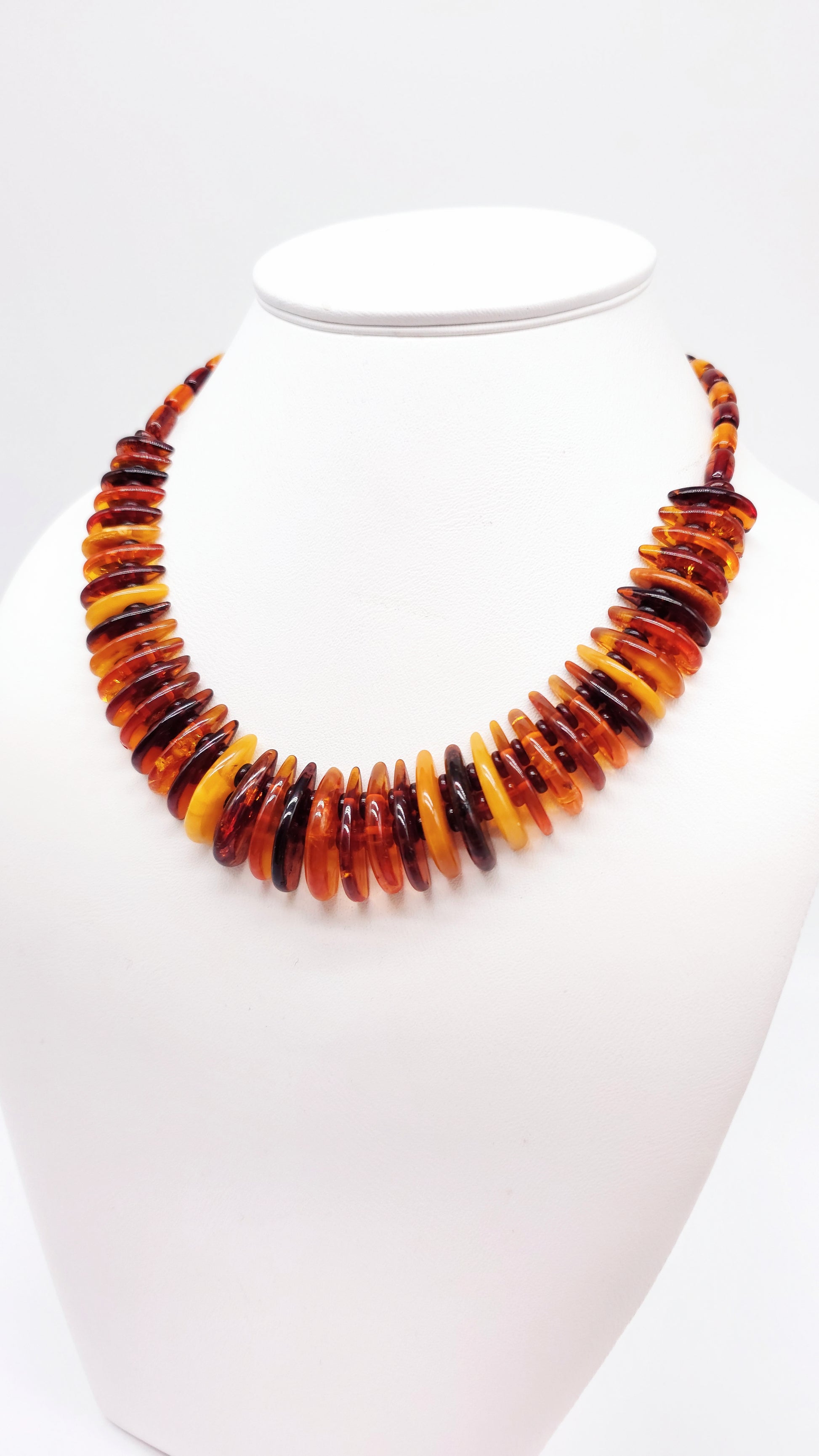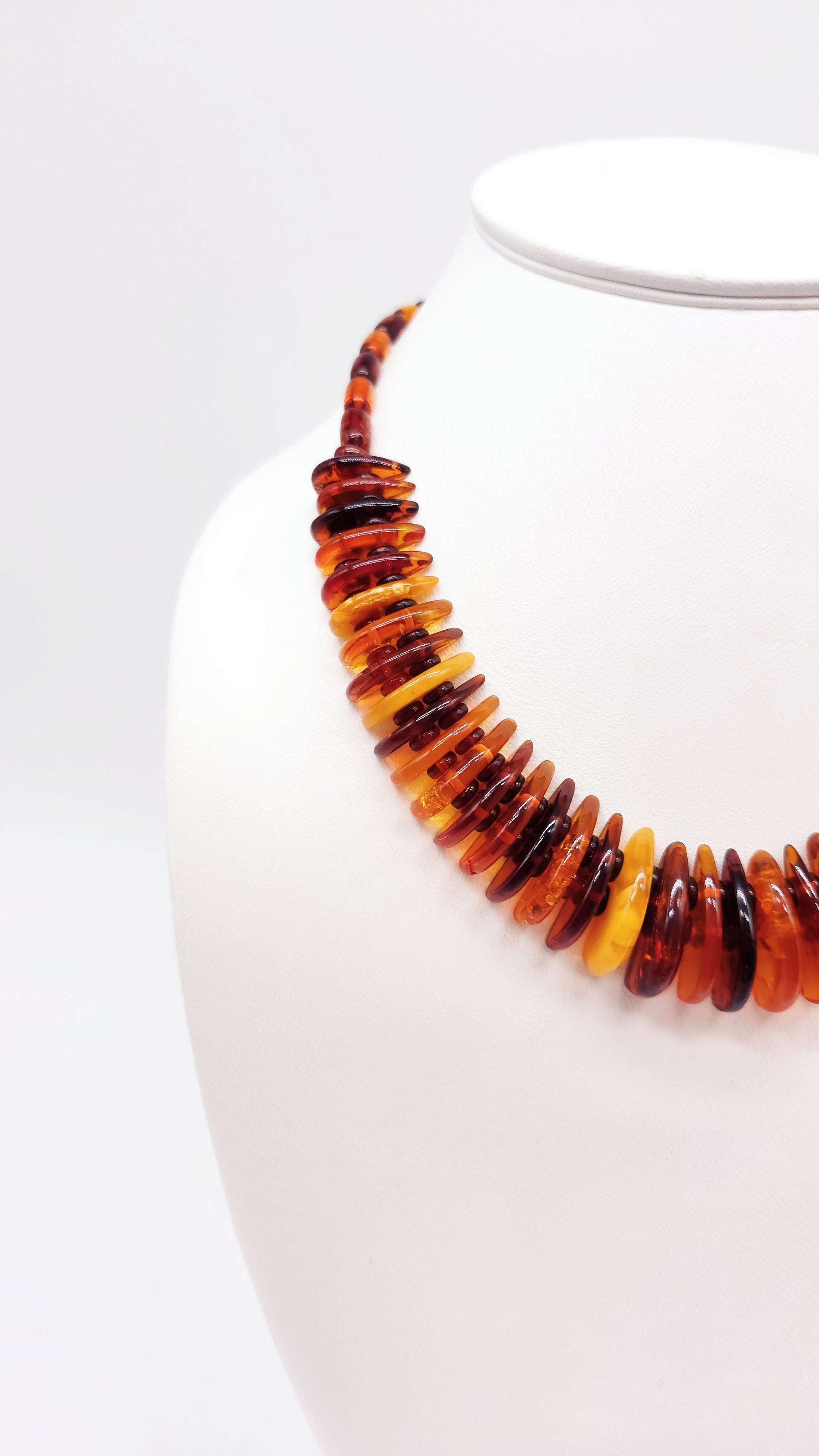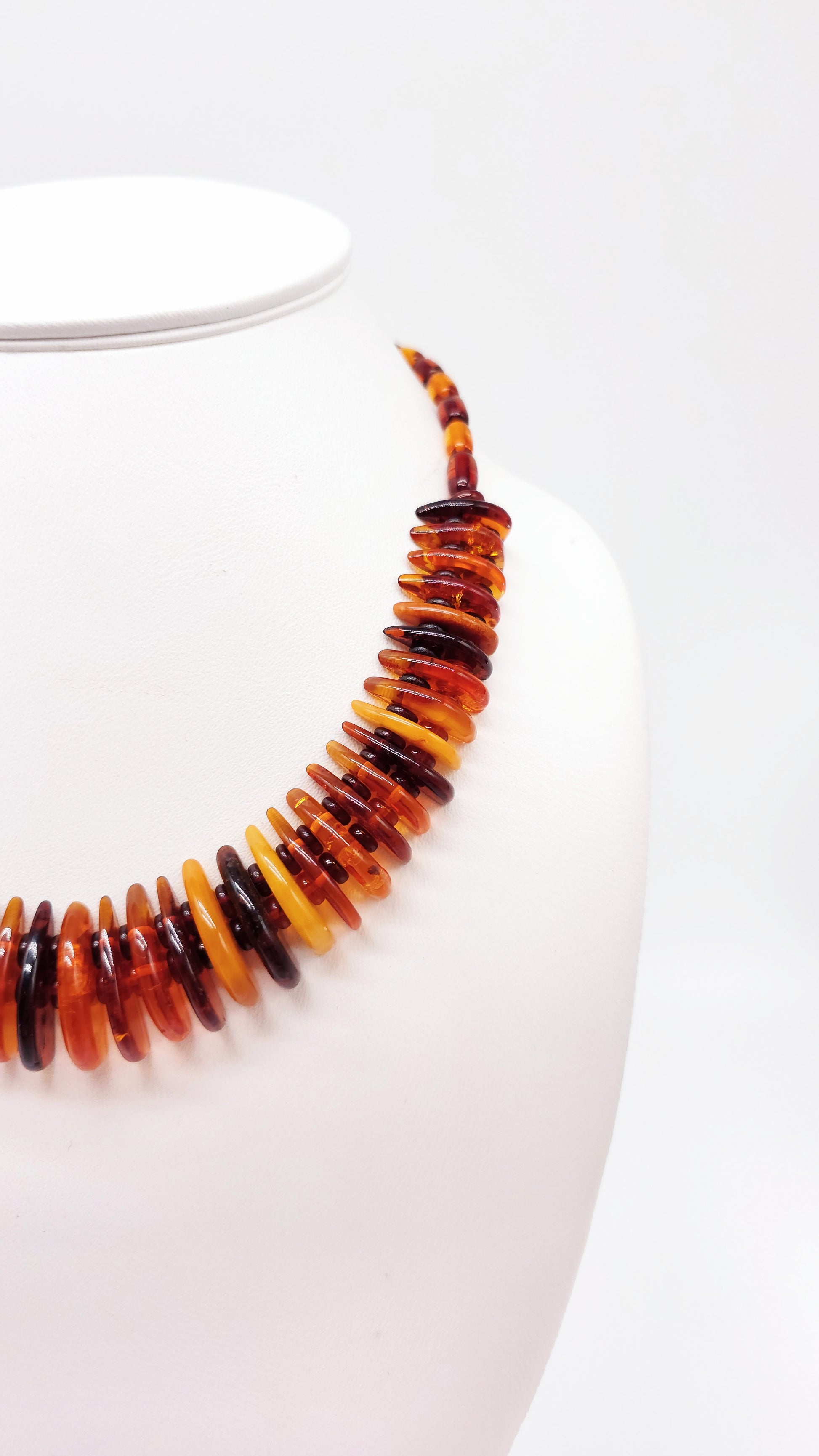 This handcrafted amber necklace is a true statement piece—impressive in color, shape, and style. The lovingly cut stones in various amber shades create a vibrant gradient that ranges from golden yellow to deep cognac. The solid, approximately 3 cm wide necklace has a comfortable length of 46 cm and is securely fastened with a practical screw clasp. An expressive necklace for special occasions or as a stylish everyday highlight.