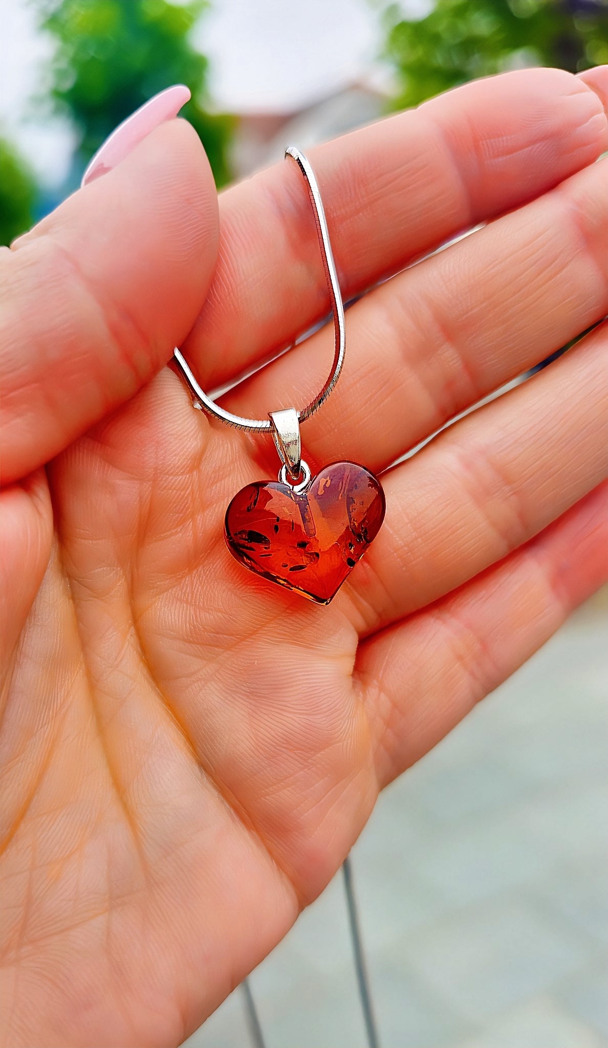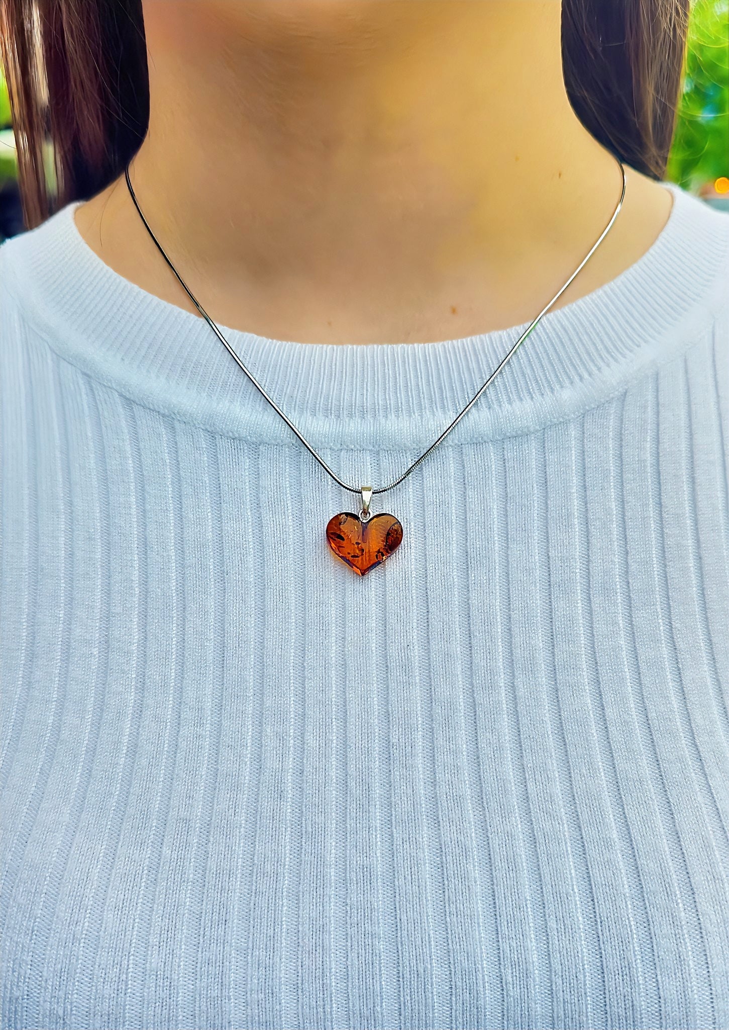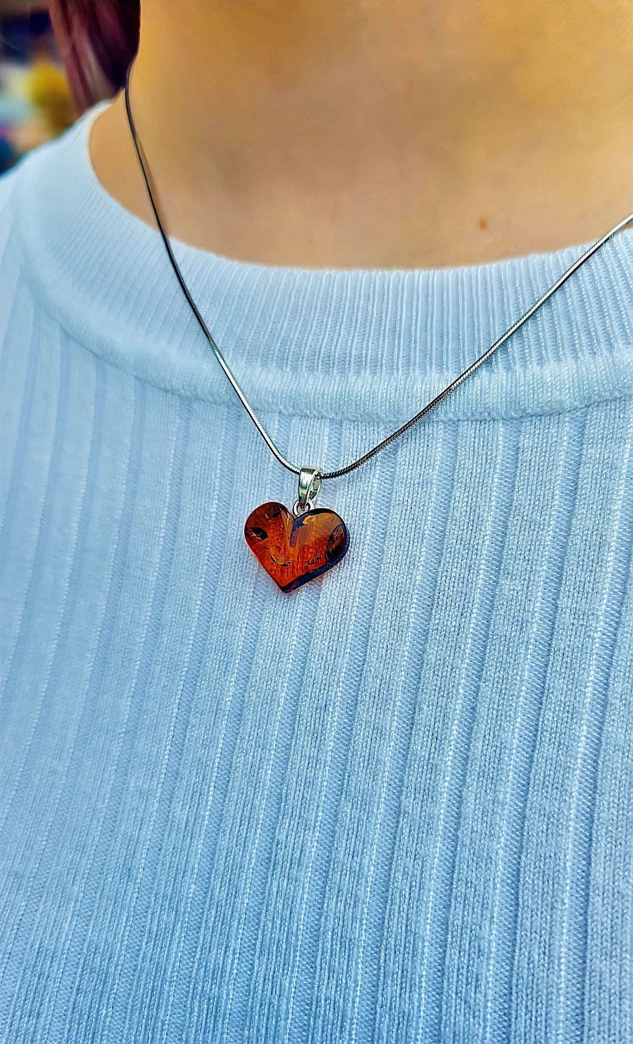 This beautiful heart pendant combines the natural warmth of amber with the cool elegance of 925 sterling silver. The deep, luminous brown of the amber is perfectly enhanced by the simple silver setting, giving this piece of jewelry a timeless beauty. Ideal as a gift or as an everyday accessory, adding a romantic and elegant touch to any outfit.