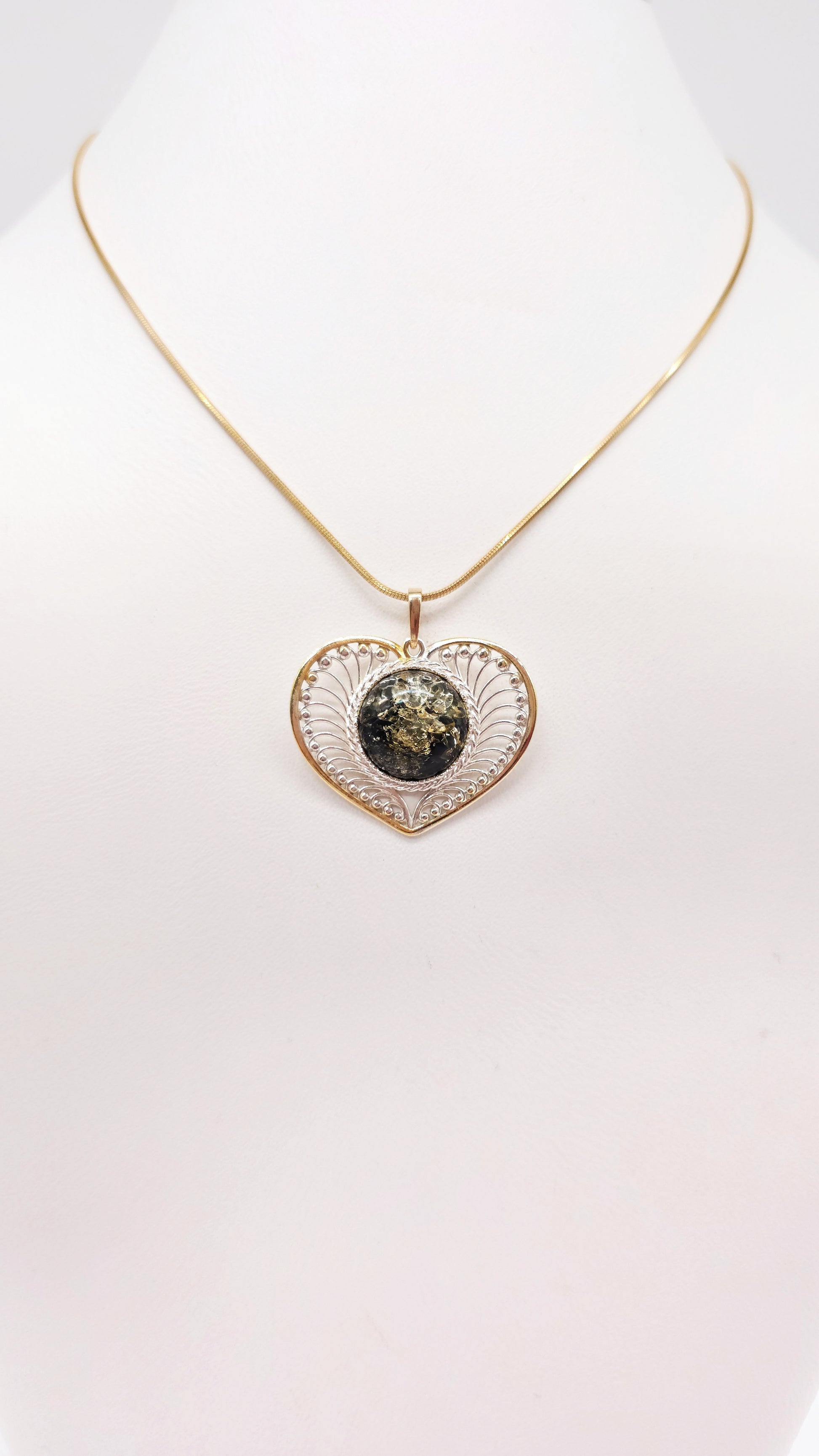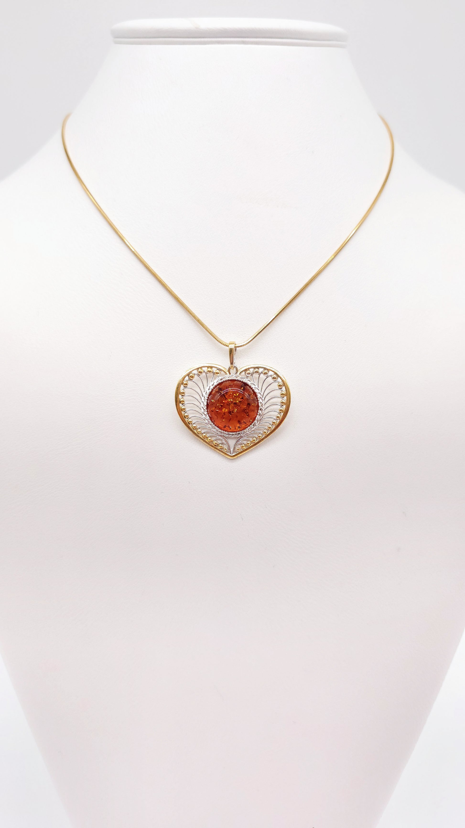 This elegant heart pendant crafted from 925 sterling silver combines classic romance with natural elegance. The pendant features an expressive heart motif enhanced by genuine natural amber. Gold-plated accents underscore the luxurious design and perfectly showcase the warm amber color.