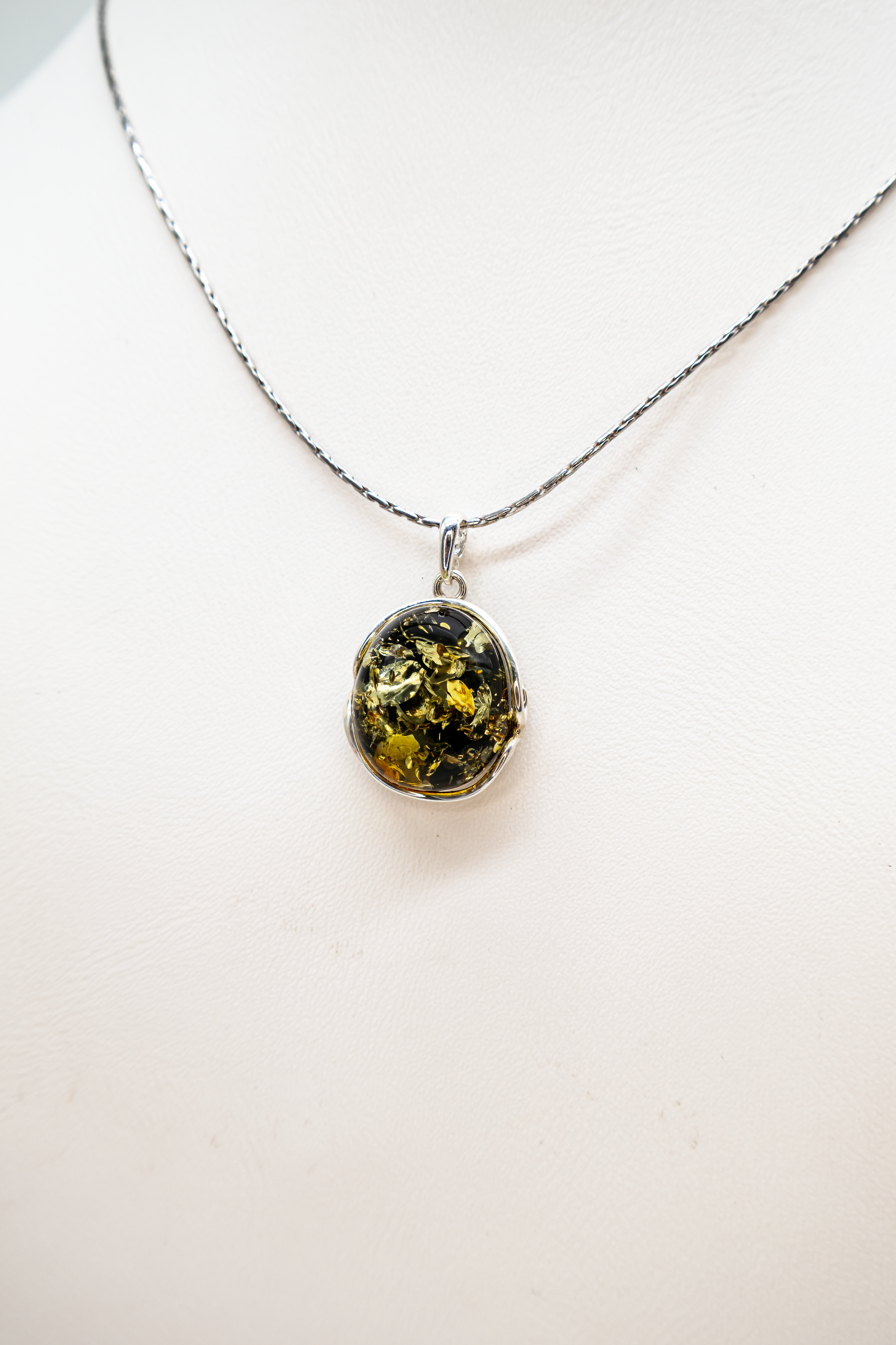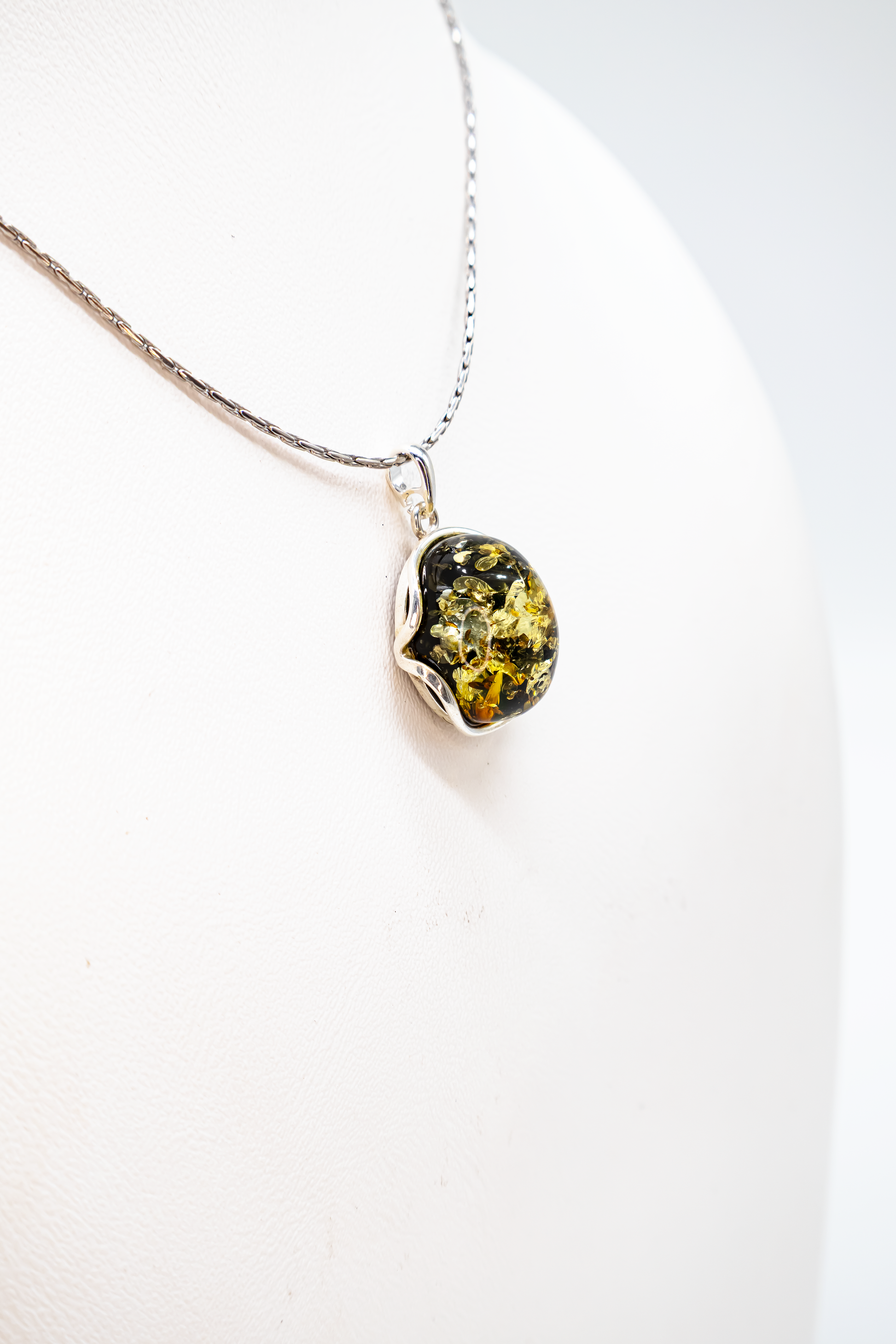 This handcrafted silver pendant with a unique, greenish shimmering amber is truly one-of-a-kind. The natural structure of the amber captures the light impressively, making each piece unique and one-of-a-kind. Combining the refined elegance of silver with the warm radiance of amber, the pendant makes a perfect special gift for women—whether for a wife, sister, or close friend. It's also ideal for lovers of vintage jewelry and unique, meaningful accessories. A stylish companion for everyday wear as well as for special occasions.