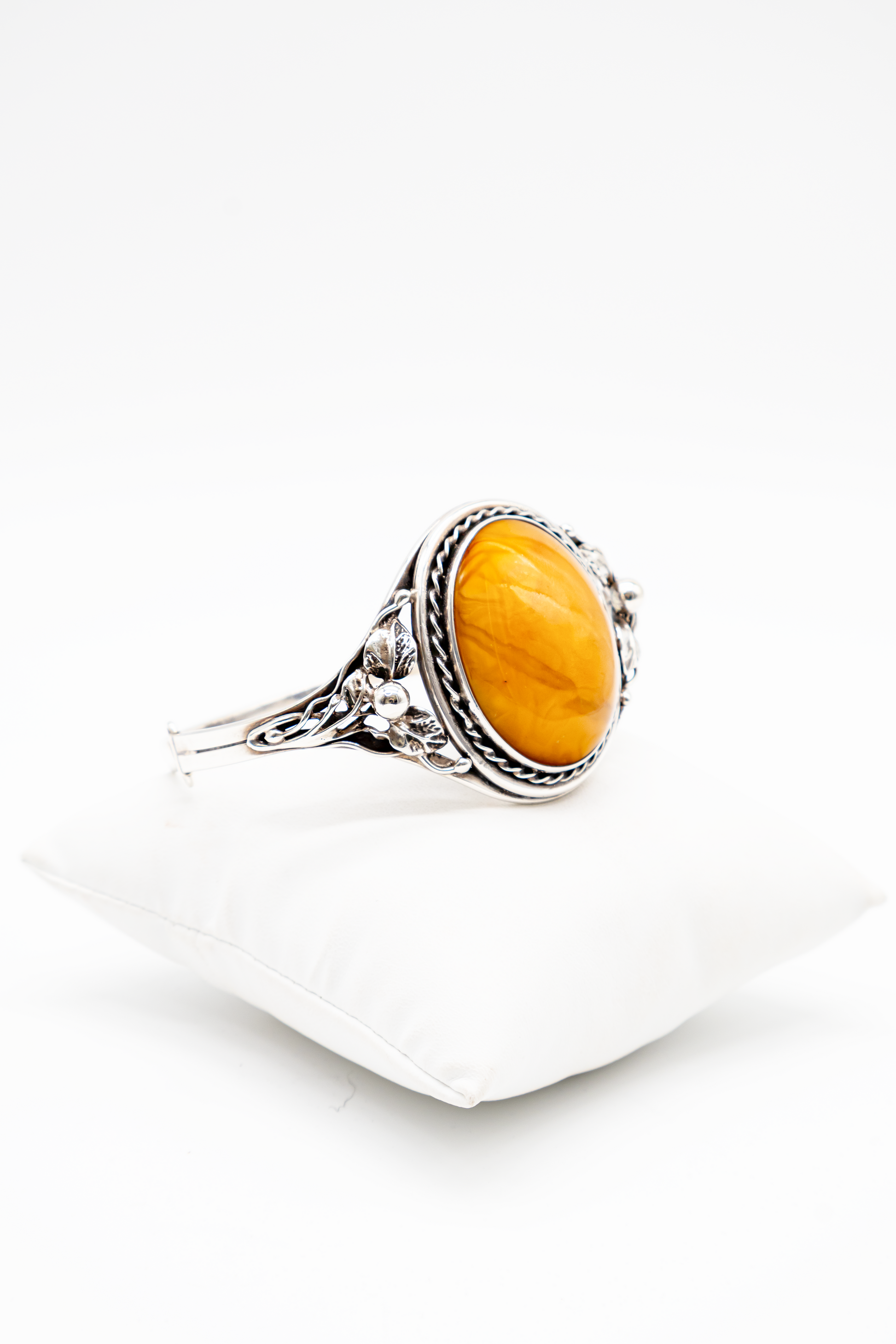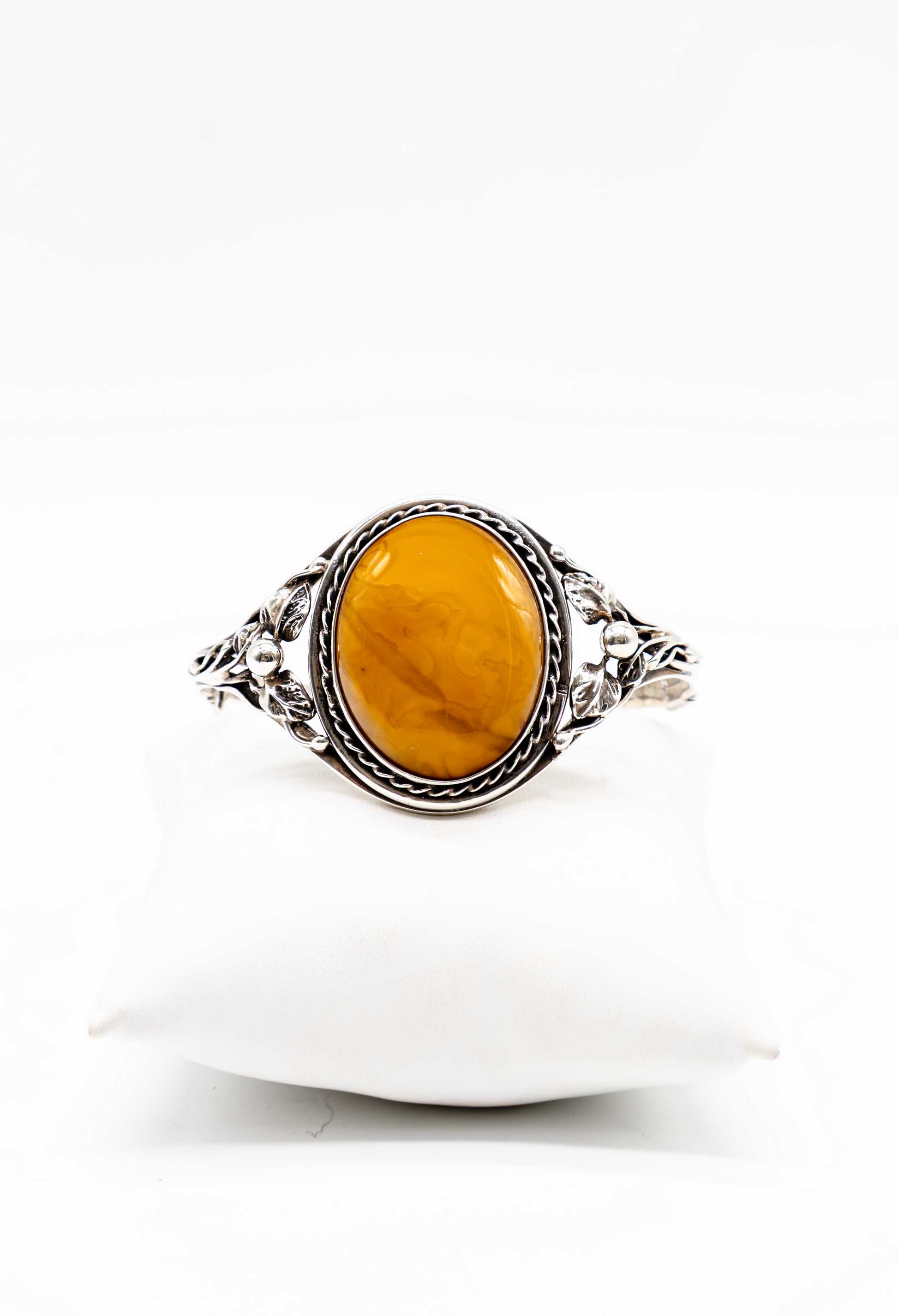 Dieser Armreif ist ein echtes Kunstwerk und ein absolutes Einzelstück. Der große honiggelbe Bernstein mit seiner warmen, samtigen Struktur zieht sofort alle Blicke auf sich. Die kunstvoll gearbeitete Silberfassung mit floralen Ornamenten unterstreicht seinen edlen Charakter und macht das Schmuckstück einzigartig – genau so ein Design findet man kein zweites Mal.