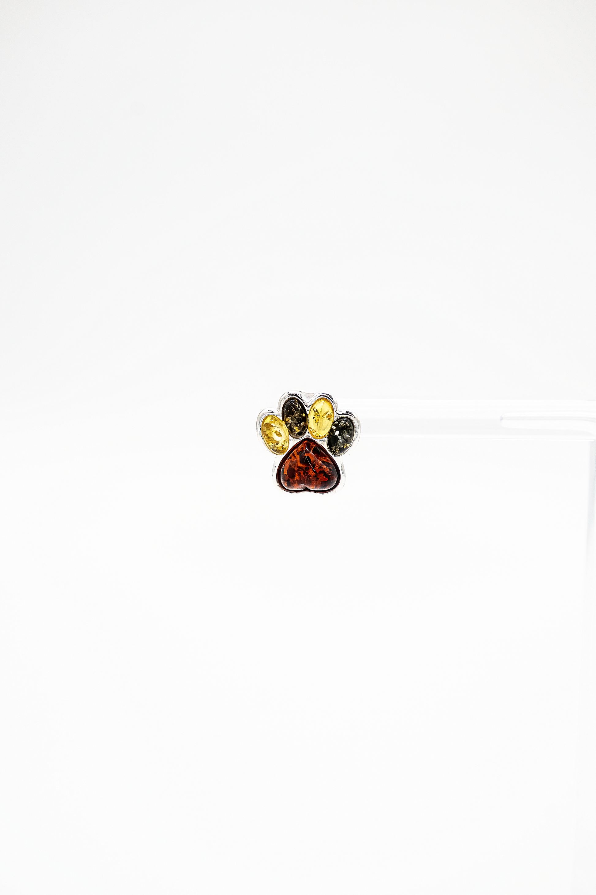 Detailed dog paw shape with genuine amber – elegant silver design for animal lovers.