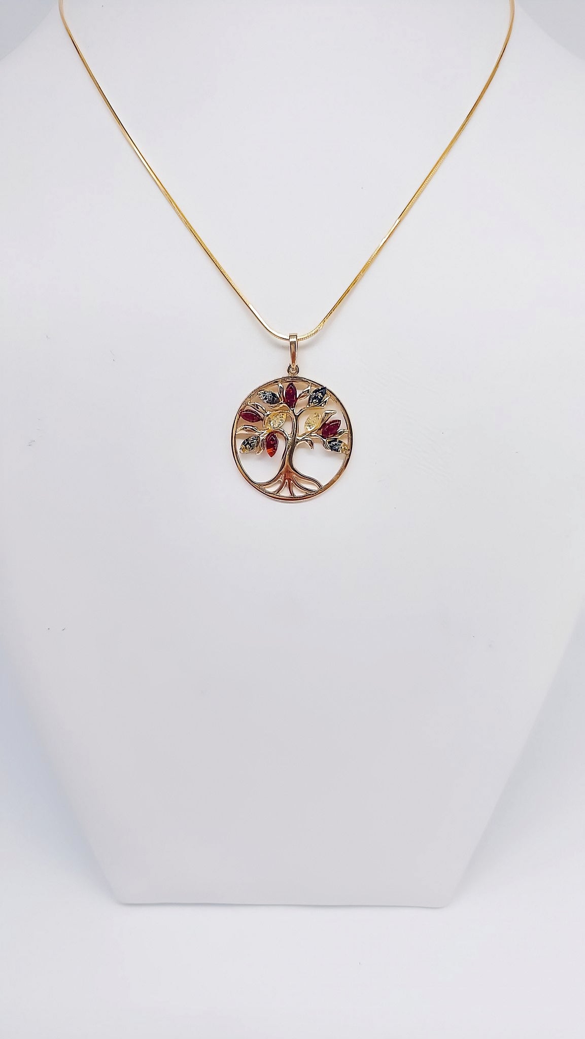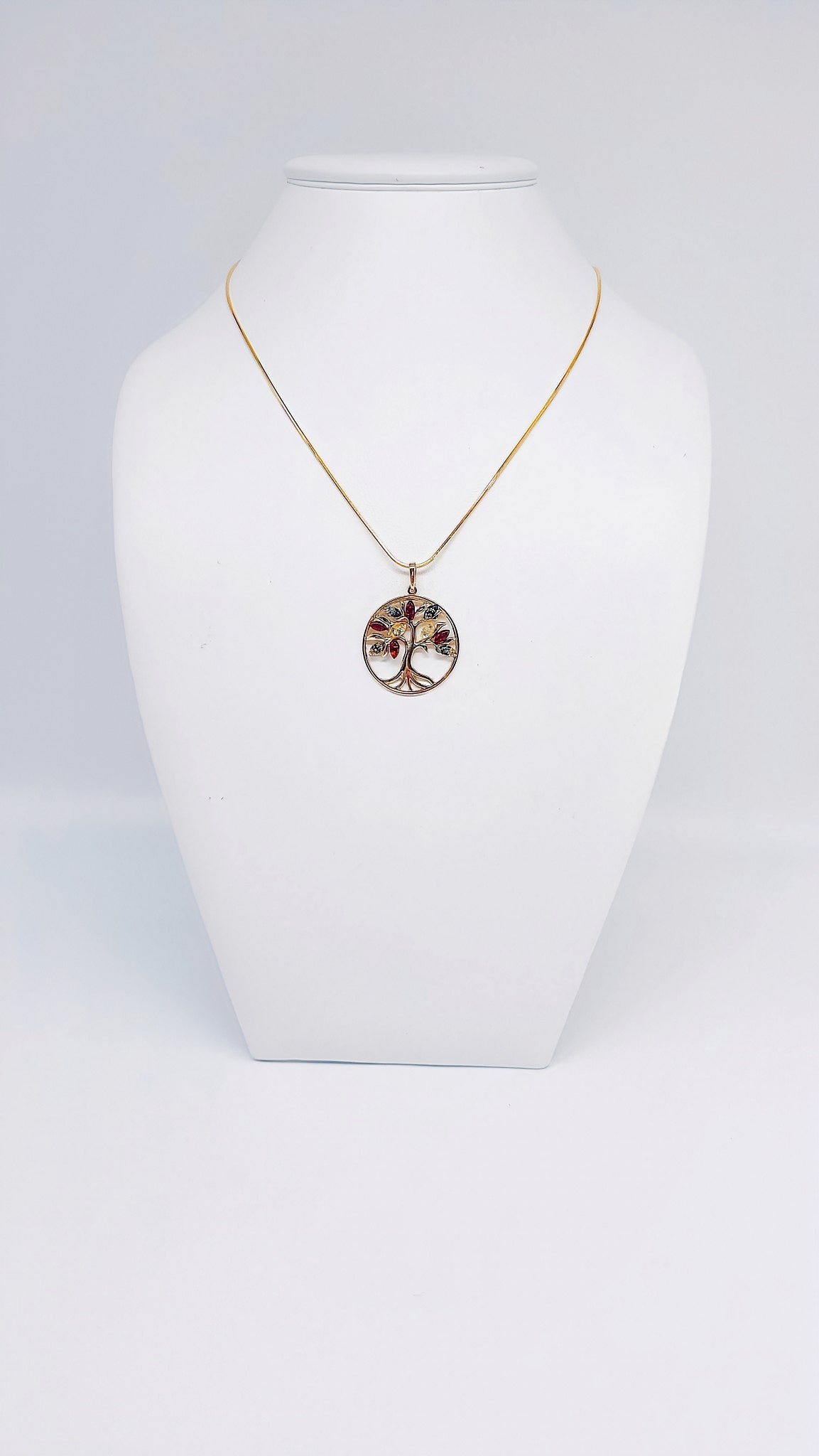 This elegant gold-plated pendant in the shape of a tree of life combines powerful symbolism with natural beauty. Crafted from high-quality materials and finely gold-plated, the 4 cm long and 3 cm wide pendant features a delicate tree of life, its crown adorned with colorful stones and genuine natural amber.