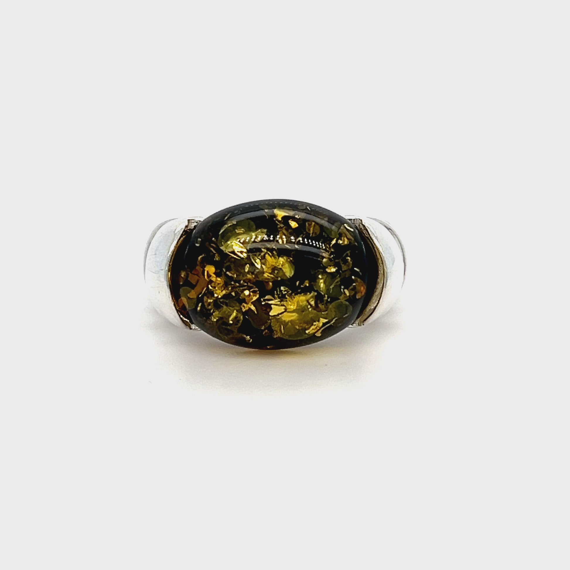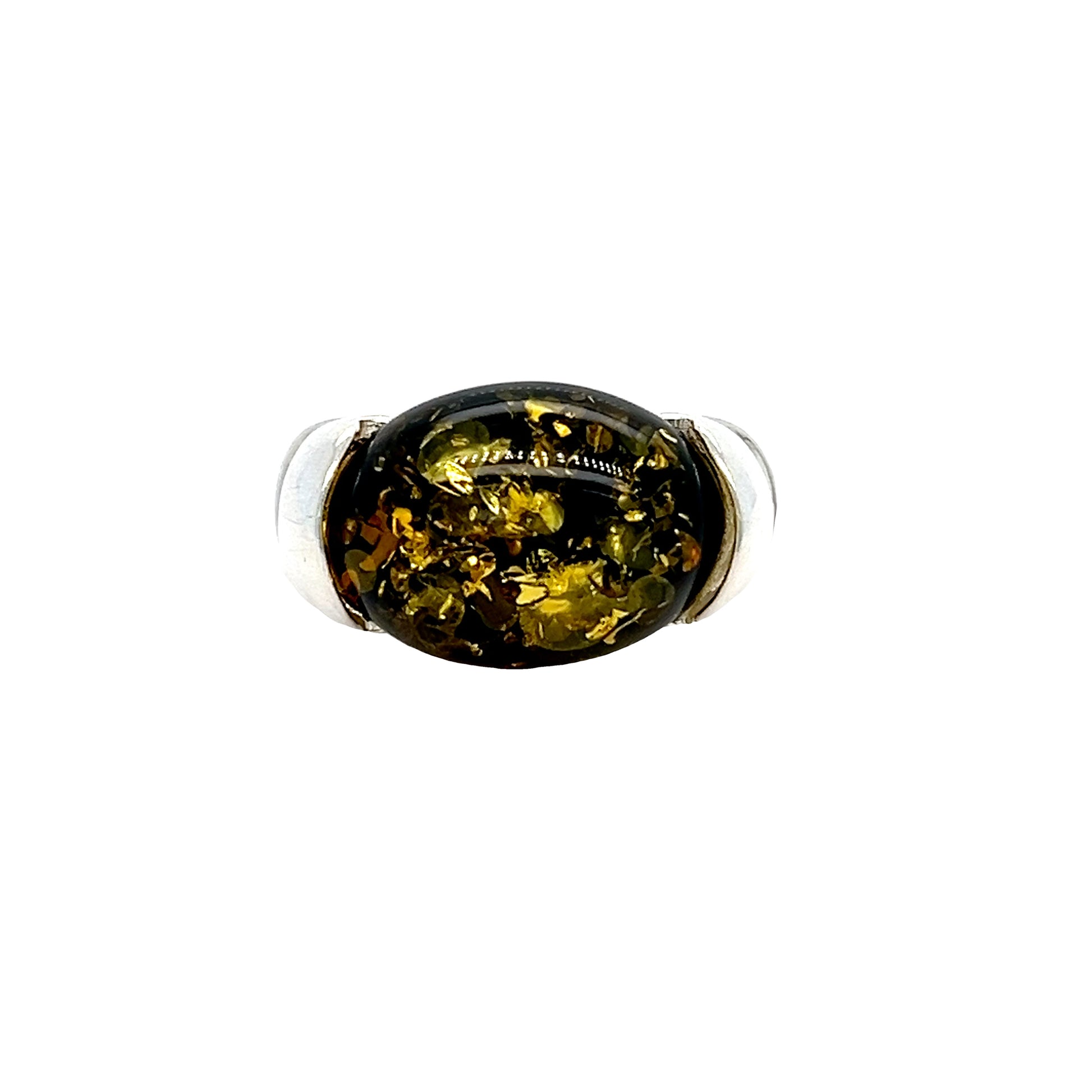 Der große grüne Bernstein verleiht dem Ring beeindruckende Tiefe und macht ihn zu einem starken, charaktervollen Statement-Schmuckstück.