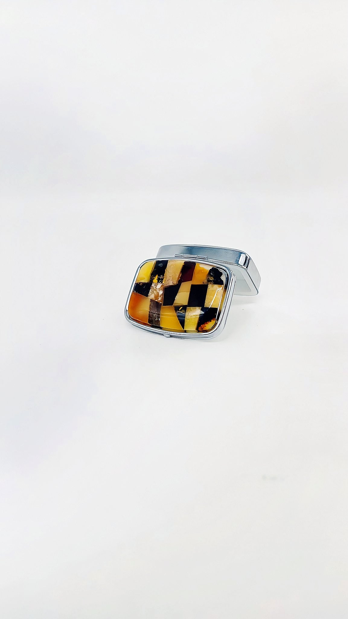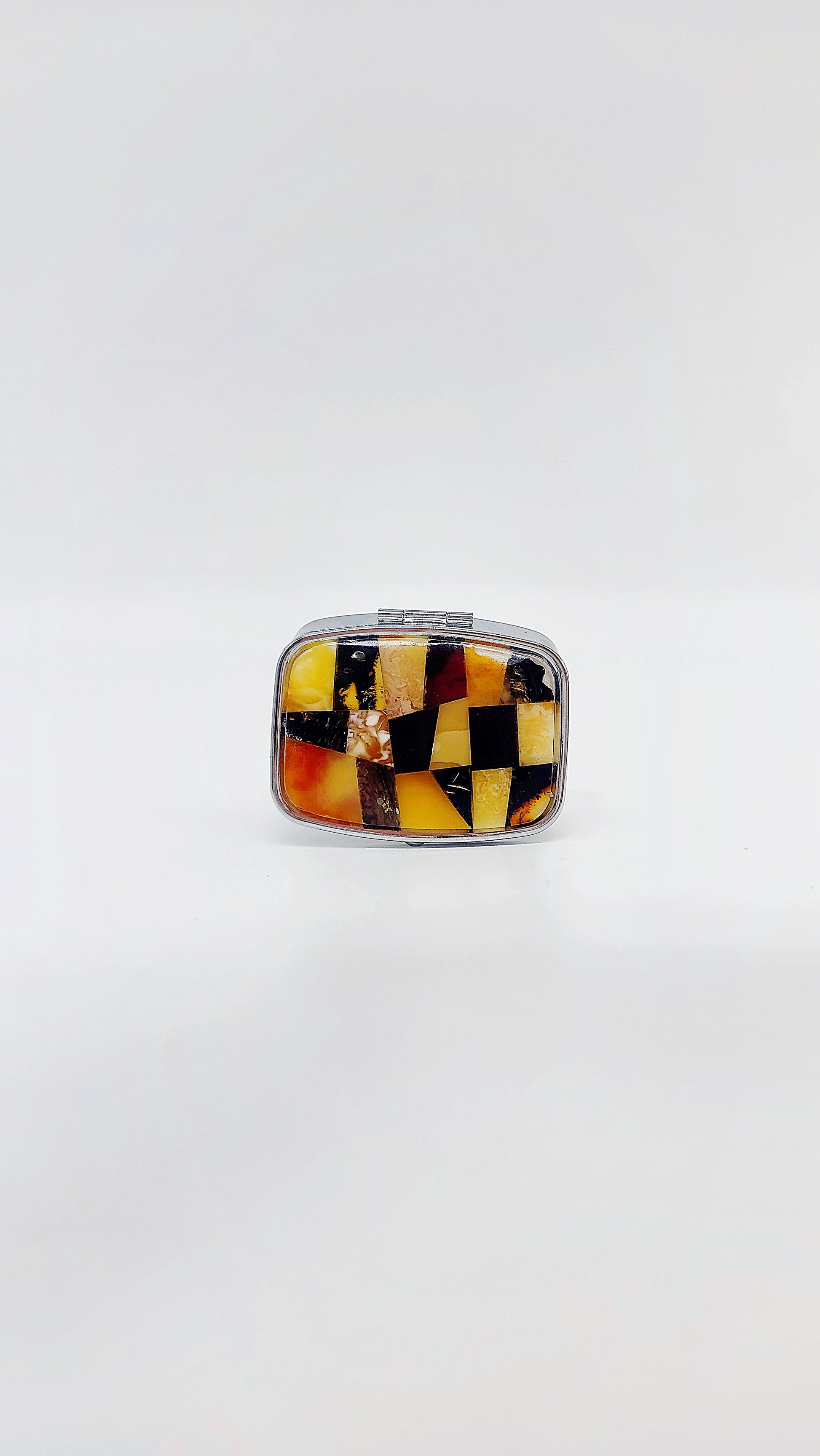 This small, square amber pill box made of stainless steel combines functionality with elegant design. The surface is decorated with an artistic mosaic of genuine natural amber , making each piece unique . The robust stainless steel body securely protects the contents and ensures long-lasting use.