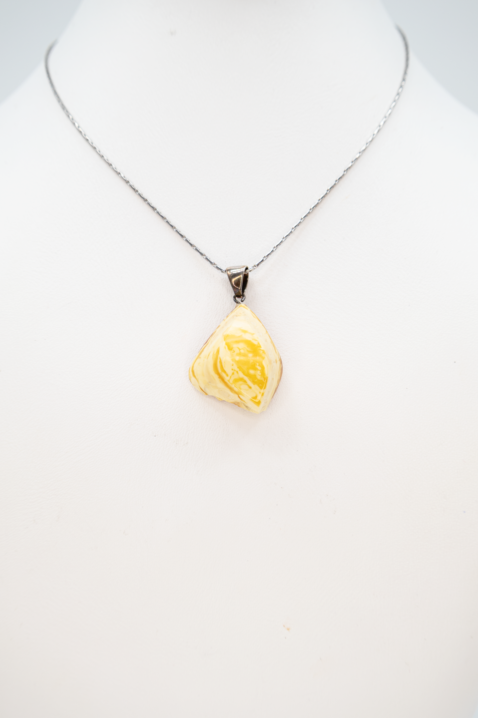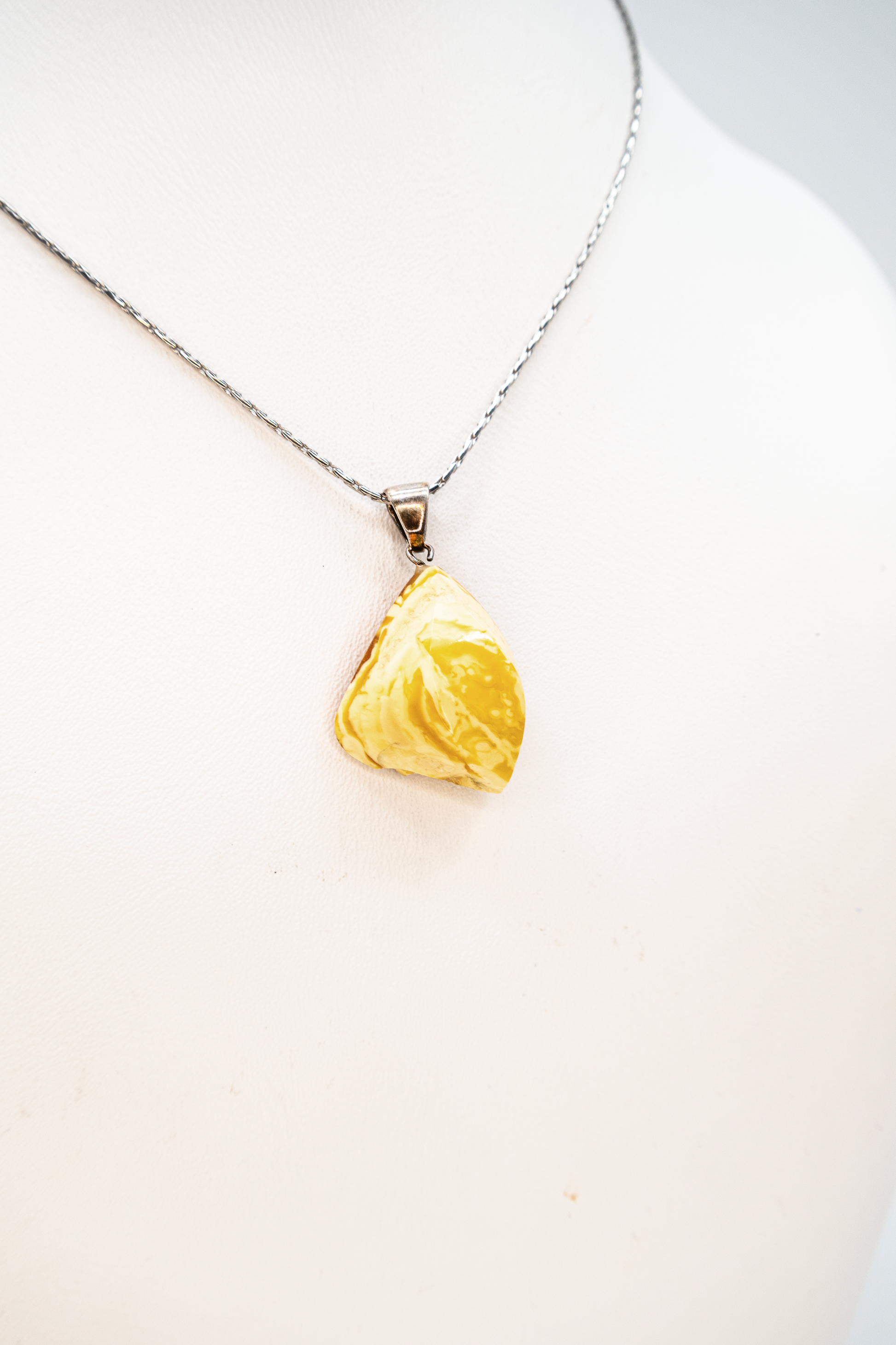 This handcrafted amber pendant combines naturalness with timeless elegance. The amber, in a soft yellow tone with a fine grain, measures approximately 3.6 × 2.5 × 1.3 cm and is held in a simple silver setting that subtly emphasizes its natural beauty. Crafted from genuine amber and high-quality 925 sterling silver, each piece is unique, captivating with its individual shape and color. Thanks to its compact size, the pendant is ideal for everyday wear, but can also be stylishly combined for special occasions. The unisex design makes it versatile and wearable – for both women and men. A perfect gift for a wife, sister, girlfriend, or partner that combines elegance and individuality.