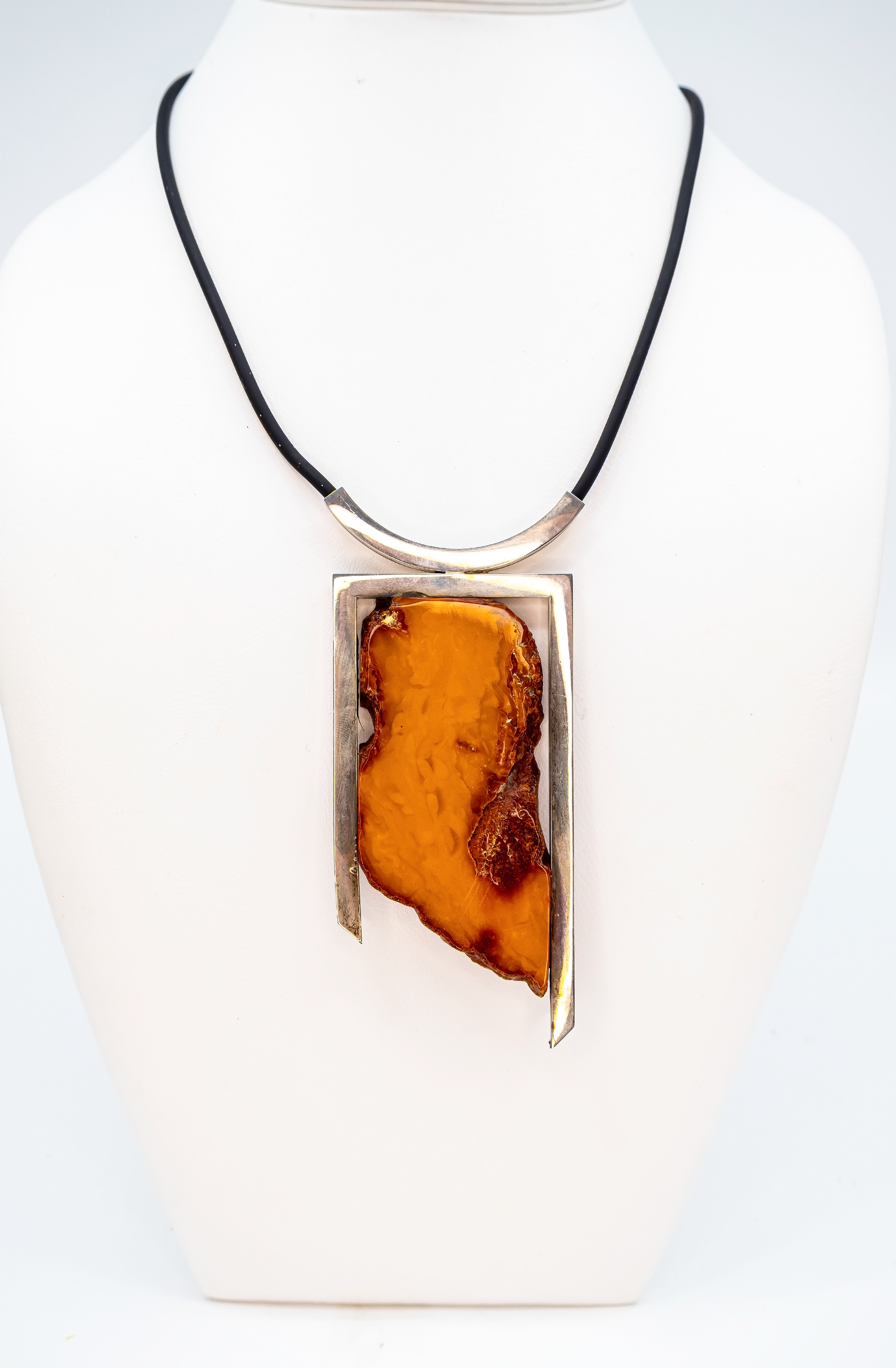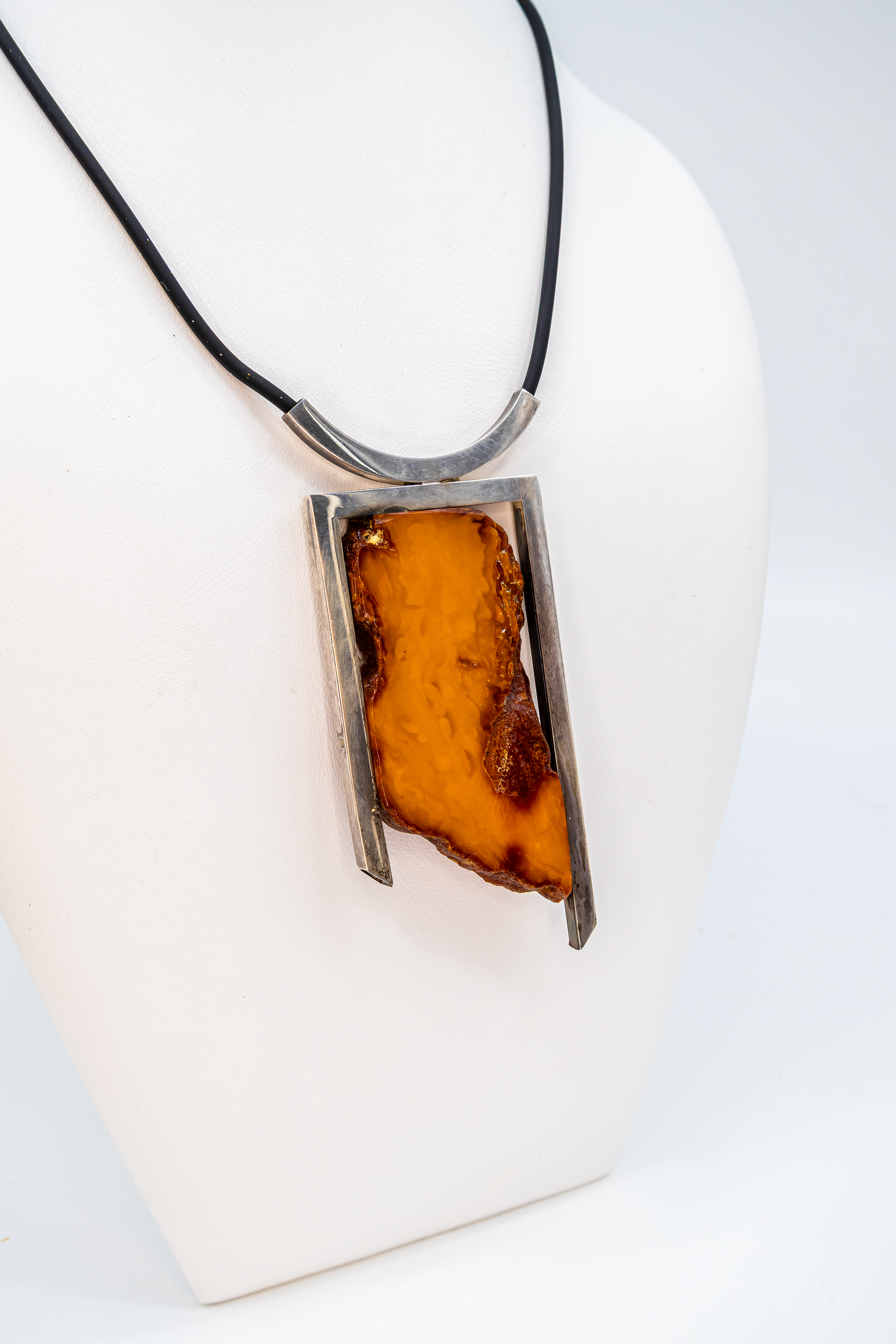 A unique, handcrafted piece of jewelry that combines a modern silver frame with a large amber stone and a stylish rubber chain.