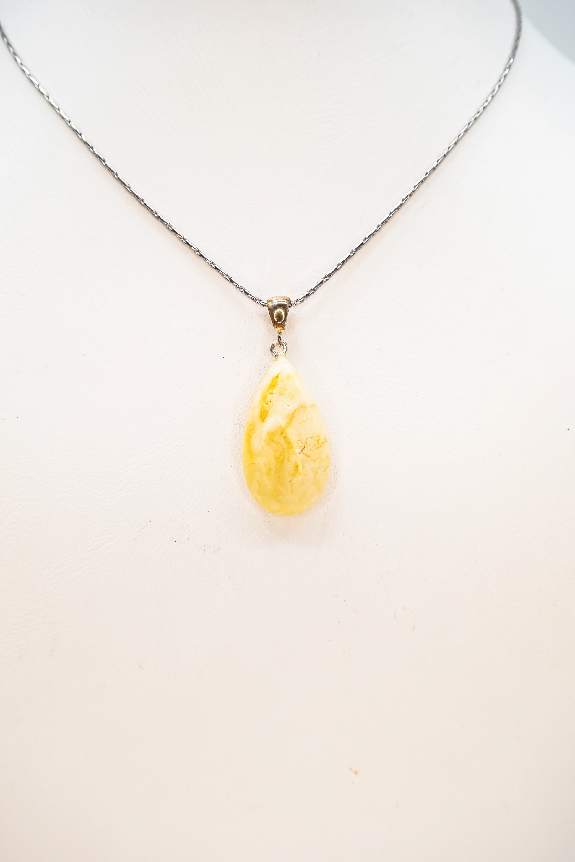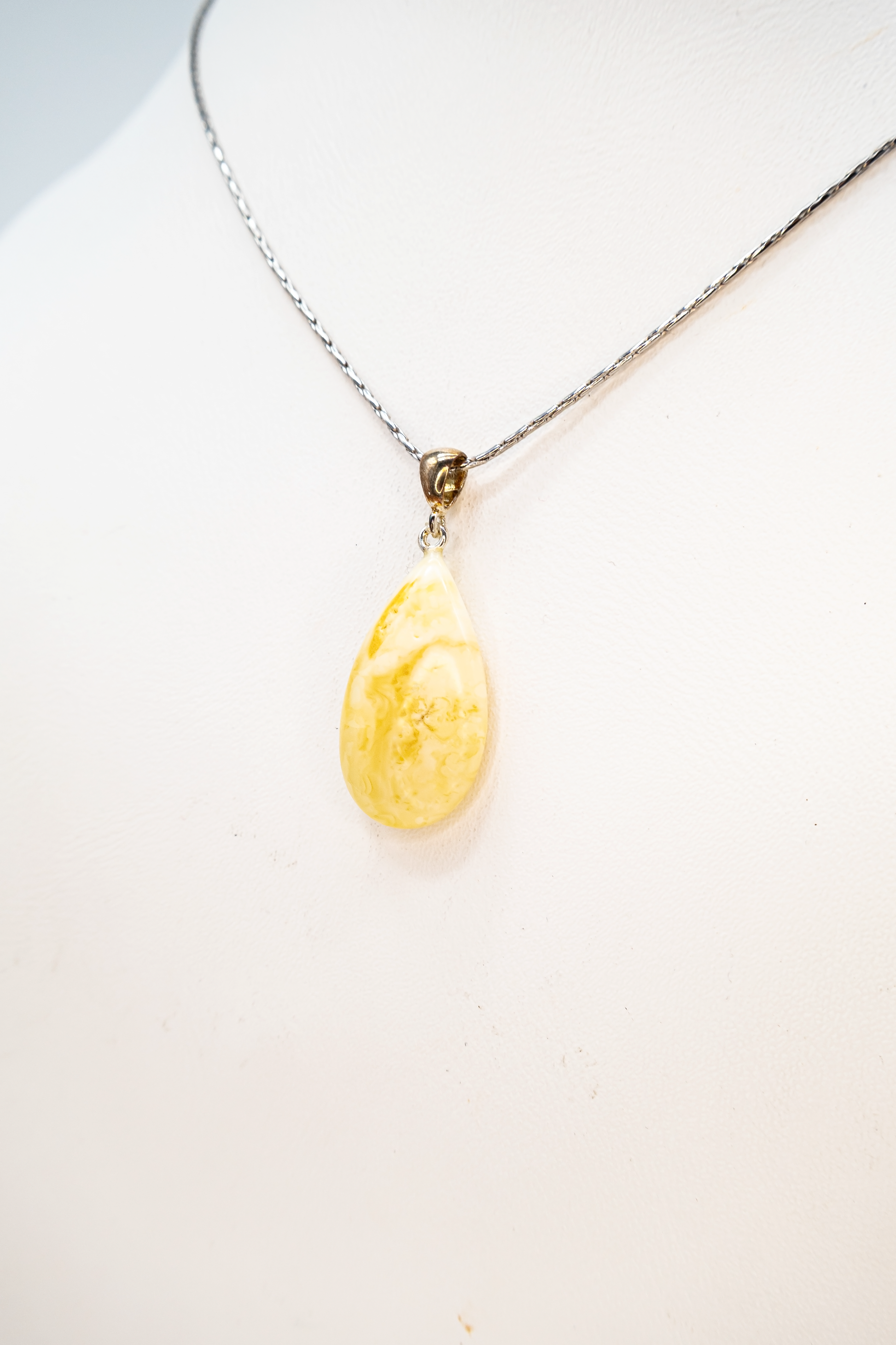 This elegant amber pendant in a classic teardrop shape exudes timeless beauty. The amber, in delicate yellow and cream shades, measures approximately 4 × 1.7 × 0.6 cm and captivates with its fine grain and harmonious color gradients. Set in a subtle silver frame, the stone's natural radiance is perfectly emphasized. Crafted from genuine amber and high-quality 925 sterling silver, each pendant is handcrafted and unique. The teardrop design gives the piece an elegant yet modern touch, perfect for everyday wear and special occasions. Thanks to its unisex nature, it is equally suitable for men and women. An exclusive accessory that also makes an excellent gift for a wife, sister, girlfriend, or partner.